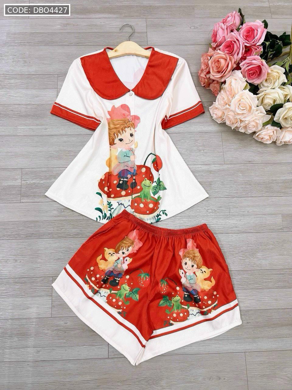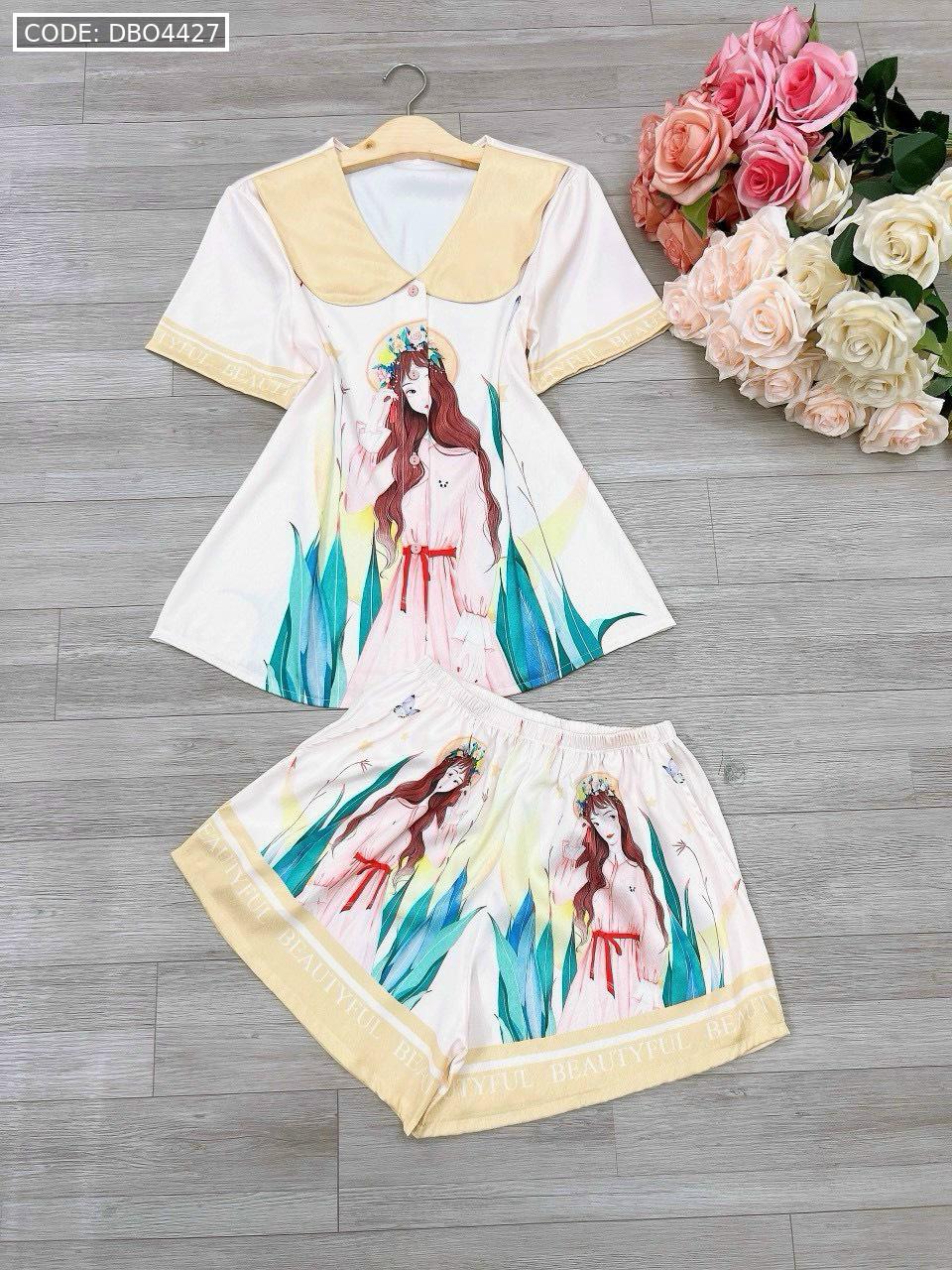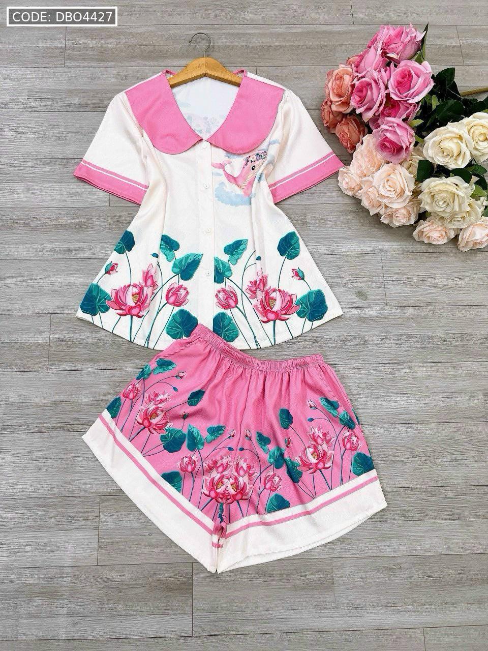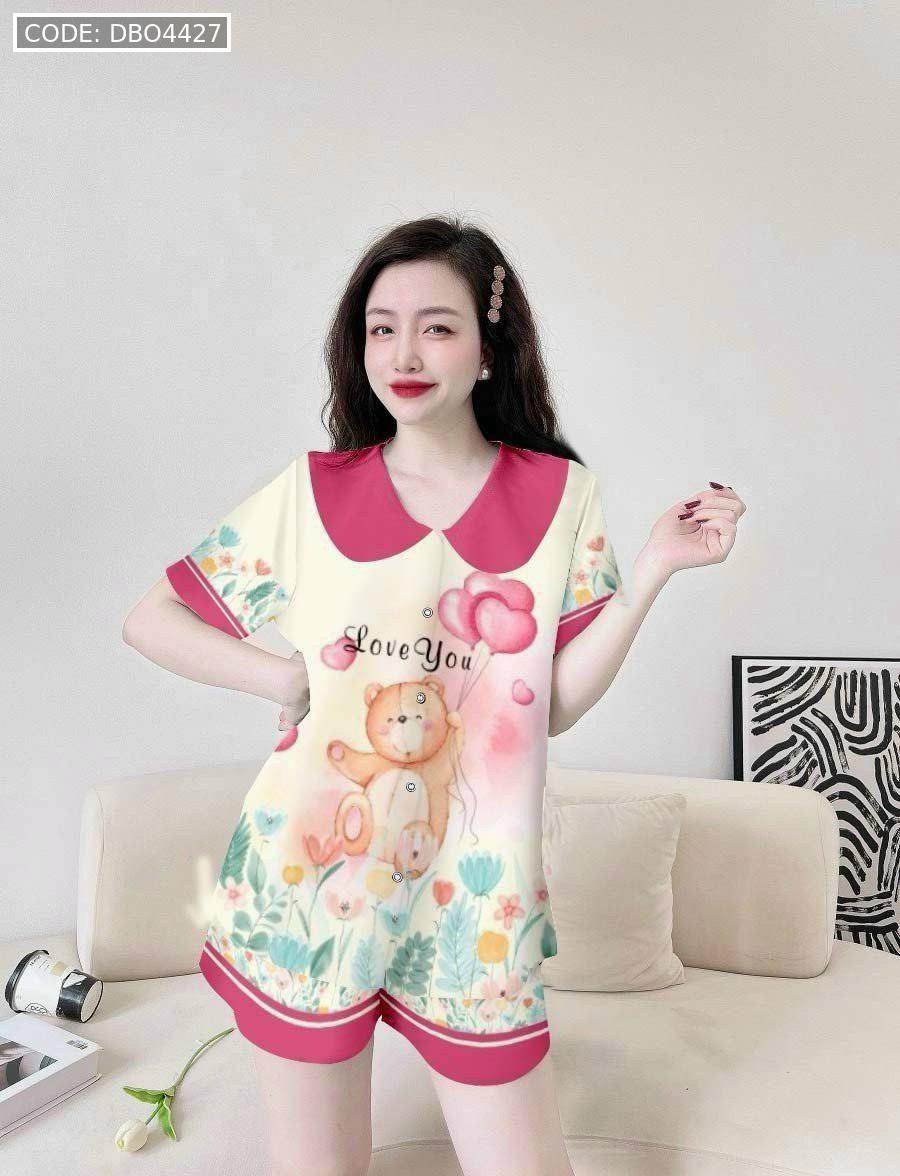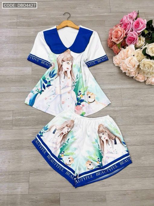 Đồ bộ satin mặc nhà quần đùi áo tay ngắn cổ bẻ hoạ tiết dể thương