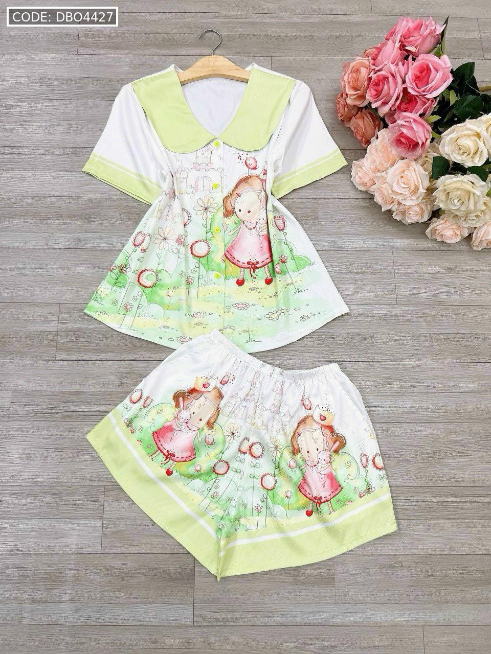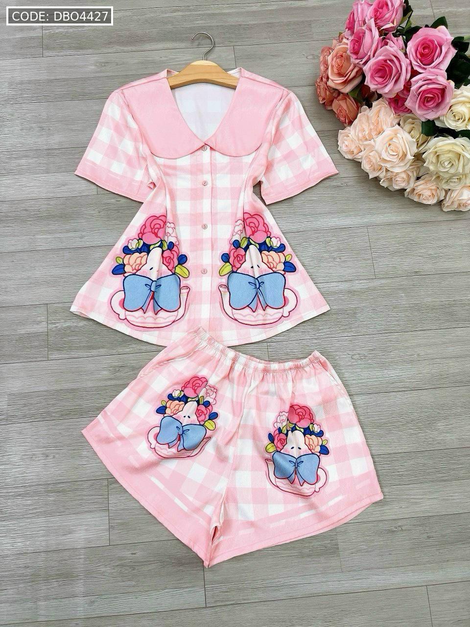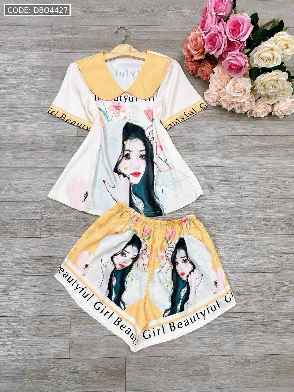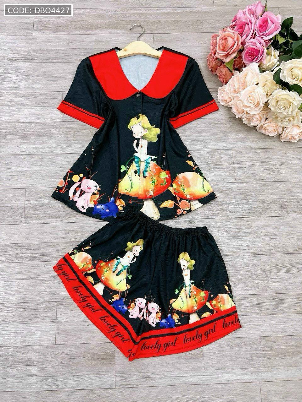 Đồ bộ satin mặc nhà quần đùi áo tay ngắn cổ bẻ hoạ tiết dể thương