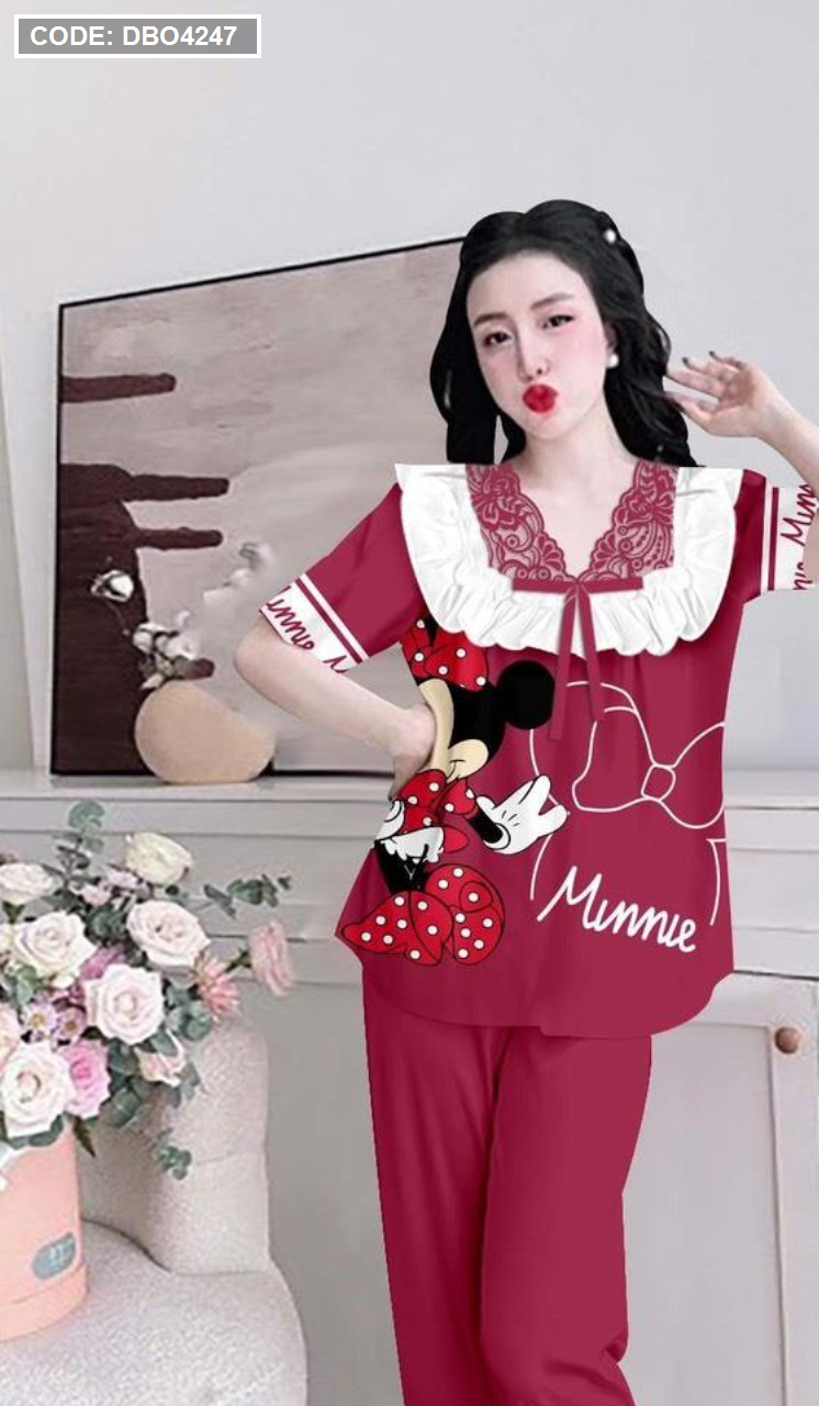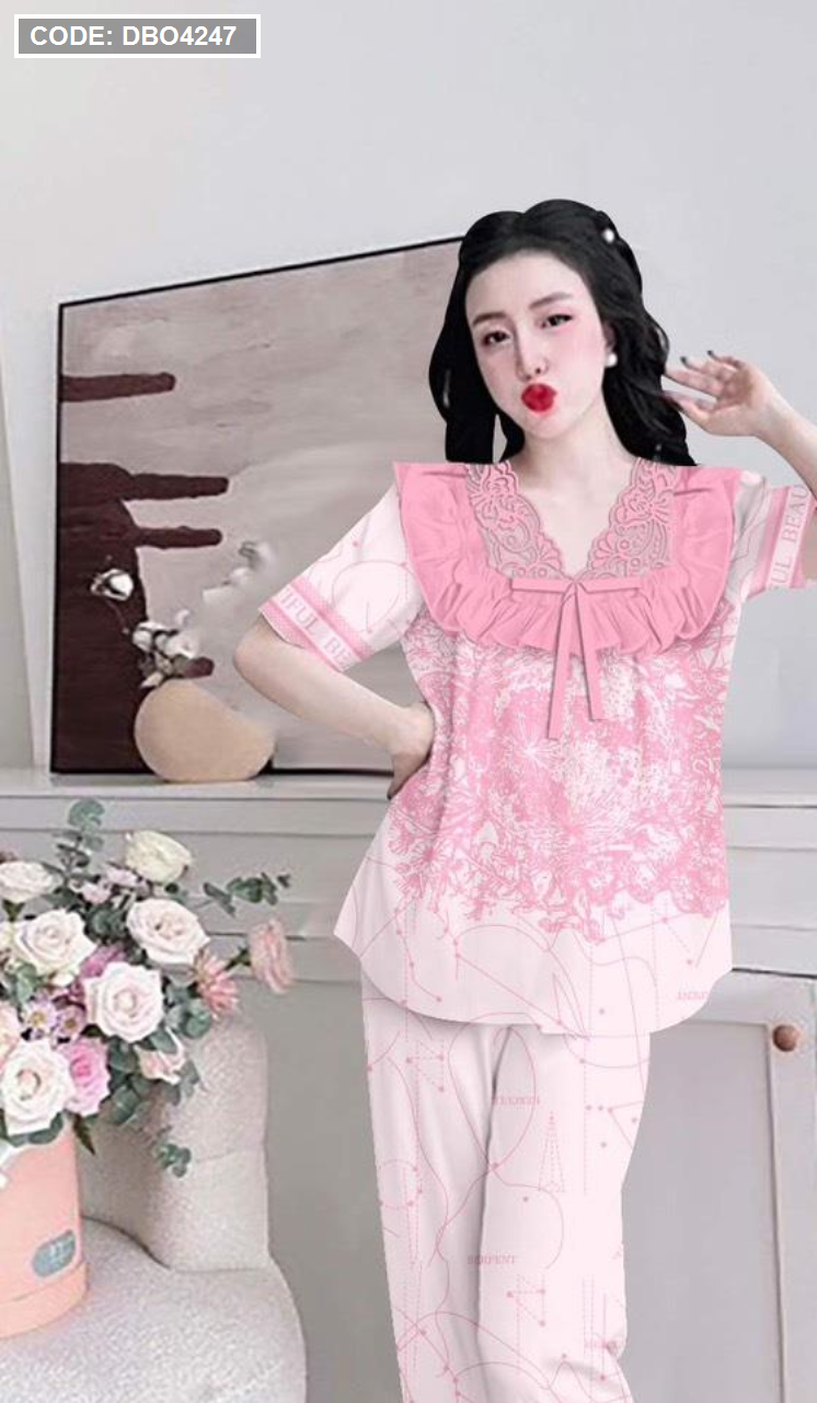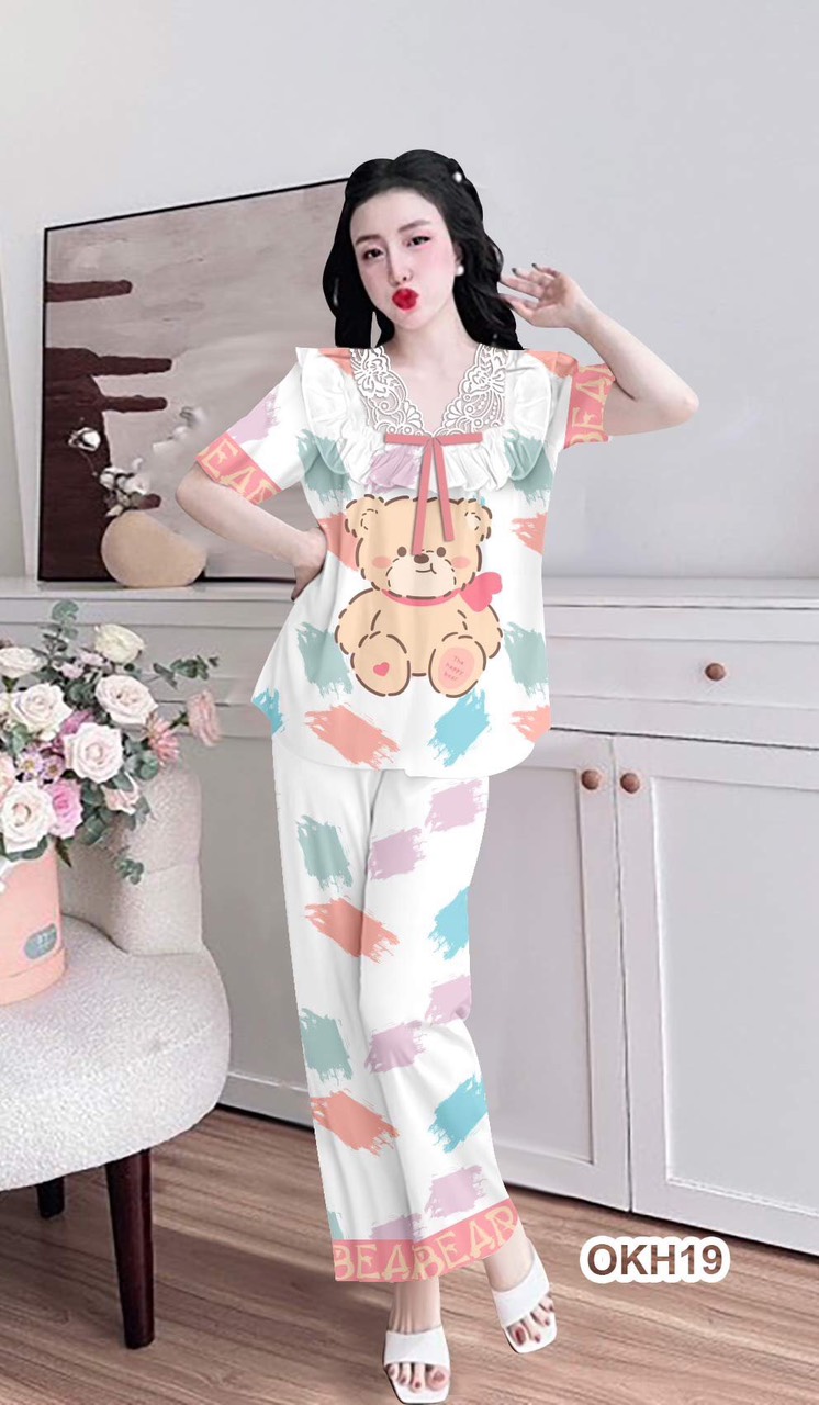 Đồ bộ satin mềm mịn quần dài tay ngắn cổ viền ren in hình