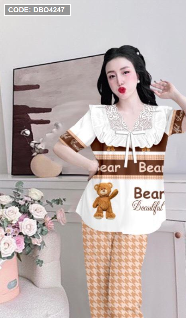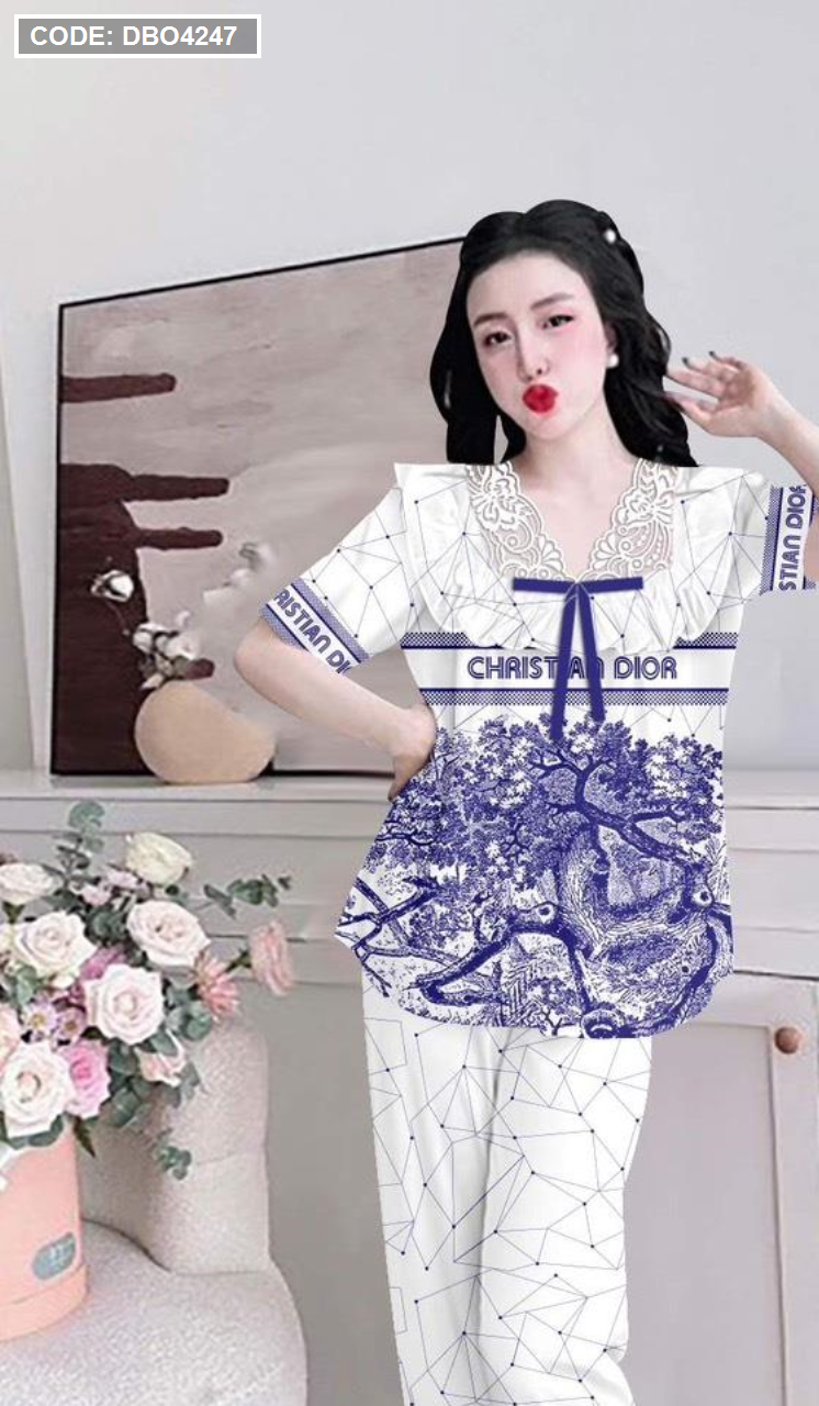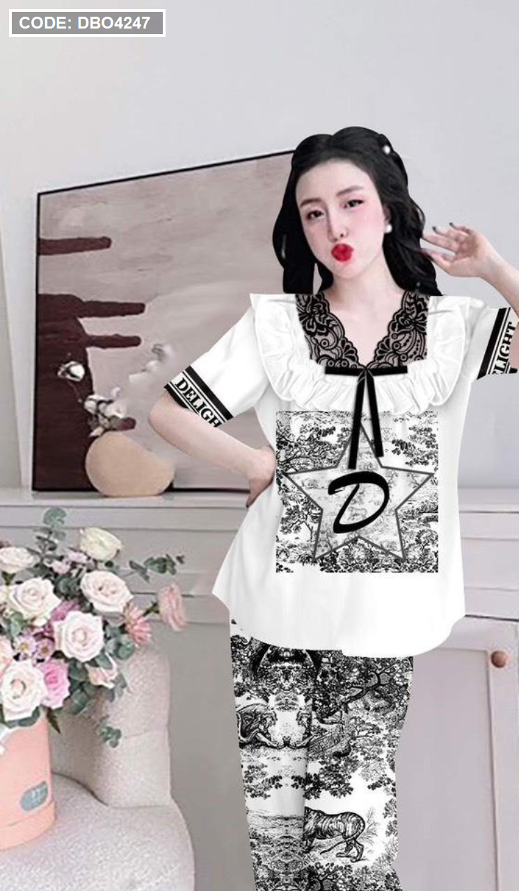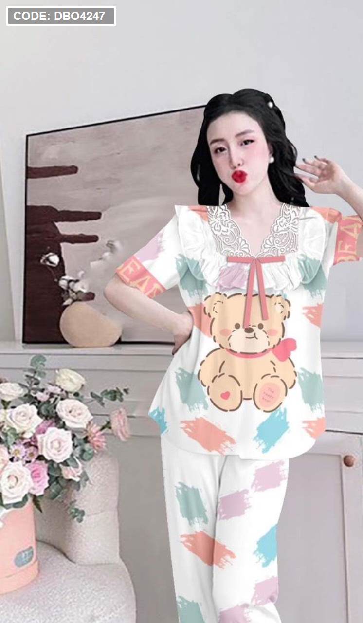 Đồ bộ satin mềm mịn quần dài tay ngắn cổ viền ren in hình