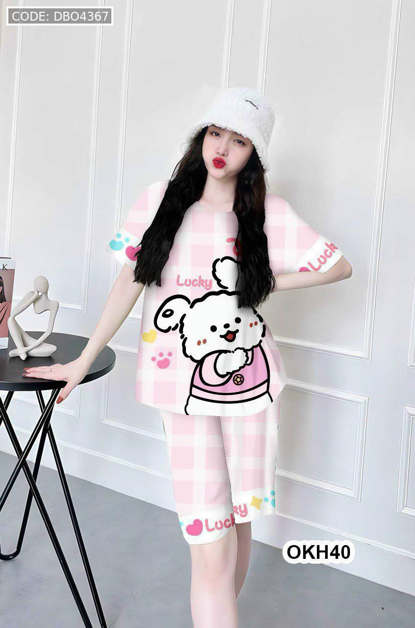 Đồ bộ satin quần lững áo cổ tròn in hình dể thương