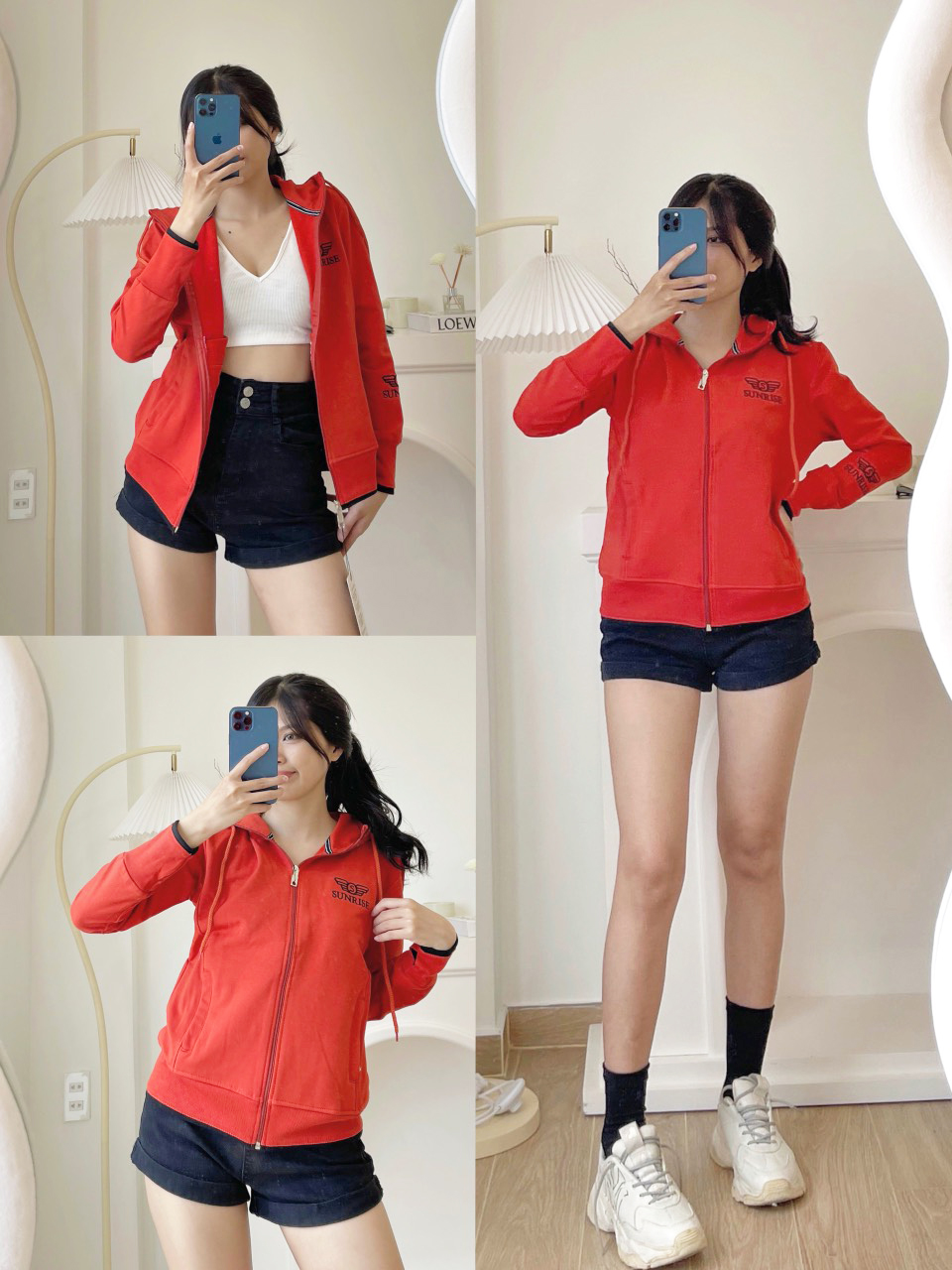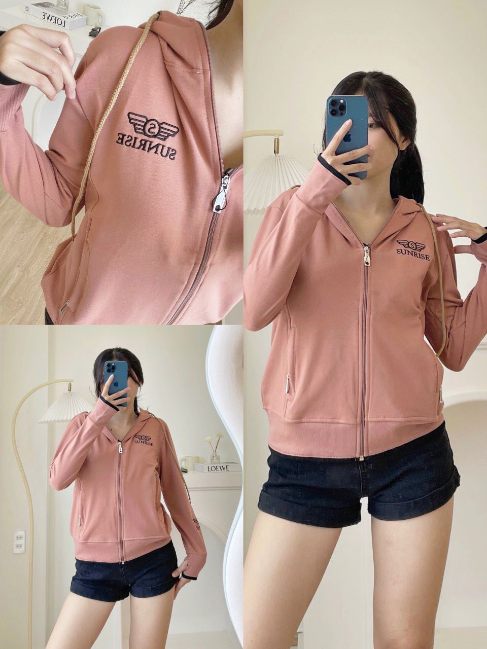 Tay dài xỏ ngón, 2 túi ngoài, túi trong , thun dày che nắng tốt, nón rộng