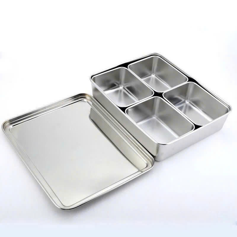 Giá sỉ bộ Khay Gia Vị – Khay Đựng Topping Trà Sữa Inox 304 4 Ngăn Có Nắp Đậy 30x23x6cm