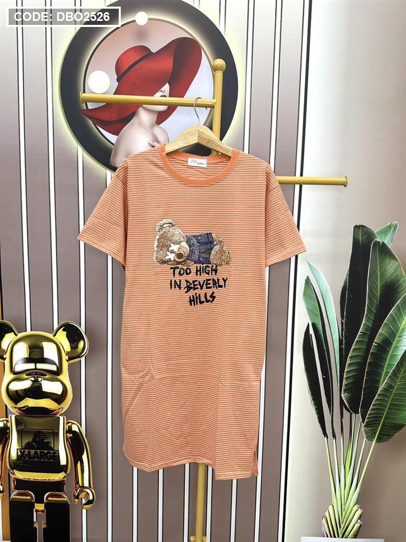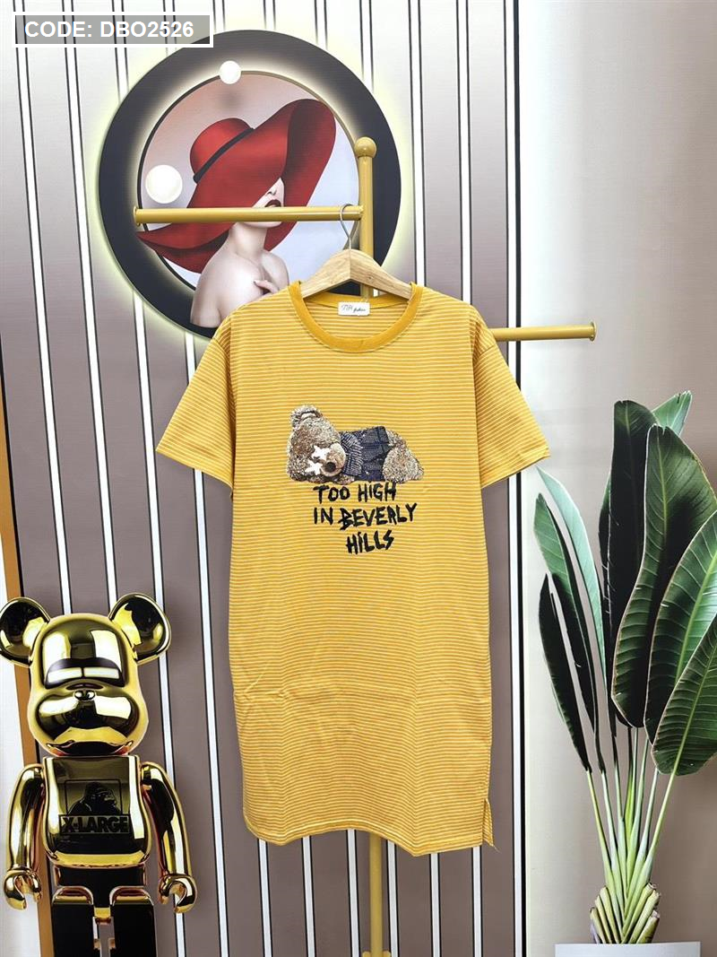 Giá sỉ đầm form suông sọc tay ngắn có túi in hình gấu