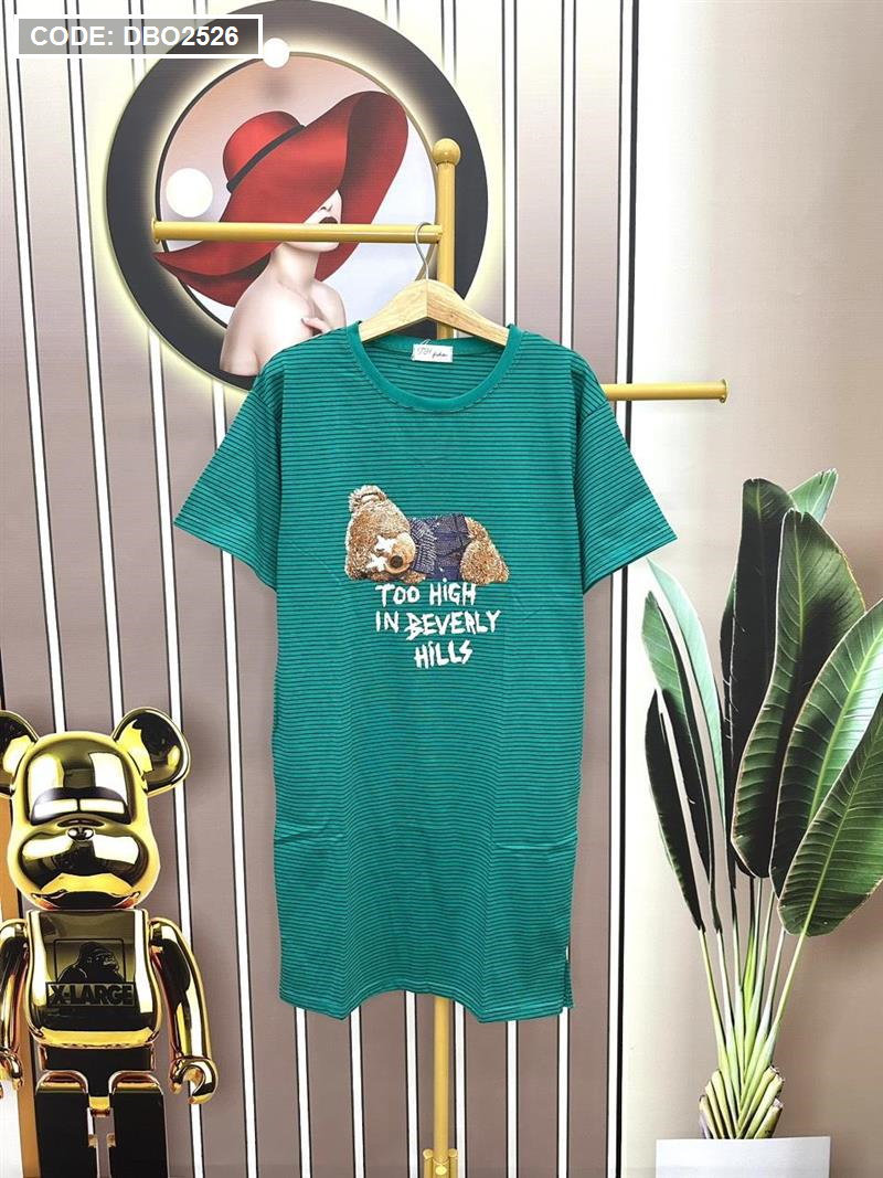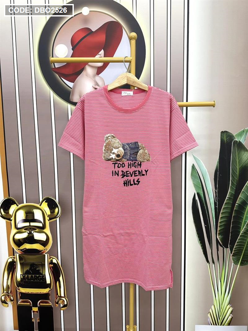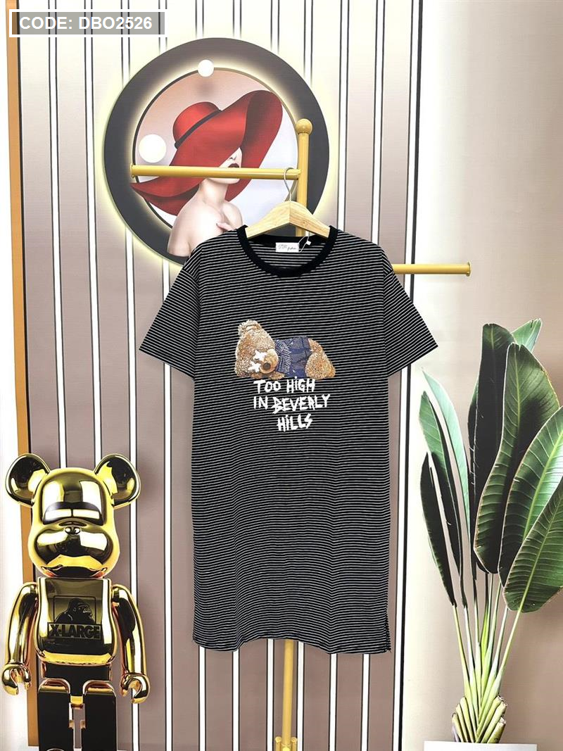 Đầm form suông sọc tay ngắn có túi in hình gấu