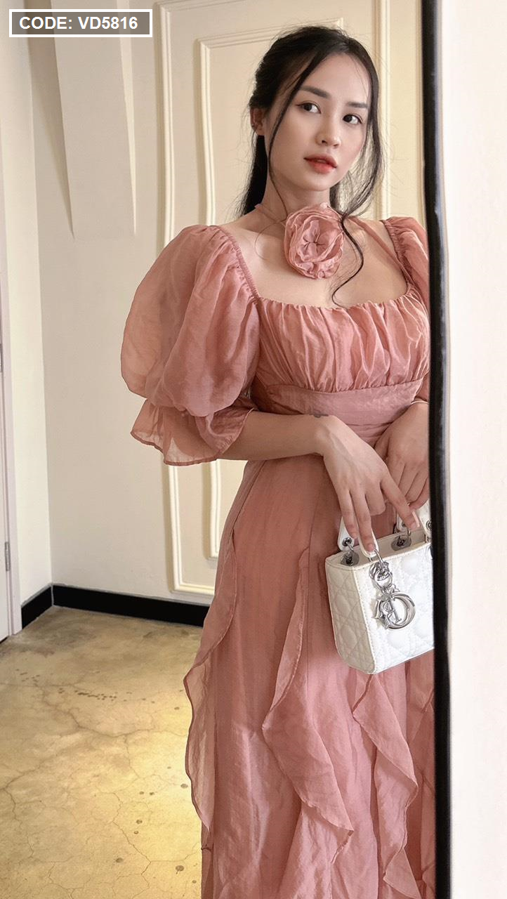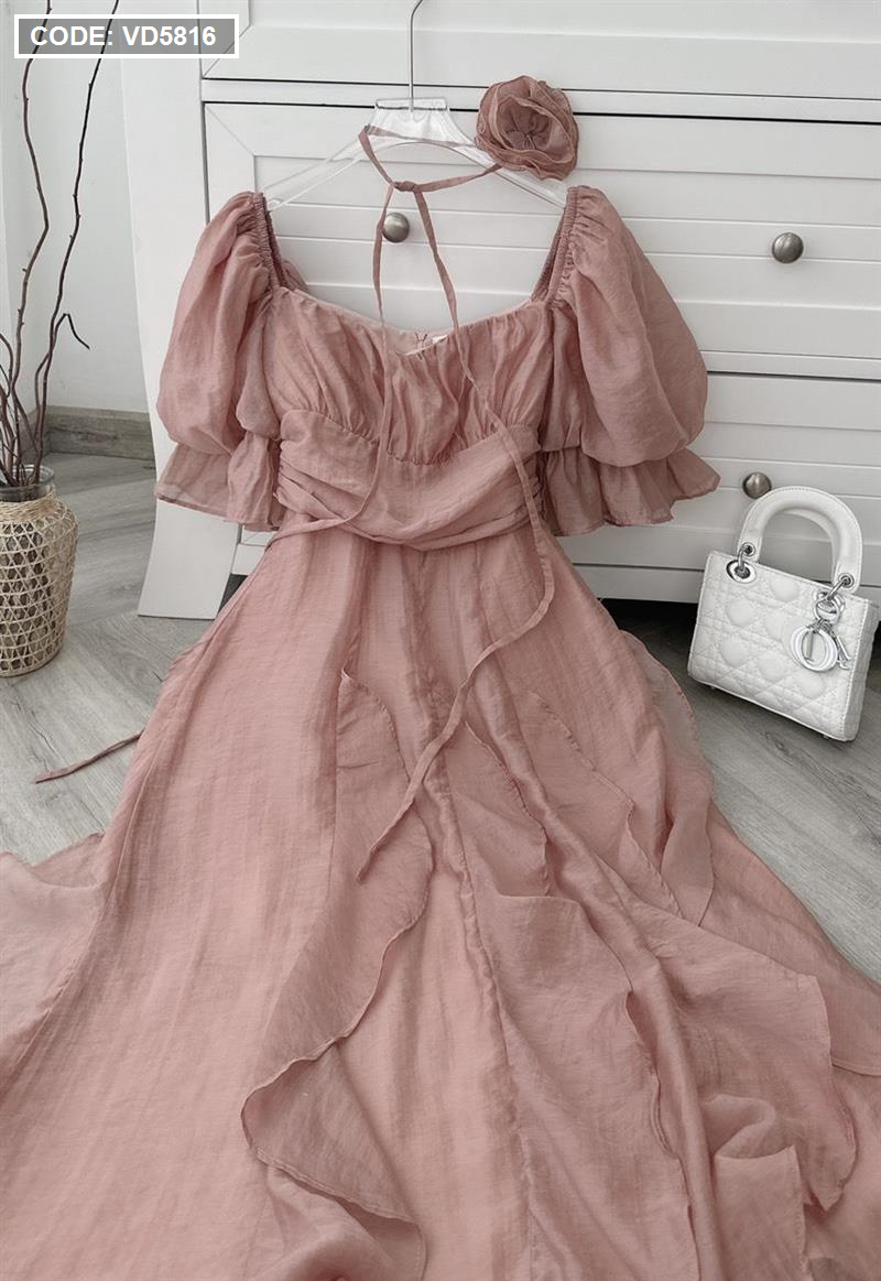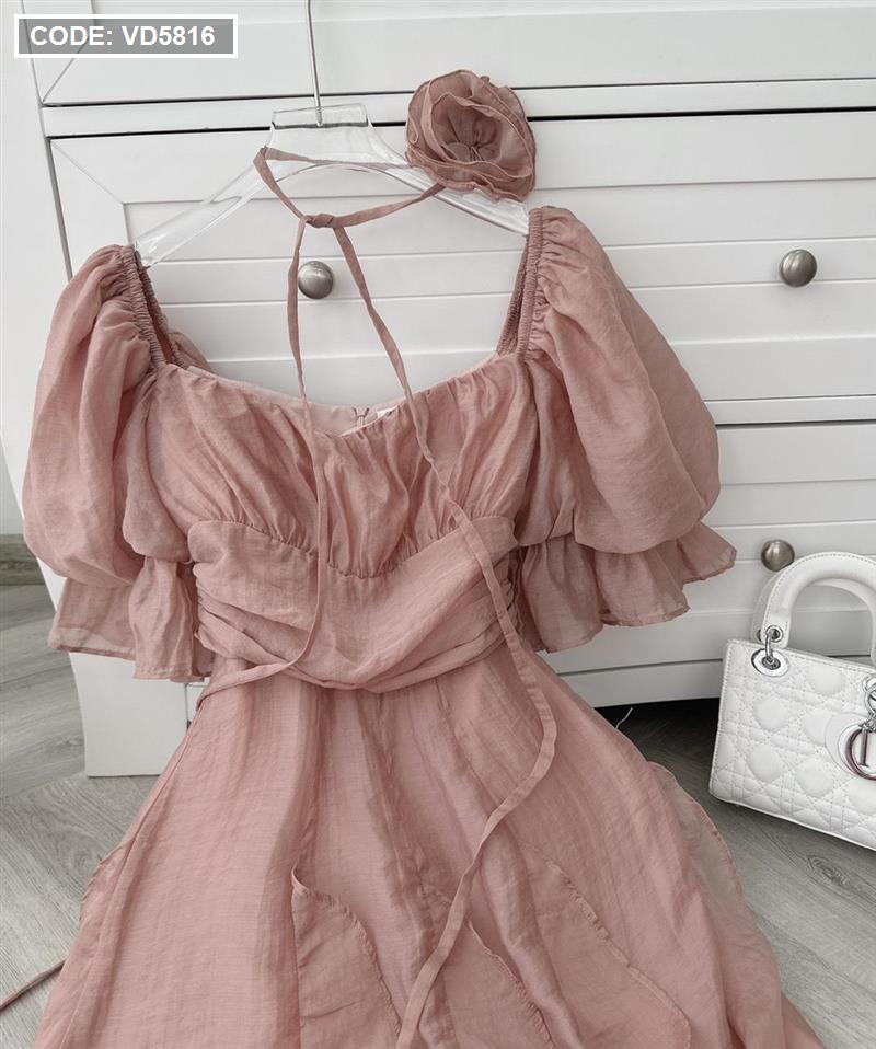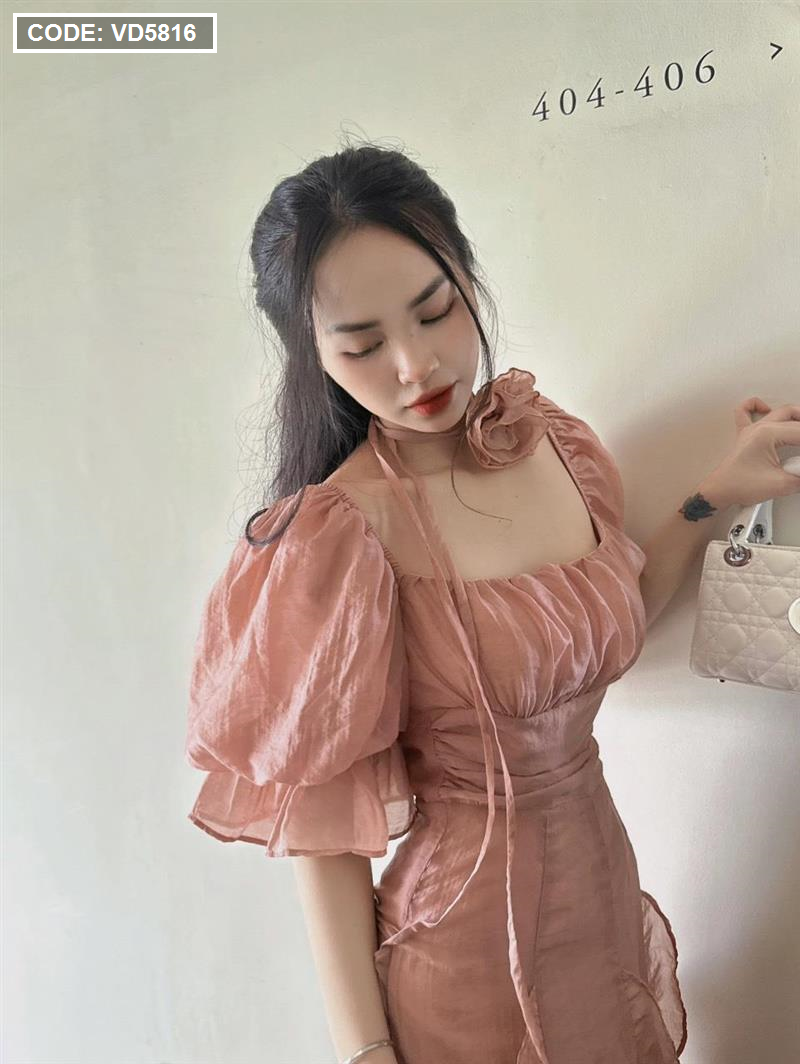 Giá sỉ đầm midi hồng trễ vai viền bèo chocker cổ
