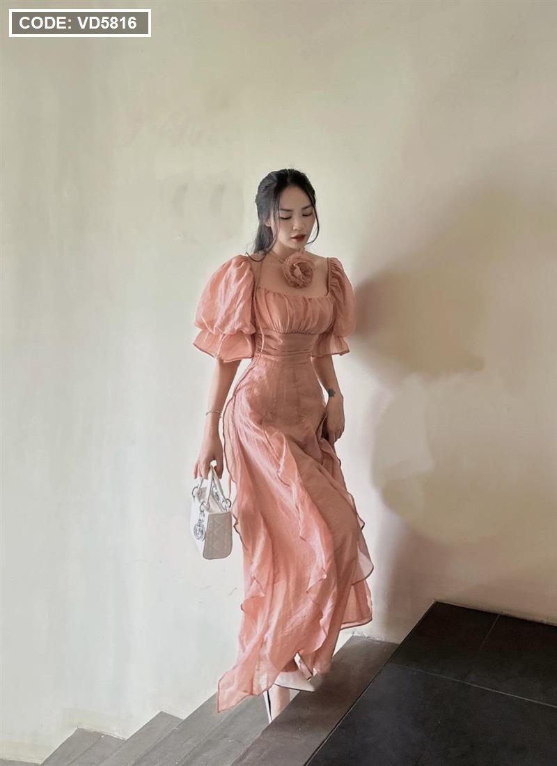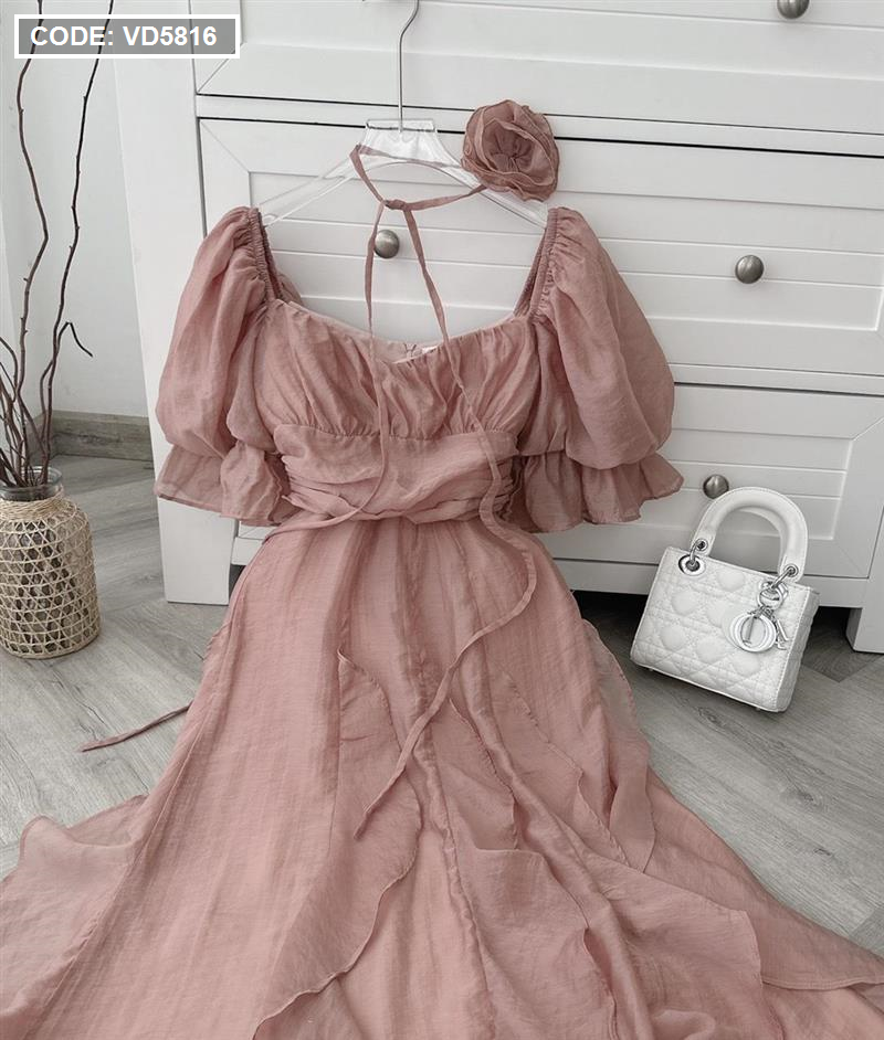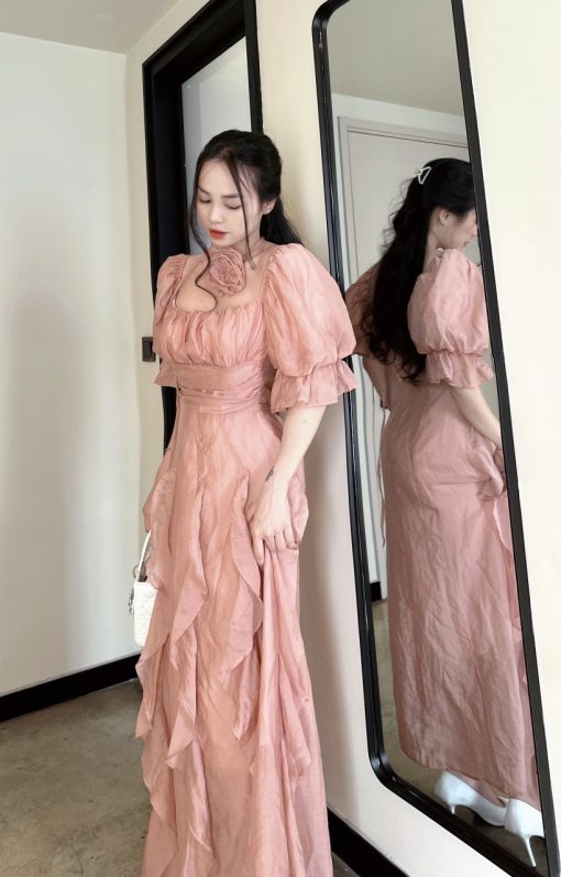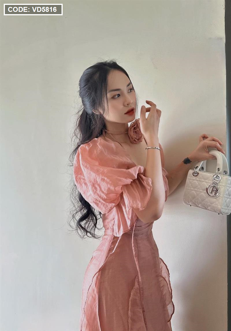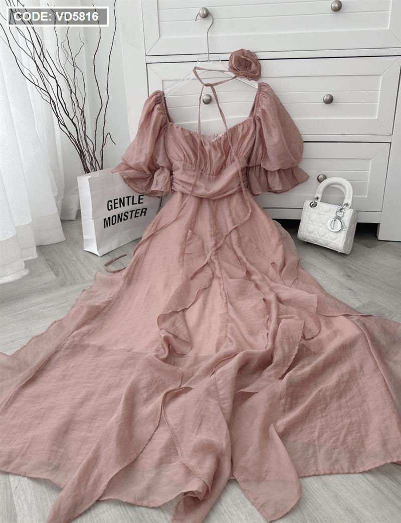Giá sỉ đầm midi hồng trễ vai viền bèo chocker cổ