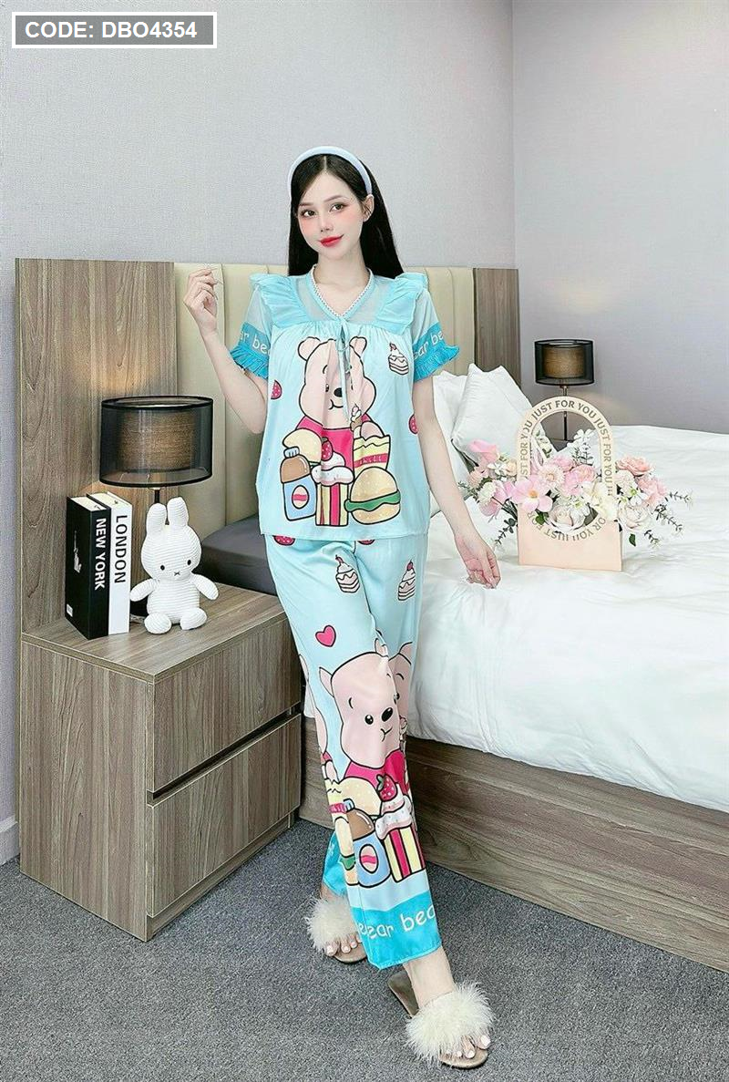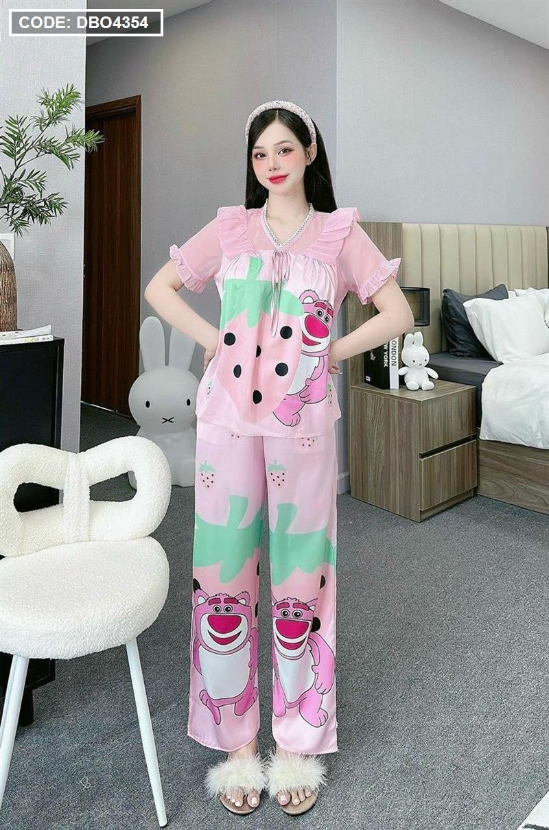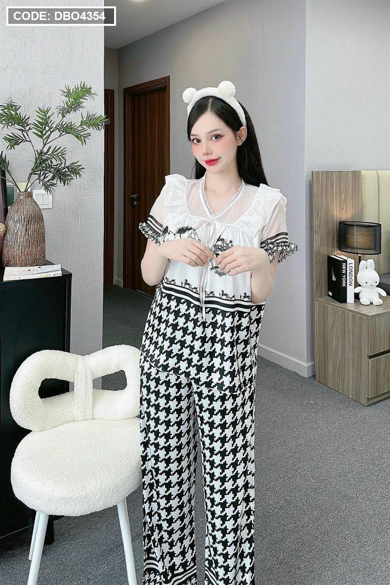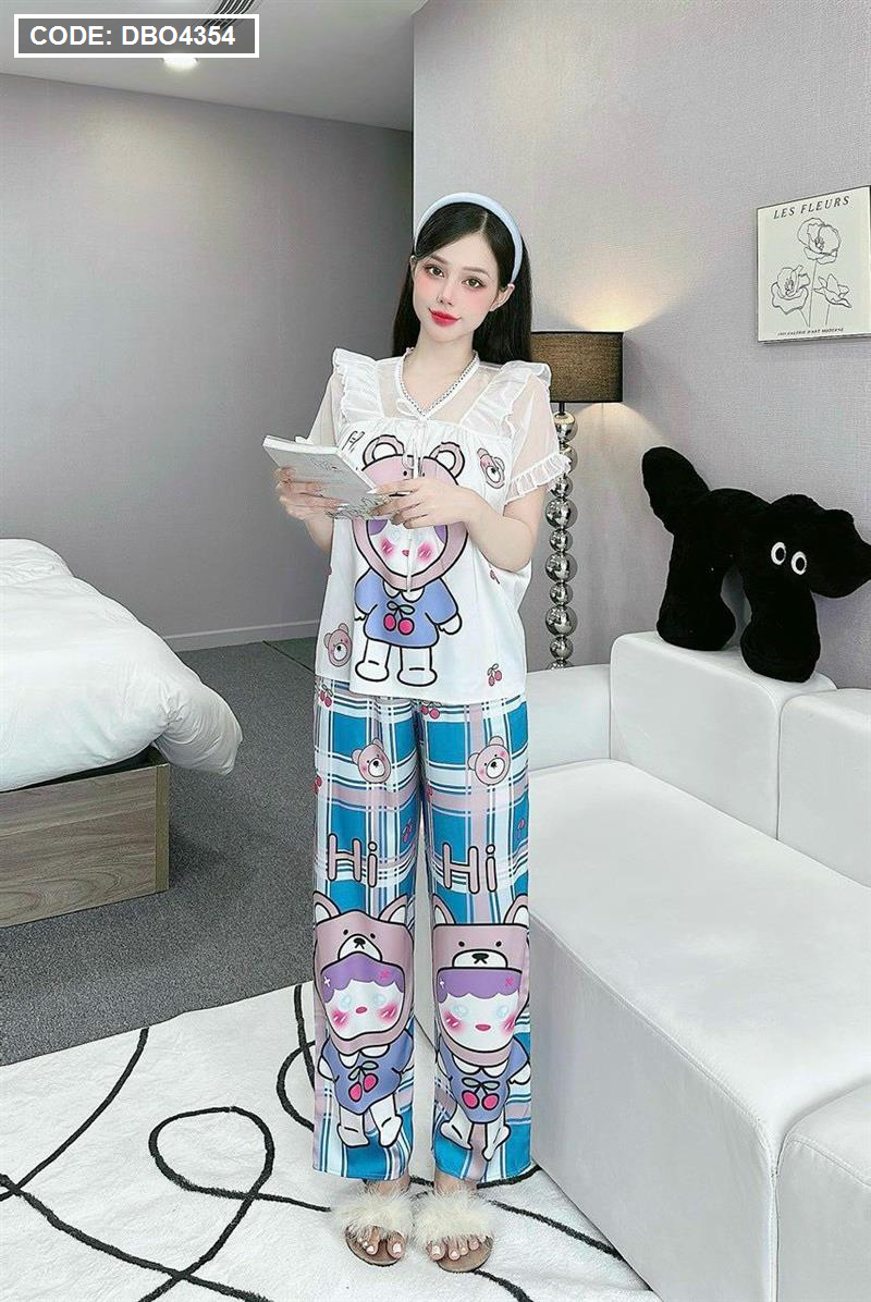 Đồ bộ pijama quần dài áo tay ngắn bèo cổ ren in họa tiết