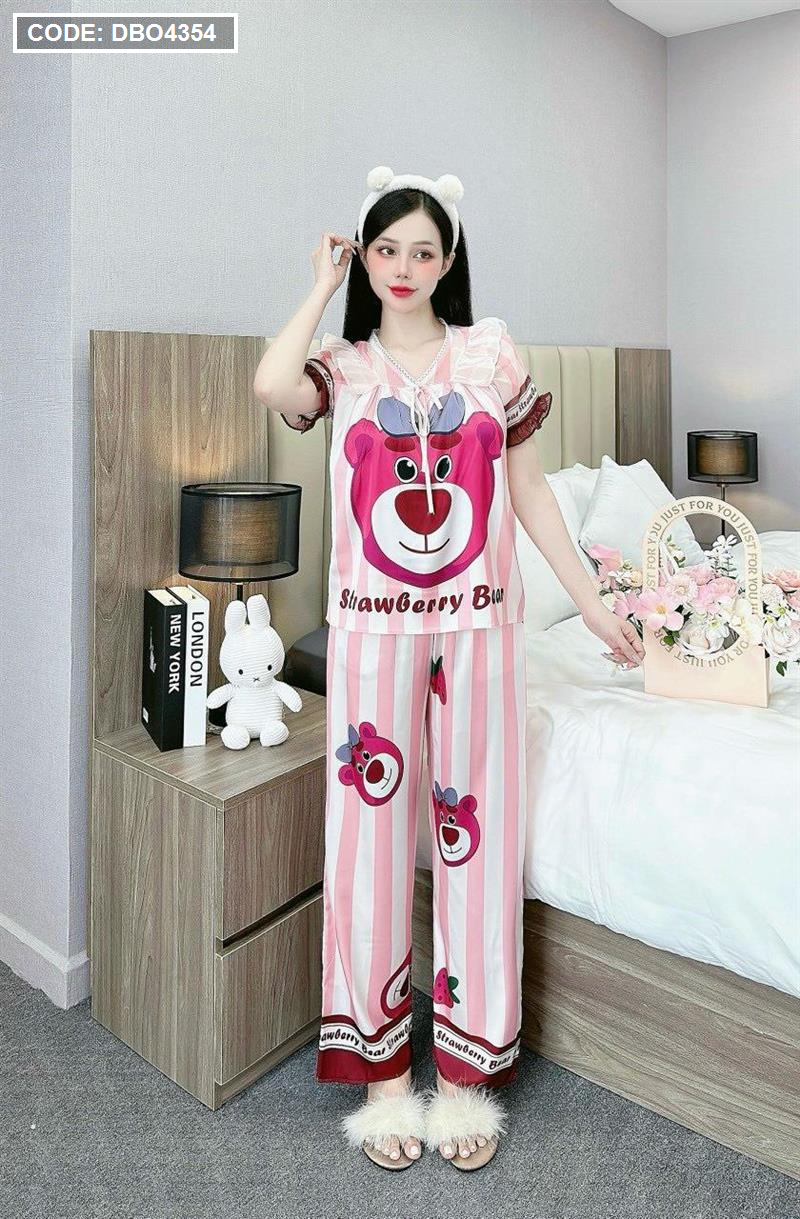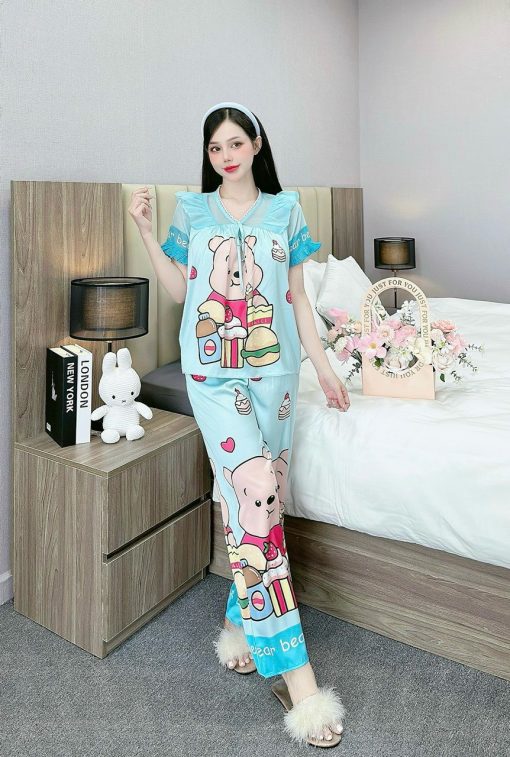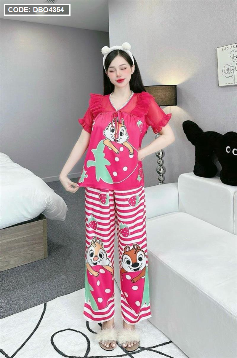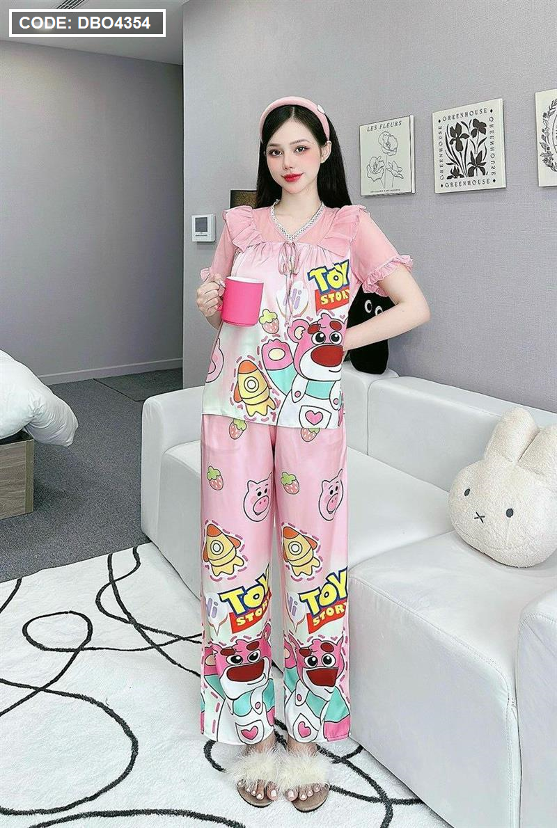 Đồ bộ pijama quần dài áo tay ngắn bèo cổ ren in họa tiết