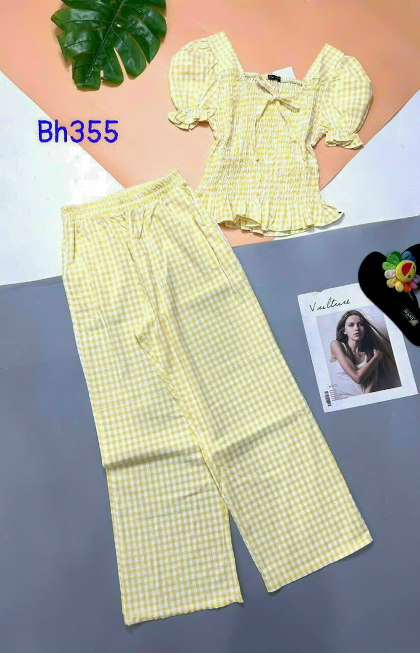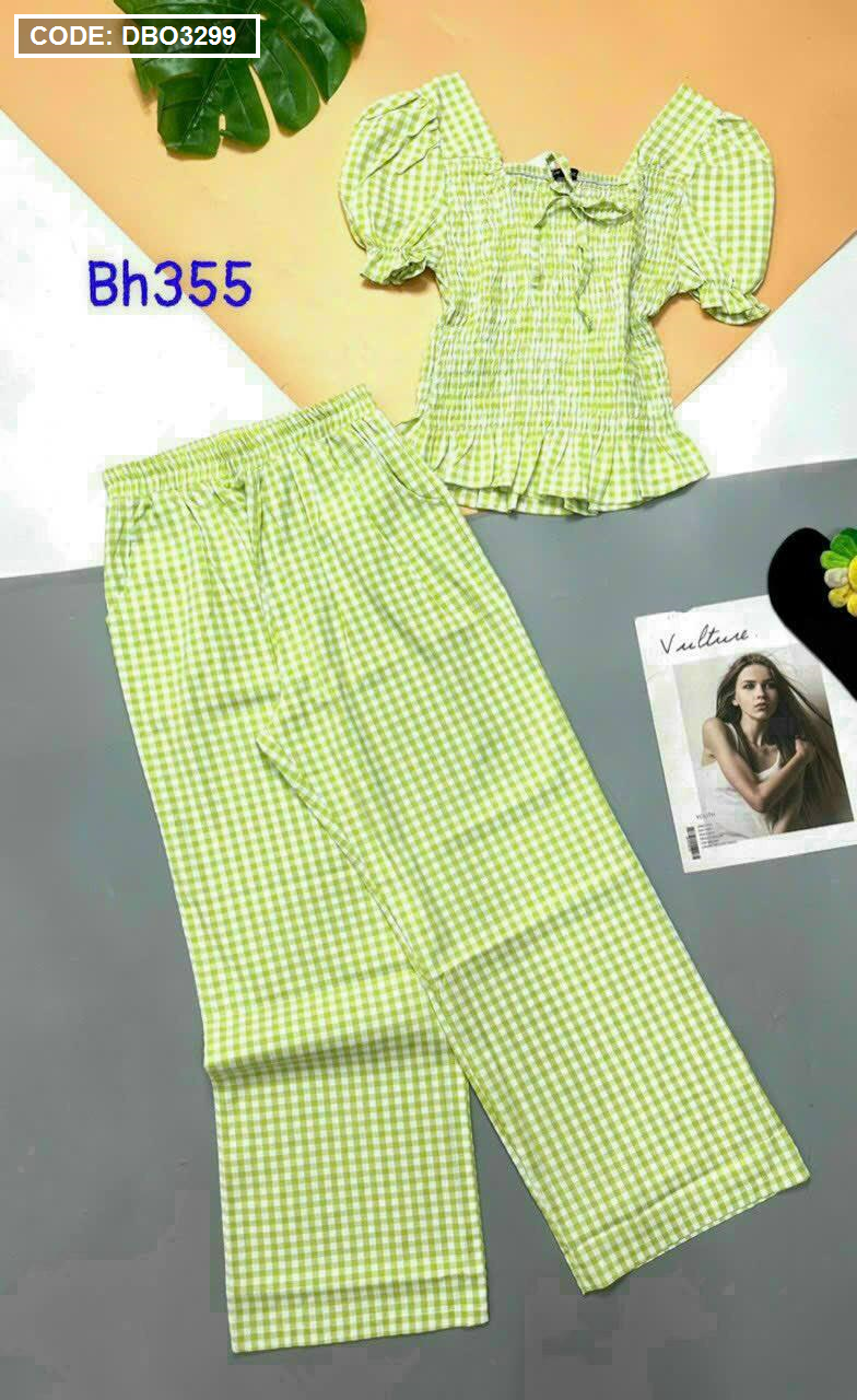 Giá sỉ đồ bộ quần dài áo tay ngắn phồng cổ vuông caro