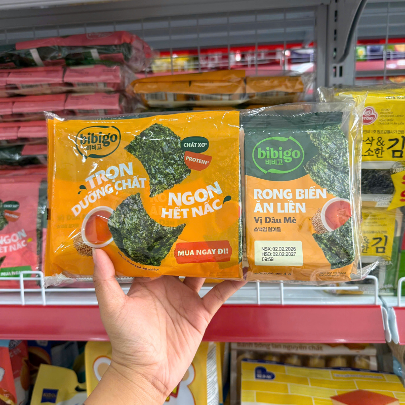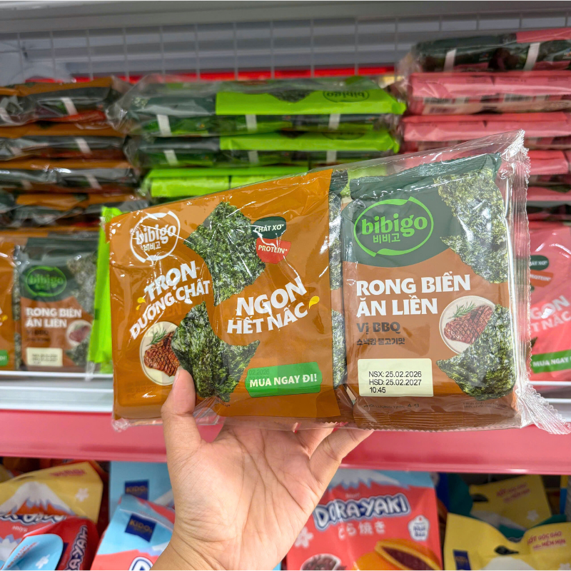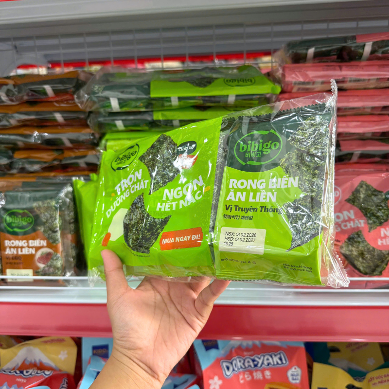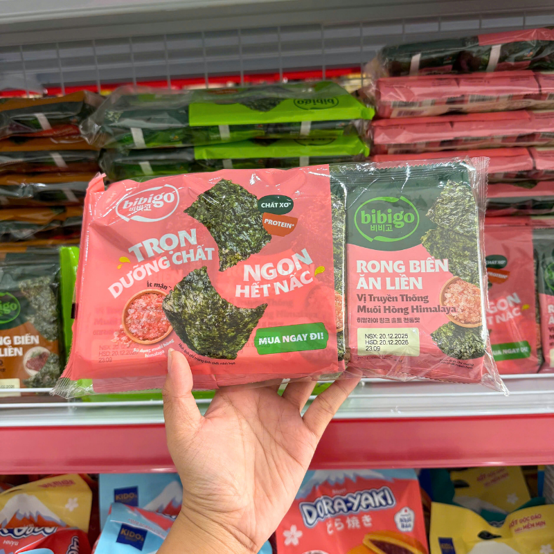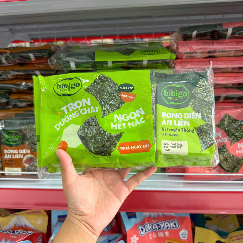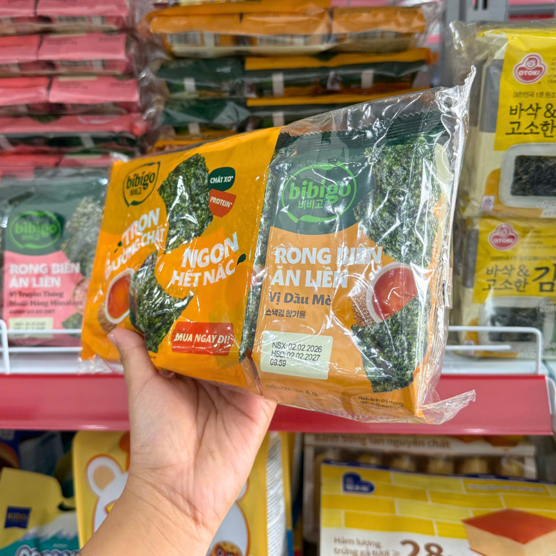Giá sỉ rong Biển Ăn Liền Bibigo Gồm 4 Vị (Truyền Thống, Dầu Mè, Muối Hồng, BBQ) – 1 Lốc 3 Gói