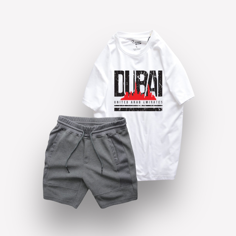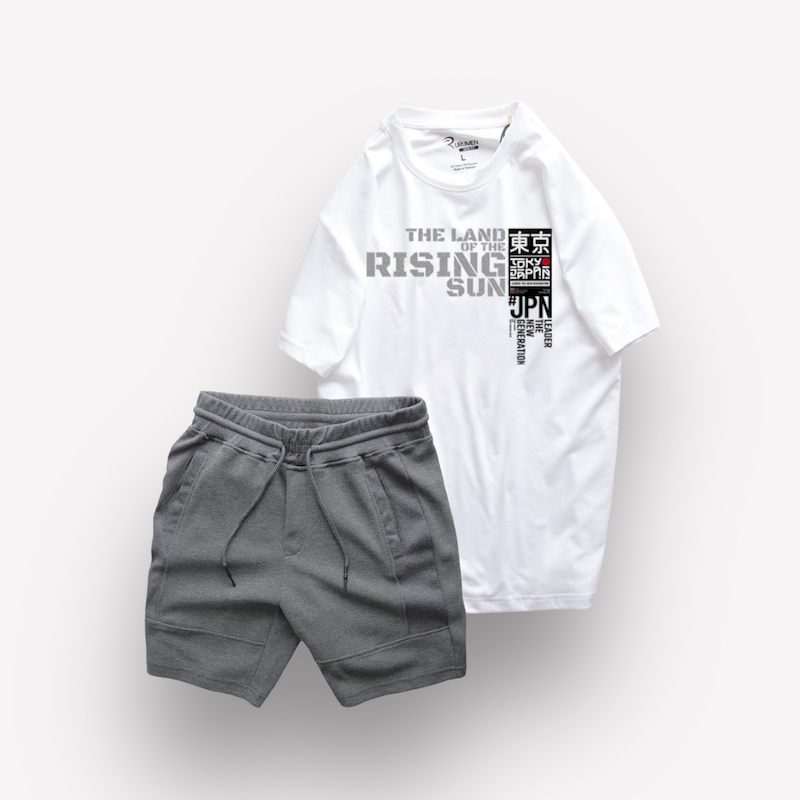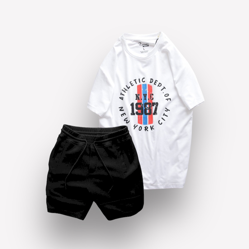 Set Bộ Nam Quần Short Thun Viên Sọc Ngang Phối Áo Cổ Tròn Rurumen Màu Trắng In Hình