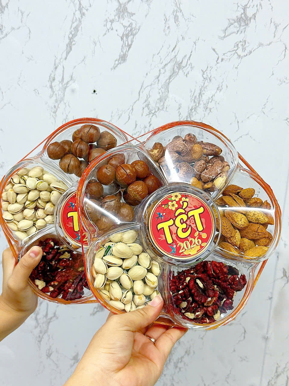 Giá sỉ set Hộp Mix Hạt Ngũ Vị (Hạt Điều Rang Muối, Quả Óc Chó Vàng, Quả Óc Chó Đỏ, Macca, Hạt Dẻ Cười, Hạnh Nhân Rang Bơ) Bông Mai 600G Hộp Tết 2026