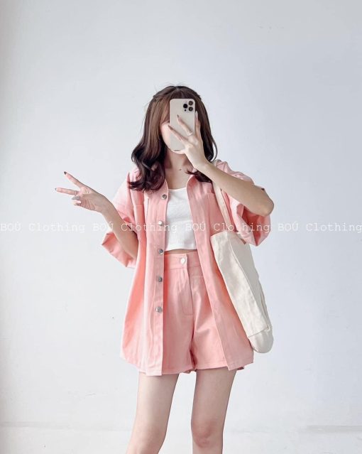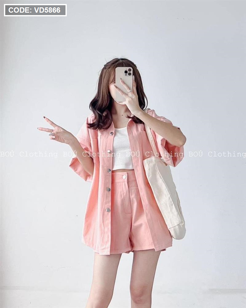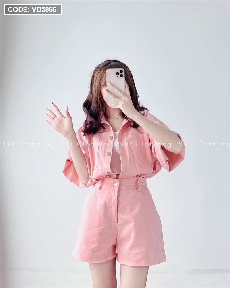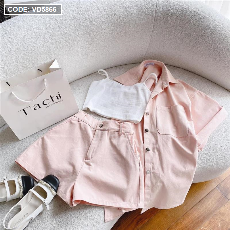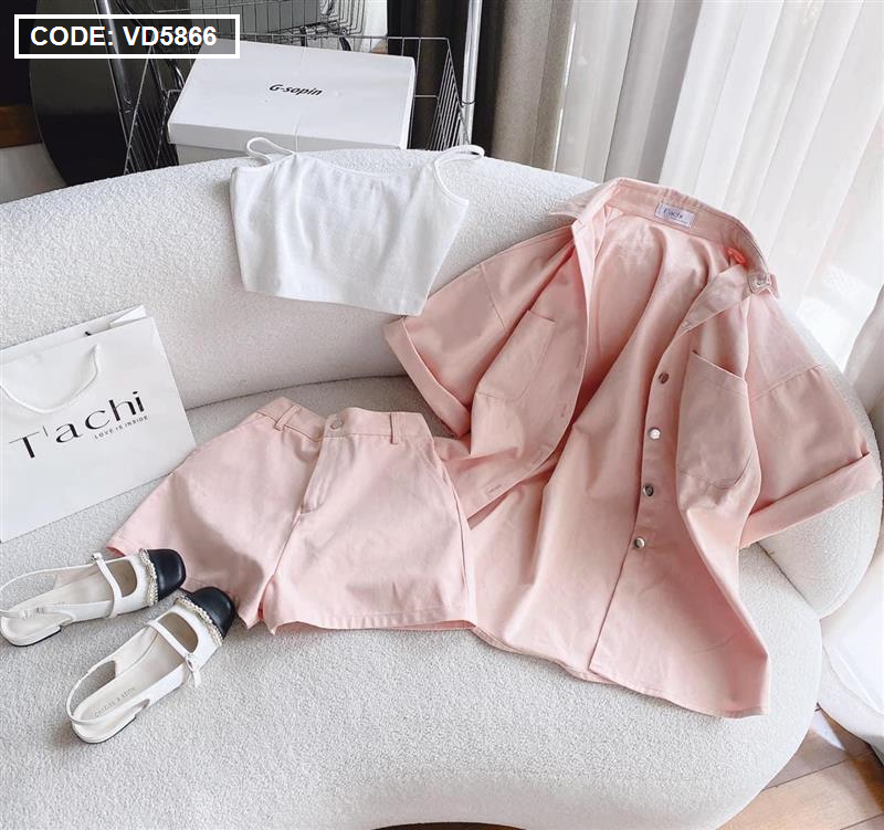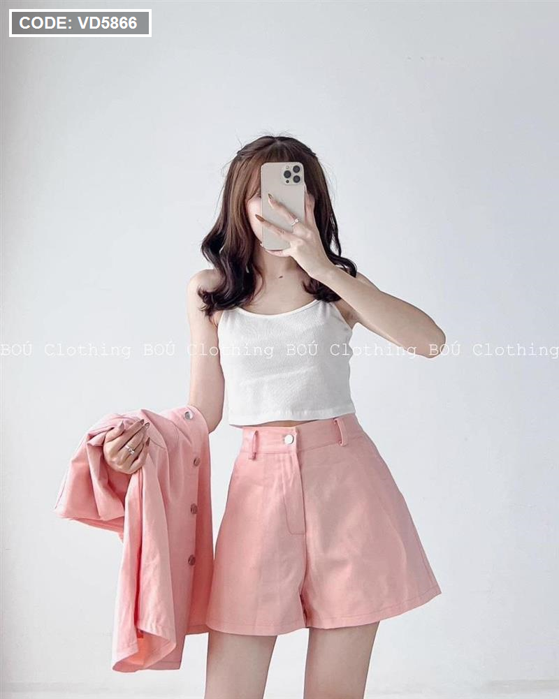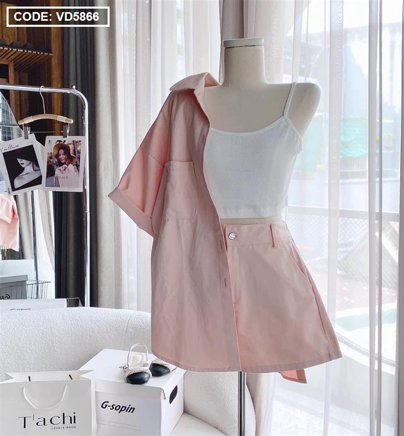 Sét kaki hồng kèm áo crop trắng 2 dây + short
