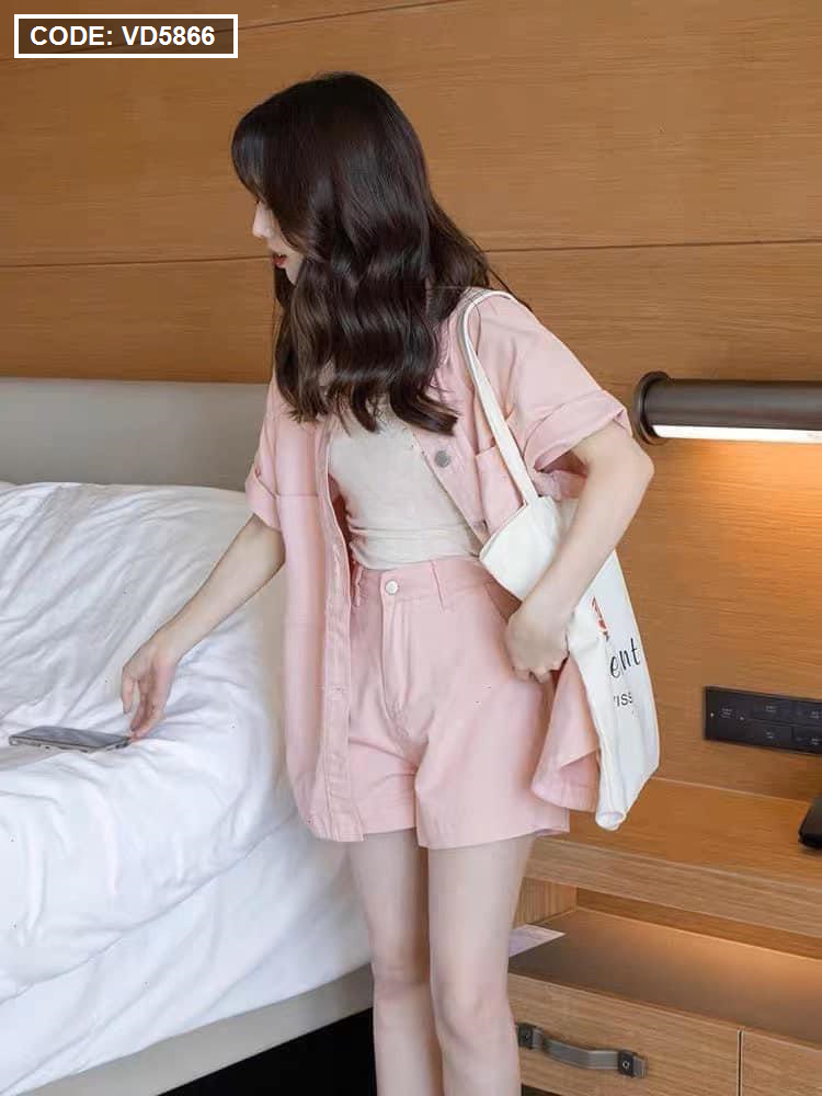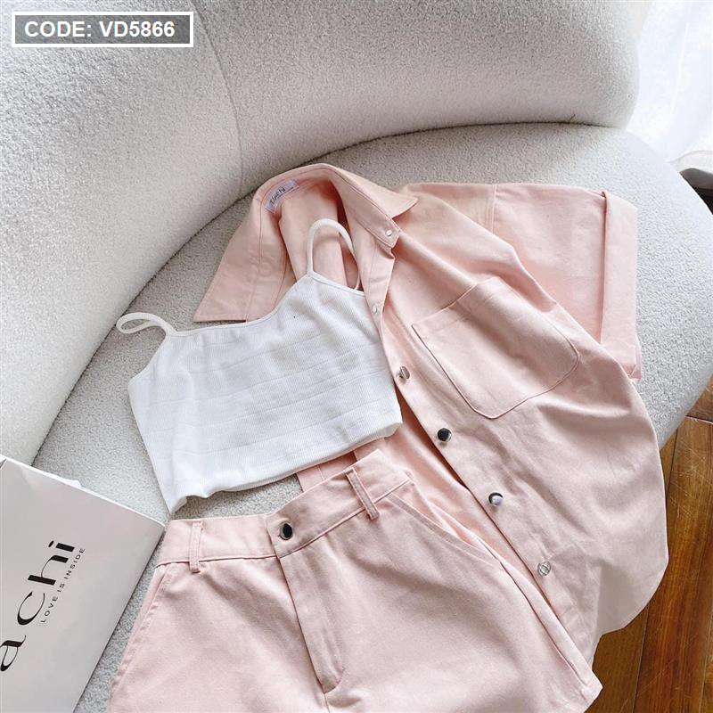 Giá sỉ sét kaki hồng kèm áo crop trắng 2 dây + short