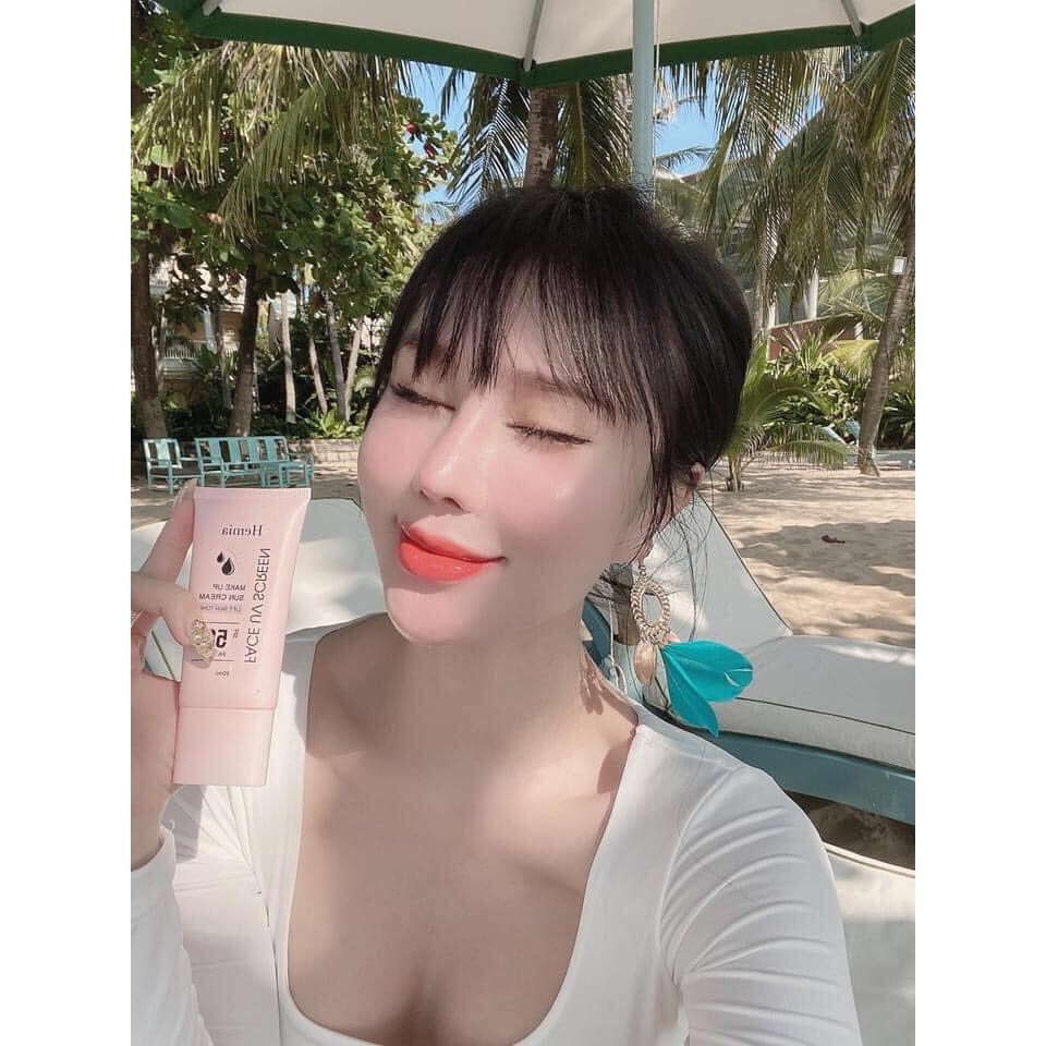 CÔNG DỤNG: Kem chống nắng Make up HEMIA SPF 50, Pa++++ có tác dụng chống nắng, chống lại tia UVA UVB một cách hoàn hảo nhất, chỉ số chống nắng cao, bảo vệ da trước mọi tác nhân gây hại , tinh chất EGF giúp tái tạo làn da từ sâu bên trong, kích thích tăng sinh collagen khiến da mềm mượt hơn. ngăn ngừa thâm nám, tàn nhang, đồi mồi hiệu quả. Hemia khuyên dùng kem chống nắng ngay cả khi không ra ngoài trời vì tia UVA Và UVB cỗ ngay cả trong các thiết bị điện tử trong nhà. Ngoài ra sản phẩm có chức năng 3in1, vừa chống nắng, dưỡng bảo vệ da vừa thay thế kem trang điểm, chỉ cần thoa một lớp kem sẽ cảm nhận ngay làn da được nâng tone, che khuyết điểm và căng bóng, đều màu da, không cần dùng tới kem nền hay phấn phủ nữa.