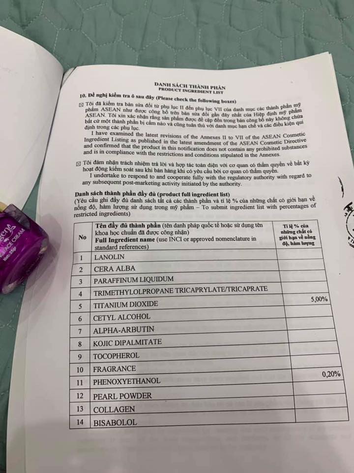Thành Phần: Lanolin; Cera Alba, Liquidum, Trimethylolpropane Tricaprylate/Tricaprate, Titanium Dioxide 5,00%, Cetyl Alcohol, Alpha-arbutin, Kojic Dipalmitate, Tocopheryl Acetate, Fragrance. Phenoxyethanol 0,20%, Pearl Powder, Coilagen, Bisabolol.