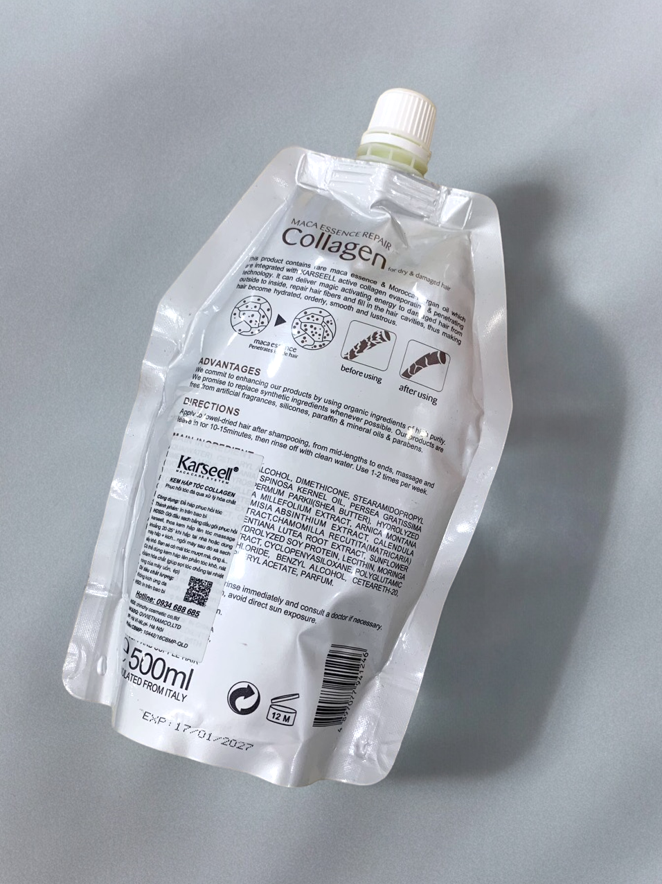– Tại salon: Hấp tóc Collagen karseell được dùng để hấp dầu 15-20 phút bằng máy Ozon, hoặc kết hợp máy phun Nano làm dịch vụ phủ lụa collagen, pha vào thuốc uốn duỗi nhuộm tăng độ mềm bóng mượt.