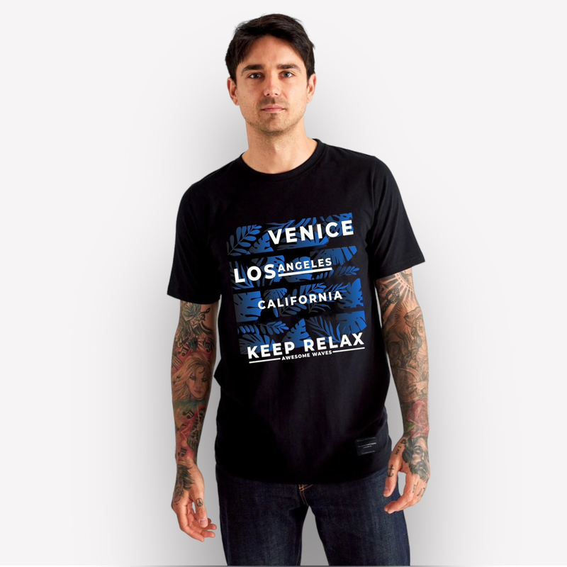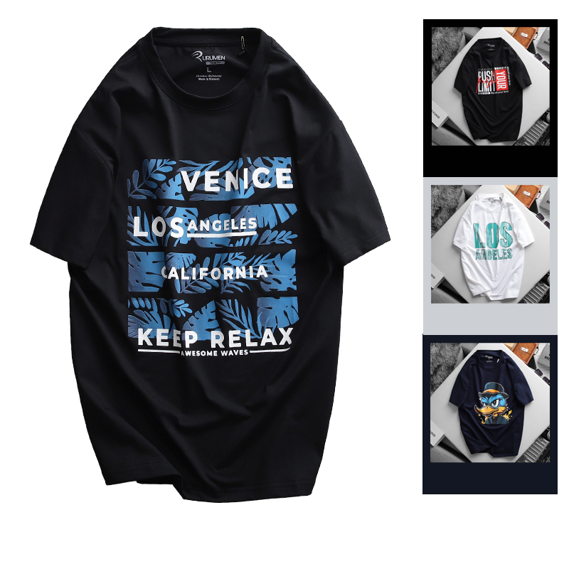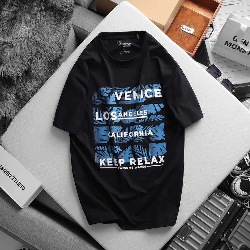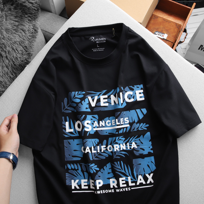 Áo Thun Nam Cổ Tròn Rurumen Màu Xanh Đen In Chữ Venice Los Angeles Big Size