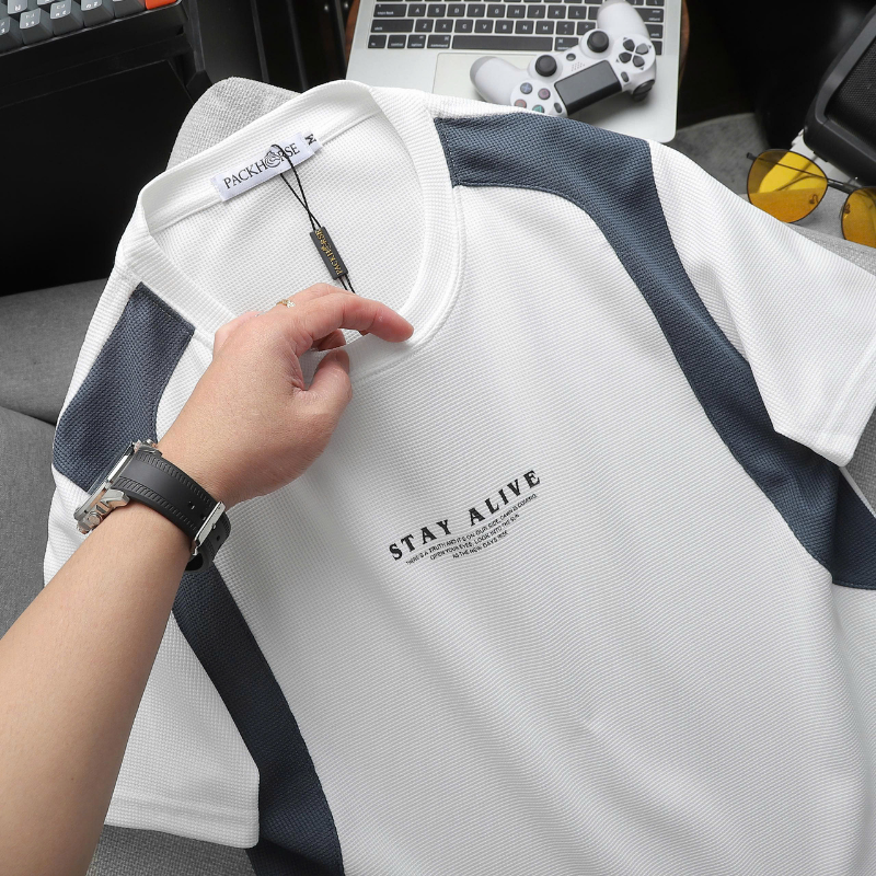 Kho sỉ áo Thun Nam Cổ Tròn Phối Sọc Màu & In Logo Chữ Trước Ngực Có Big Size