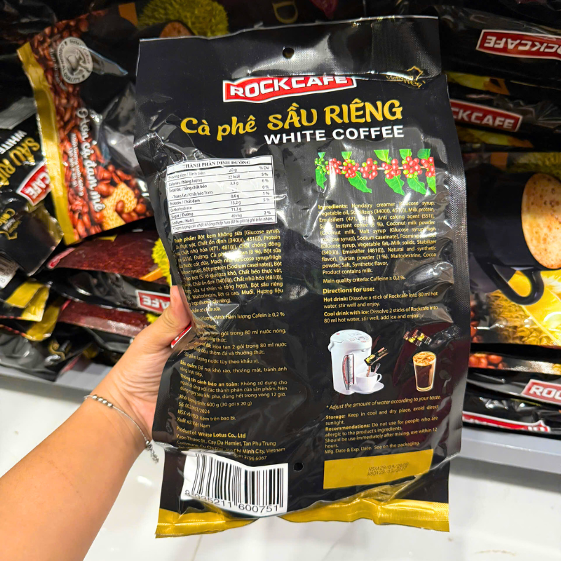 THÀNH PHẦN: Bột kem không sữa (Glucose syrup, Dầu thực vật, Chất ổn định (340(ii), 451(1), Protein ‘ sửa Chất nhũ hóa (471, 481(i)), Chất chống đông vón (551)), Đường, Cà phê hòa tan (8 %), Bột sữa dừa (Nước cốt dừa, Mạch nha (Glucose syrup/High mailtose syrup), Bột protein (Sodium caseinate)], Bột kem tạo bọt (Si rô glucoza khô, Chất béo thực vật, Sữa khô, Chất ổn định (340(ii)), Chất nhũ hóa (481(i)), Hương sữa tự nhiên và tổng hợp), Bột sầu riêng 4 %), Maltodextrin, Bột ca cao, Muối, Hương liệu tổng hợp (hương sầu riêng).