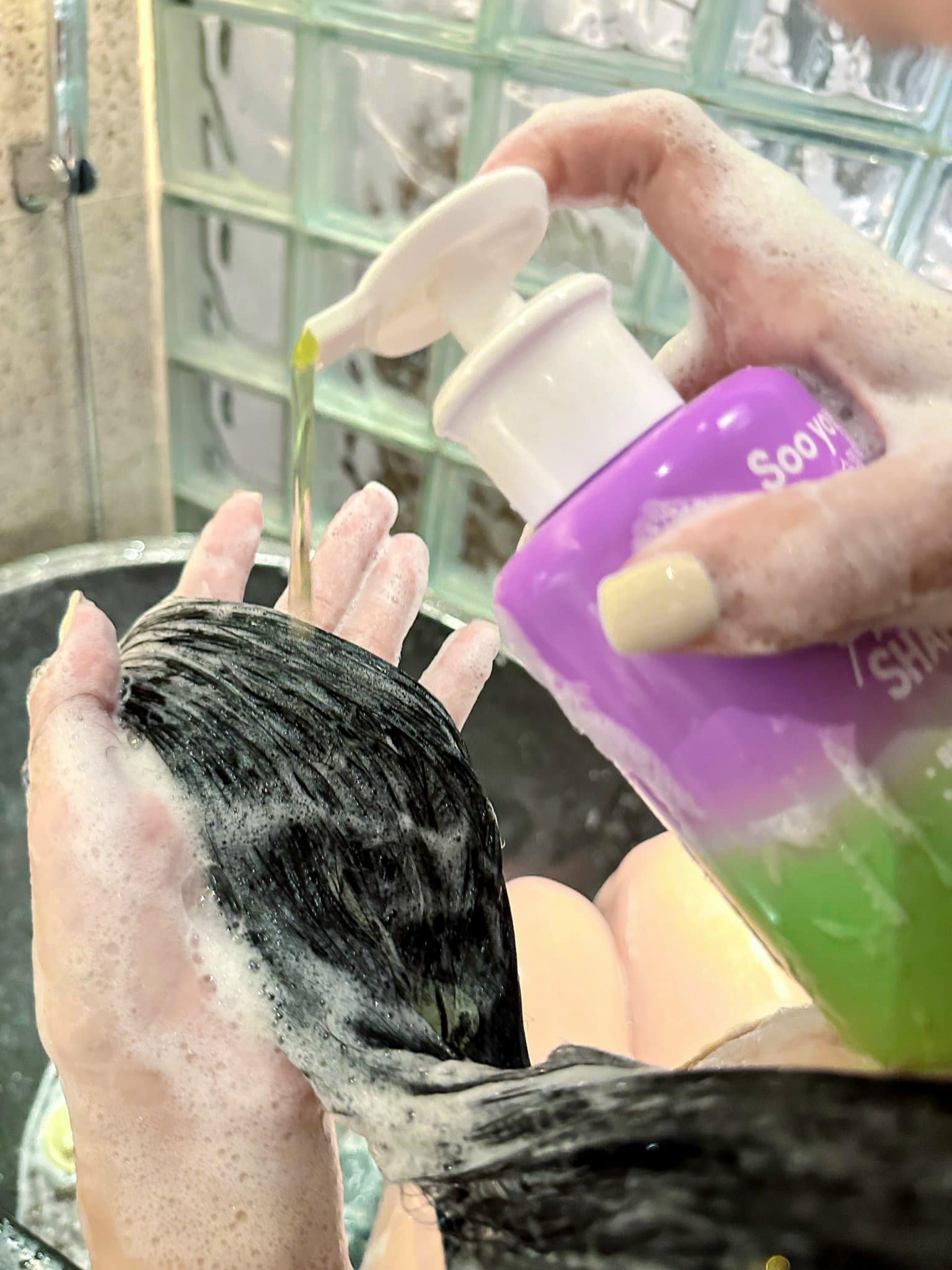 🌿 Dầu gội sen tảo : làm ướt tóc, thoa đều dầu gội lên tóc, massage nhẹ nhàng từ gốc đến ngọn, sau đó xả lại với nước.