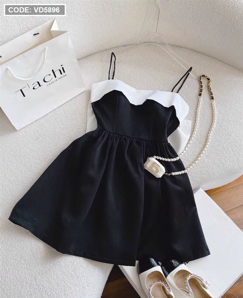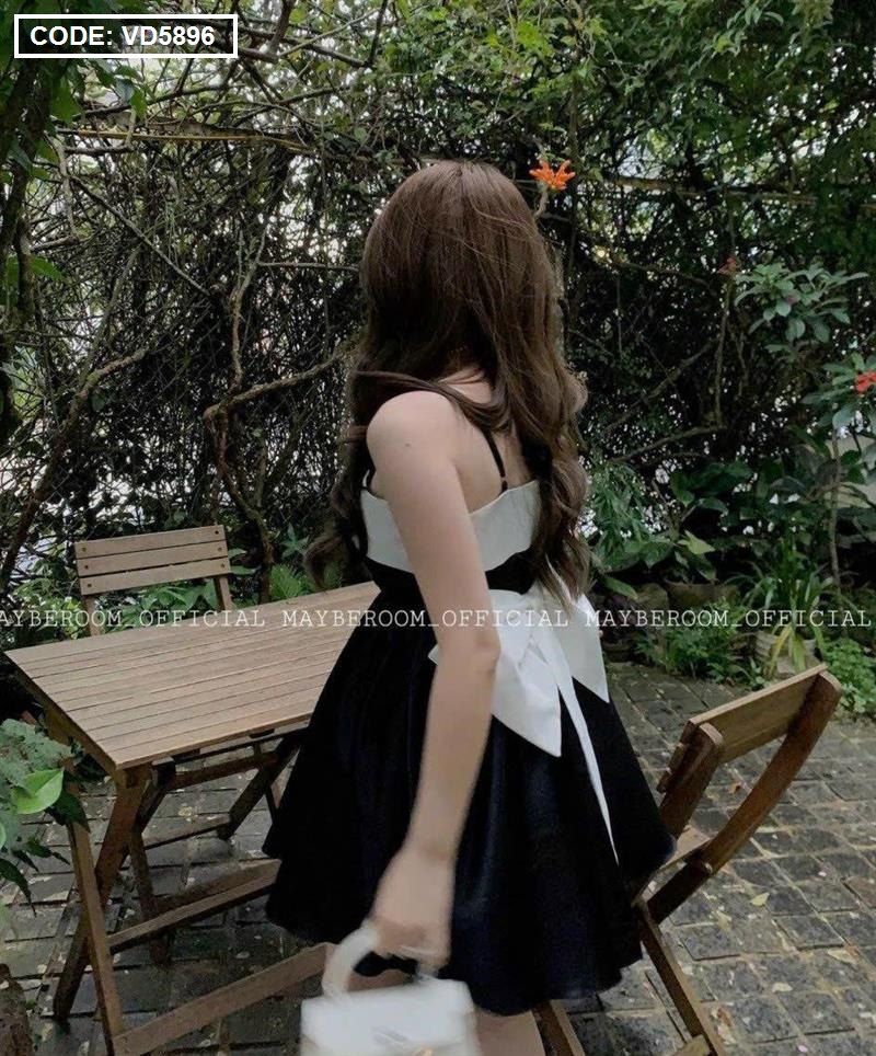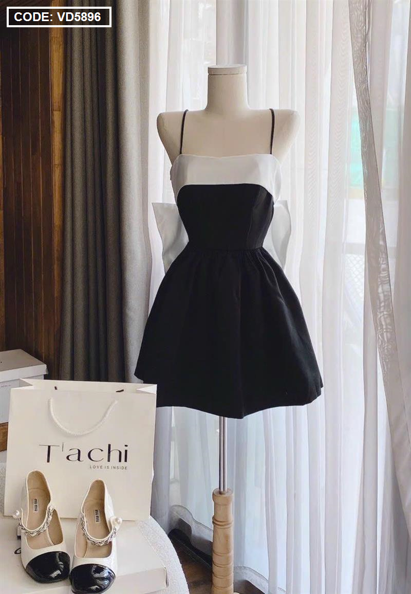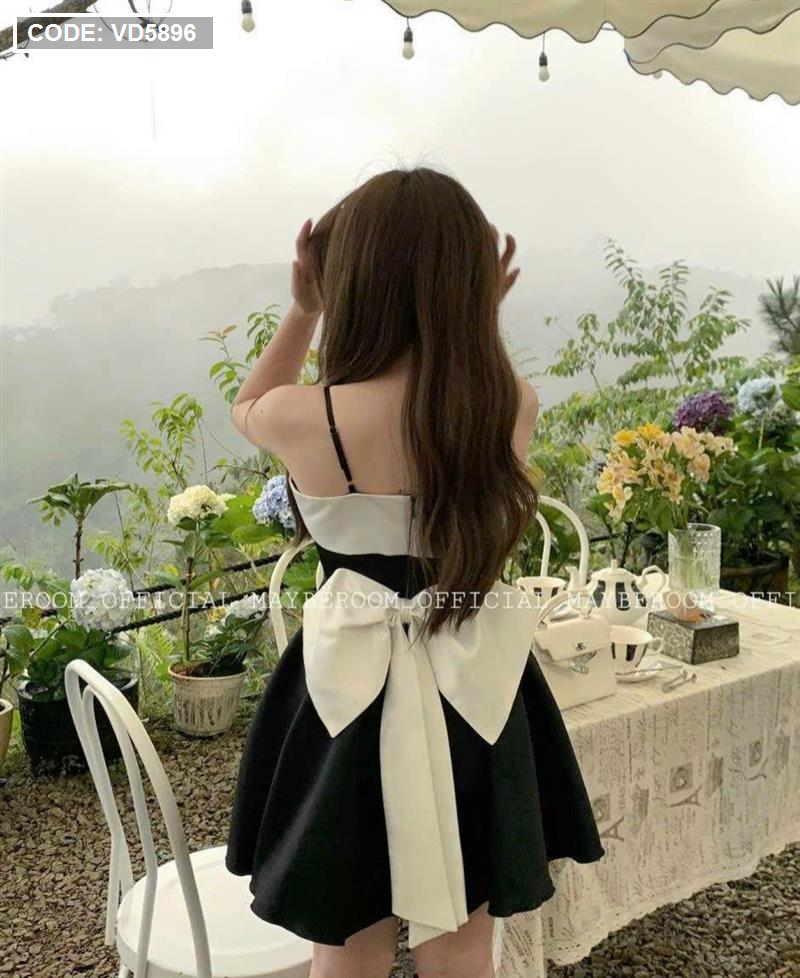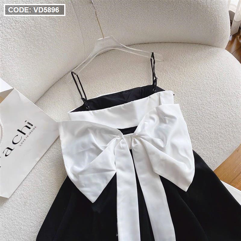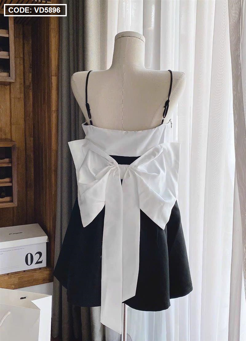 Kho sỉ đầm 2 dây đen phối nơ trắng lưng