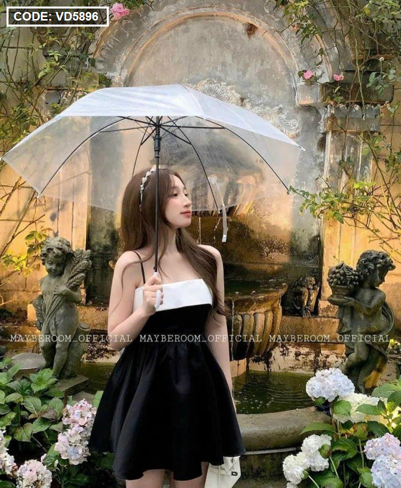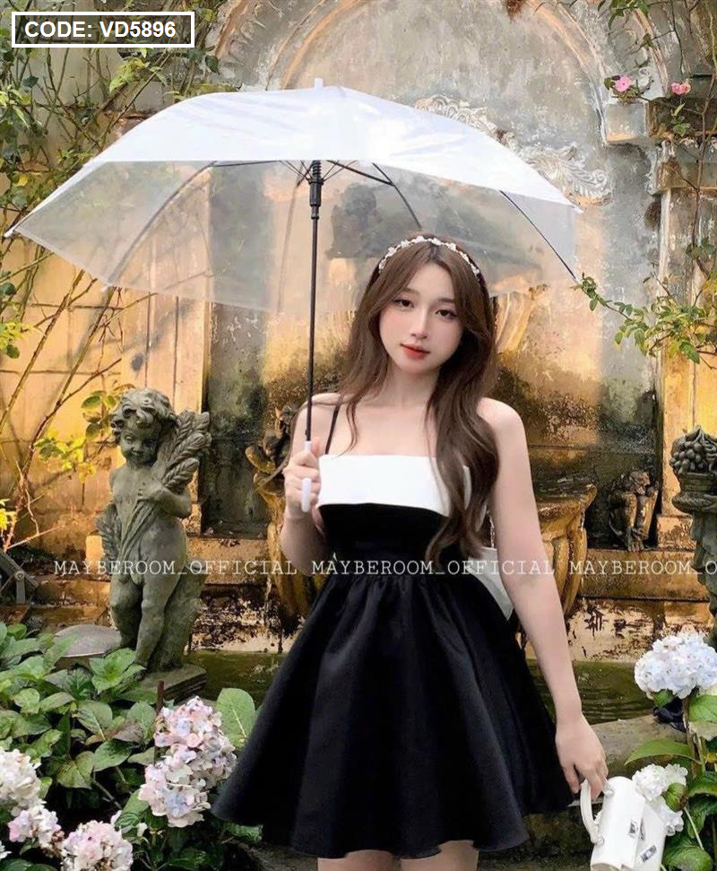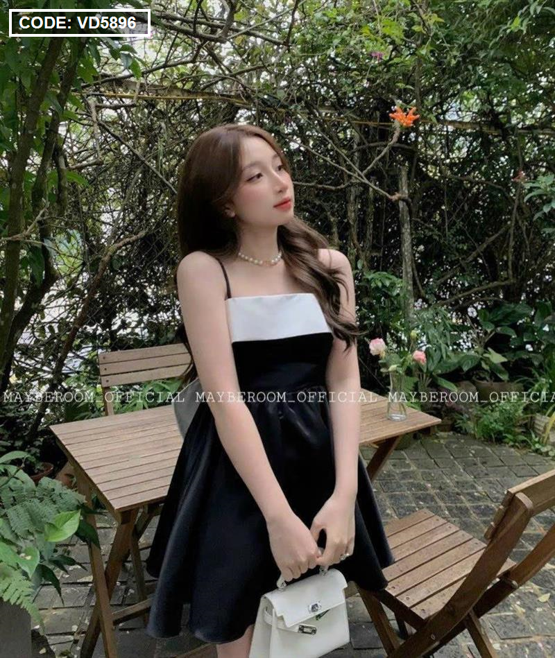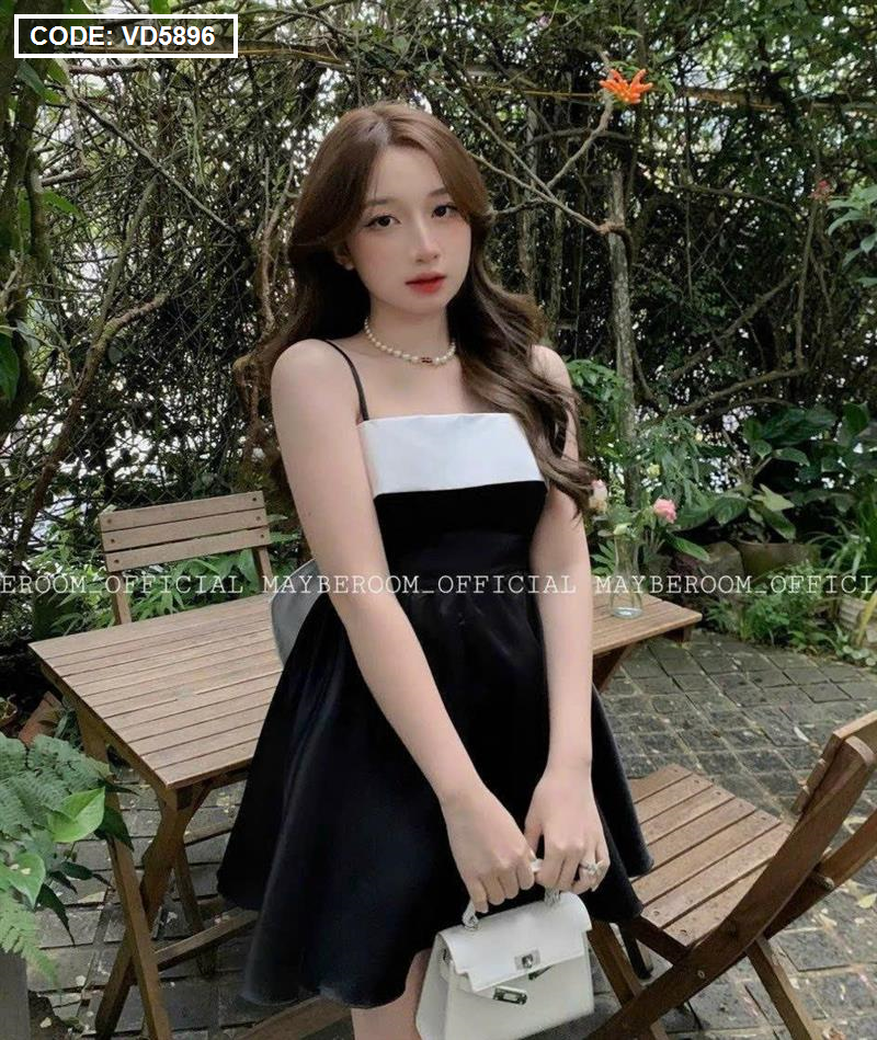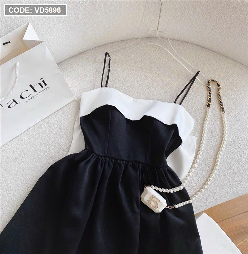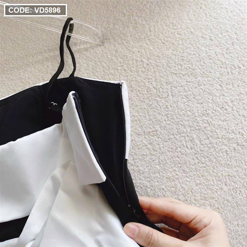 Kho sỉ đầm 2 dây đen phối nơ trắng lưng