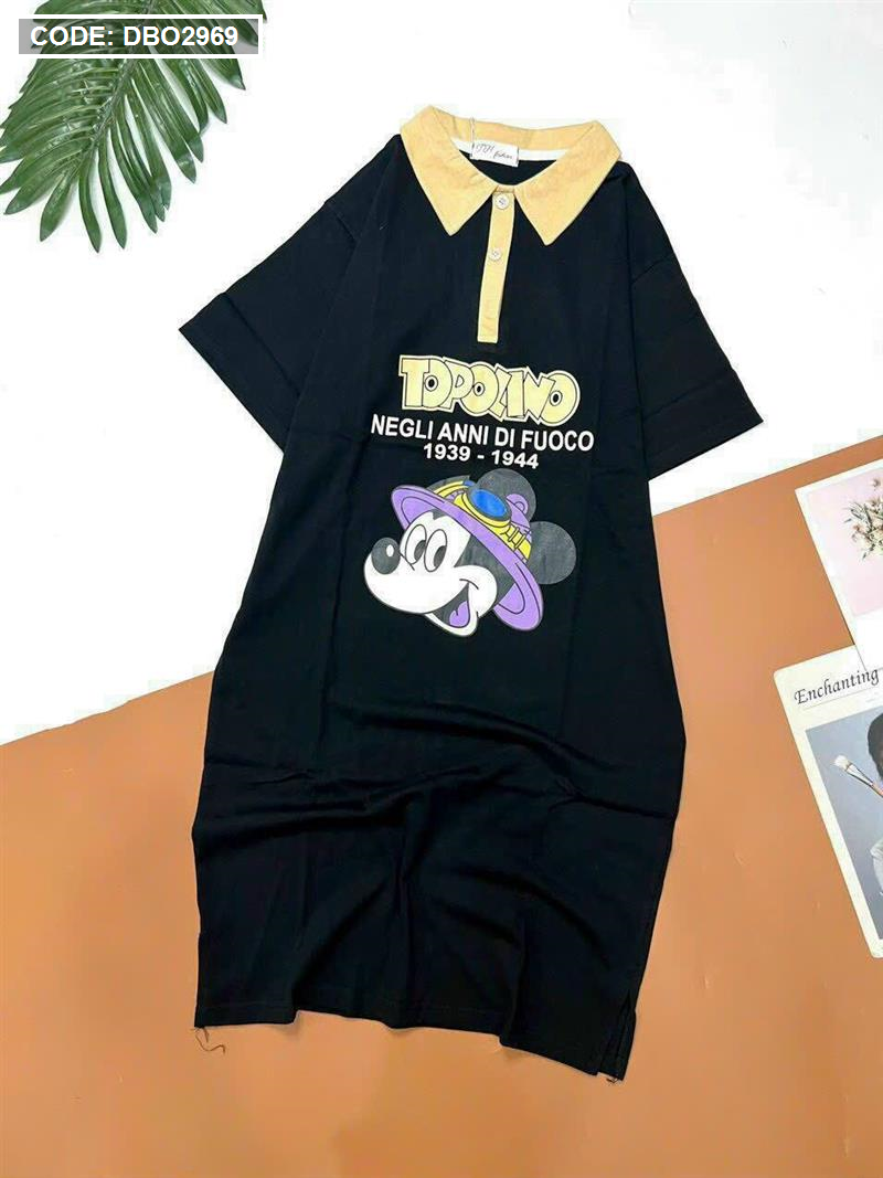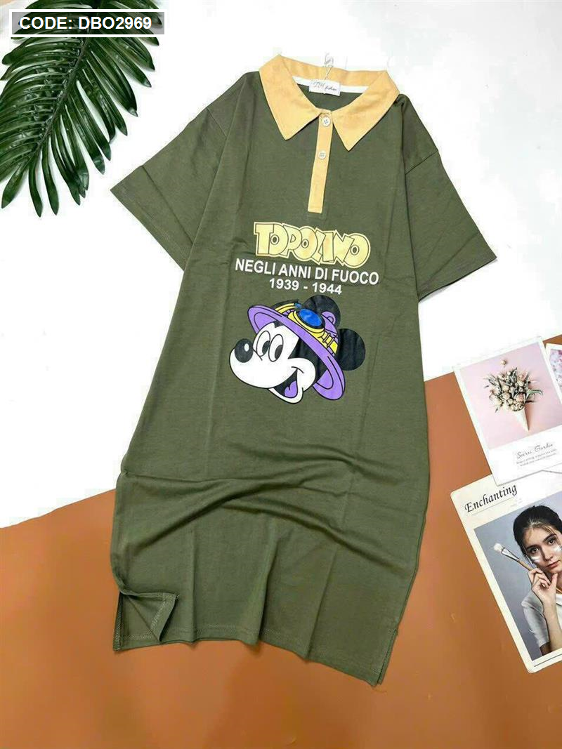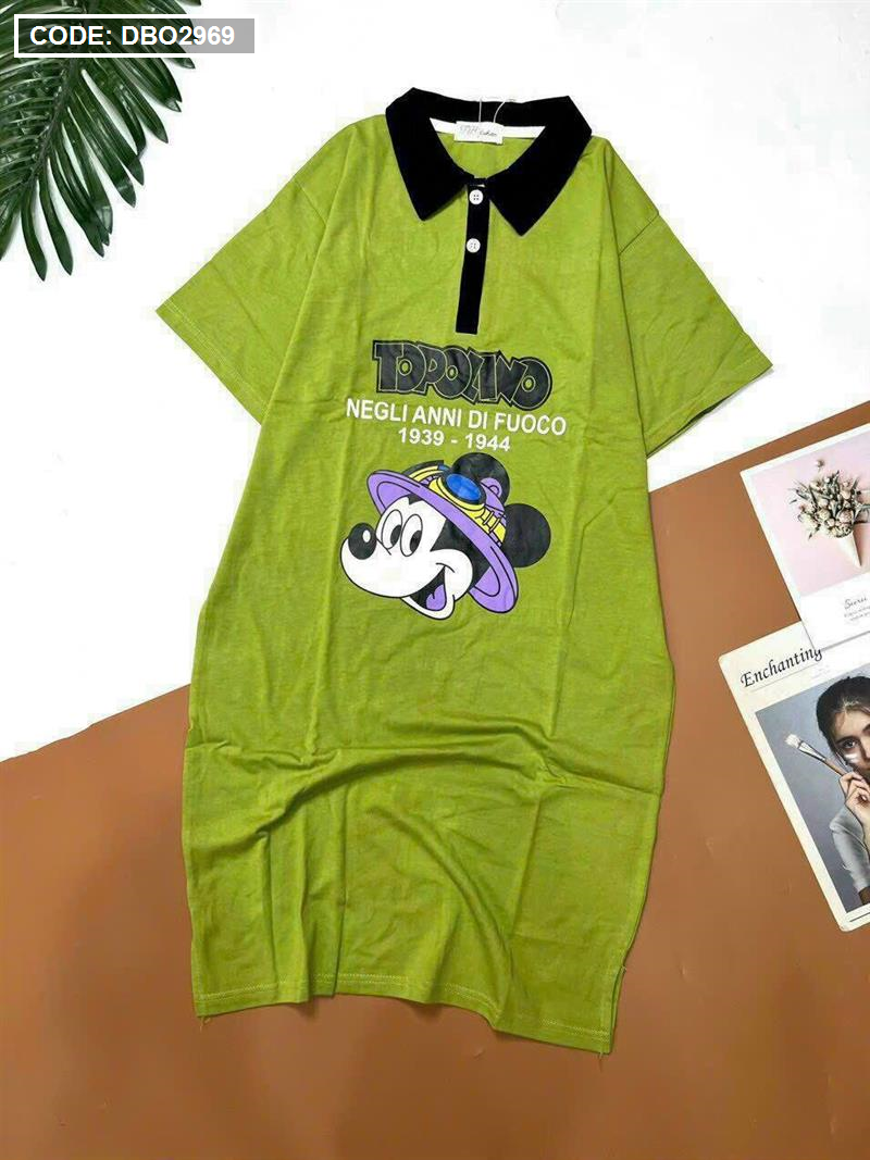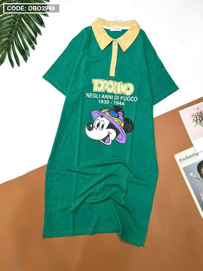 Kho sỉ đầm nữ form suông tay ngắn cổ bẻ in hình