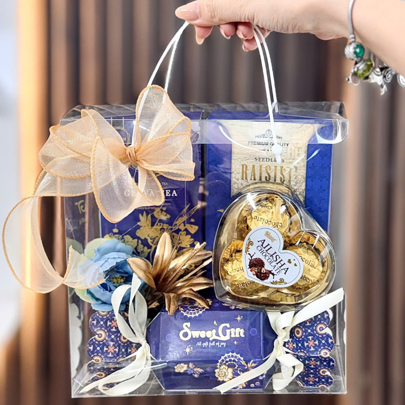 Thiết kế form vuông trong suốt, phối nơ lụa và hoa trang trí theo từng tông màu giúp set quà trở nên sáng, sang và vô cùng lịch sự khi cầm tay. Nhìn nhỏ gọn nhưng ai nhận cũng thích vì gói gọn đủ vị Tết bên trong.