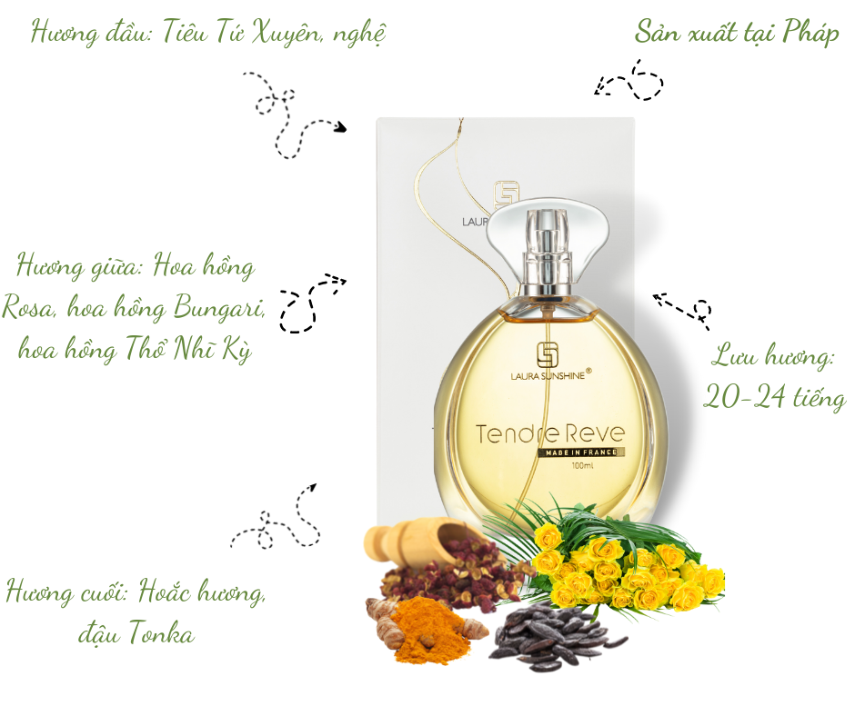 Nước hoa Nữ Tendre Reve Laura Paris No3 100ml – Laura Sunshine Nhật Kim Anh với thiết kế võ chai trong suốt nhìn rõ bên trong, toát lên vẻ đẹp sang trọng, thu hút, hé lộ về một mùi hương quyến rũ và mềm mại đang chực chờ lan tỏa. Tendre Reve Laura Paris No3 chính là một vườn hồng được tinh chế tỉ mỉ để khiến bạn chìm đắm trong cơn say của vị ngọt nhẹ nhàng. Như thể một buổi sáng bình yên, đôi chân được dẫn đường tới cánh vườn hồng mênh mông, hương thơm mang mác của những đóa hồng trứ danh làm chủ hoàn toàn không gian và không ngừng xoay quanh cảm xúc của bạn