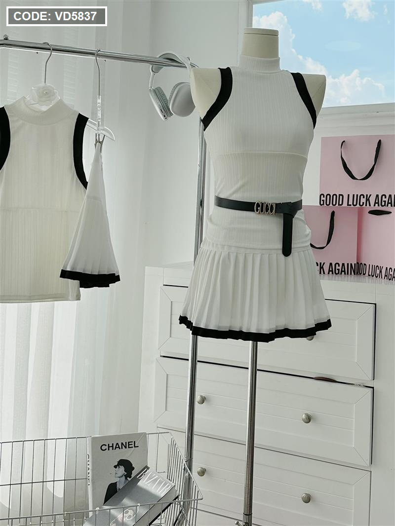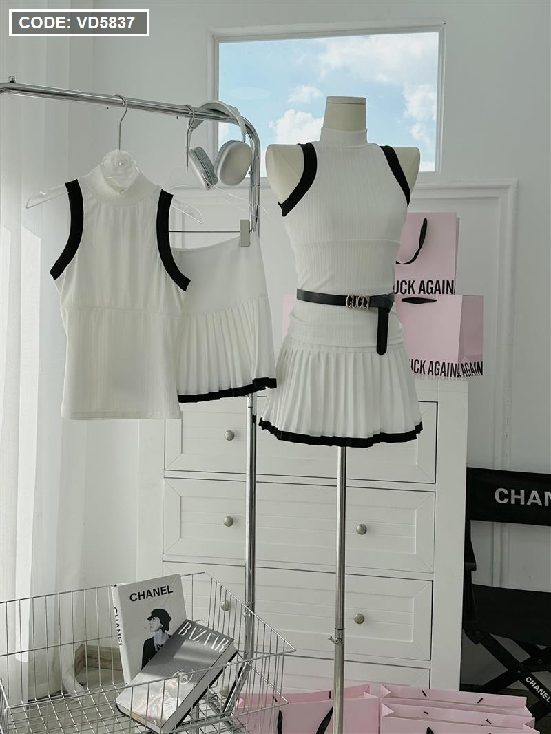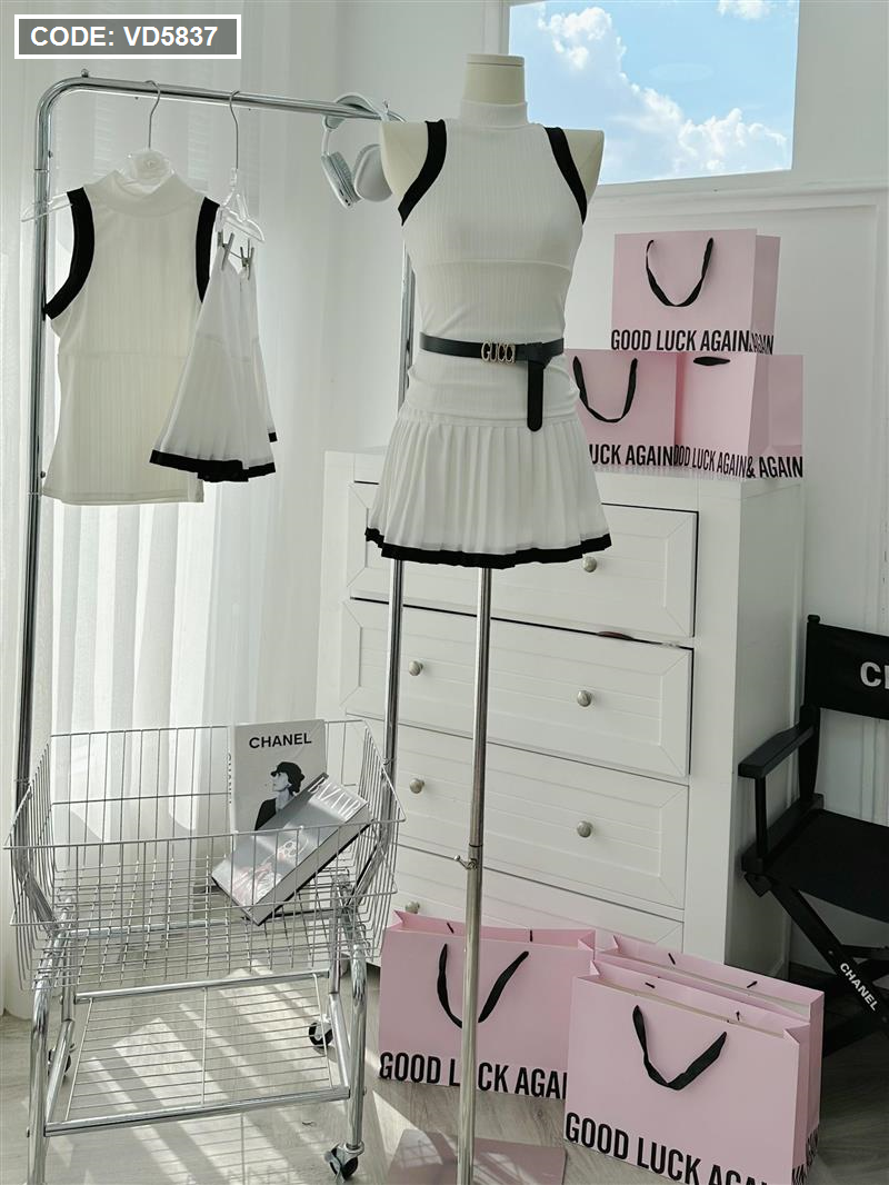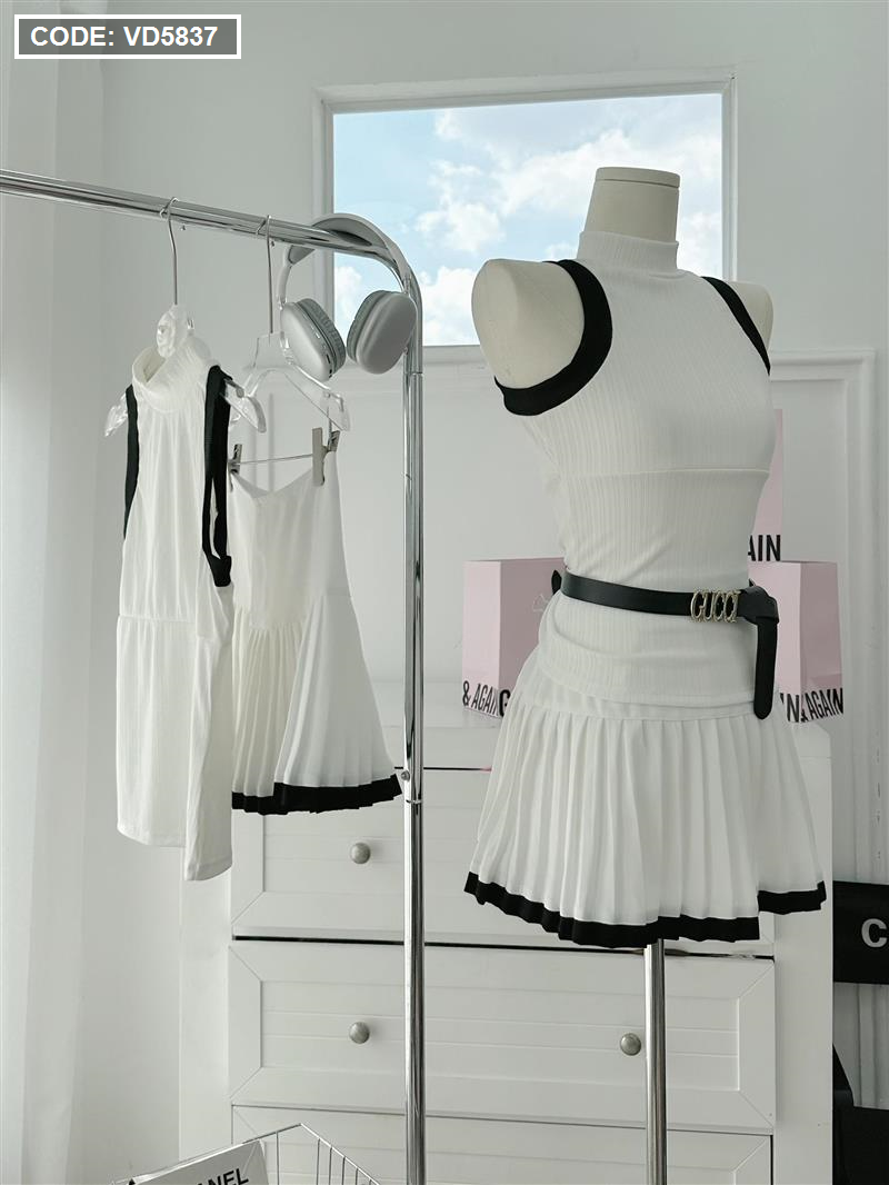 Kho sỉ sét áo trắng viền đen + chân váy xếp ly