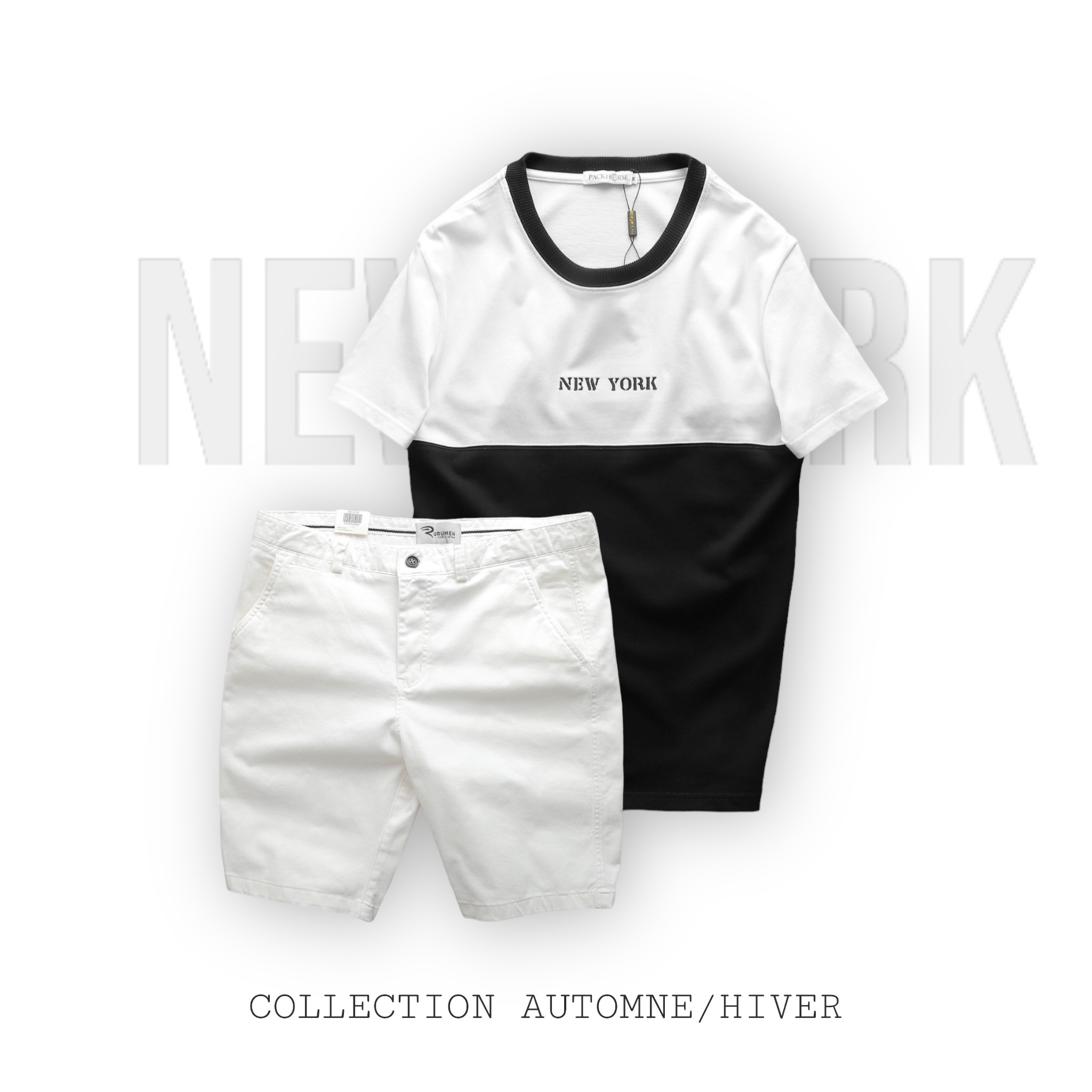Kho sỉ set Bộ Nam Áo Thun Cổ Tròn Pack Hourse Hai Màu Phối Quần Short Kaki Rurumen Cao Cấp