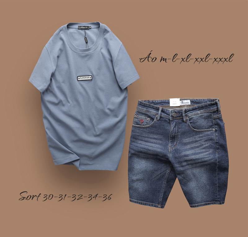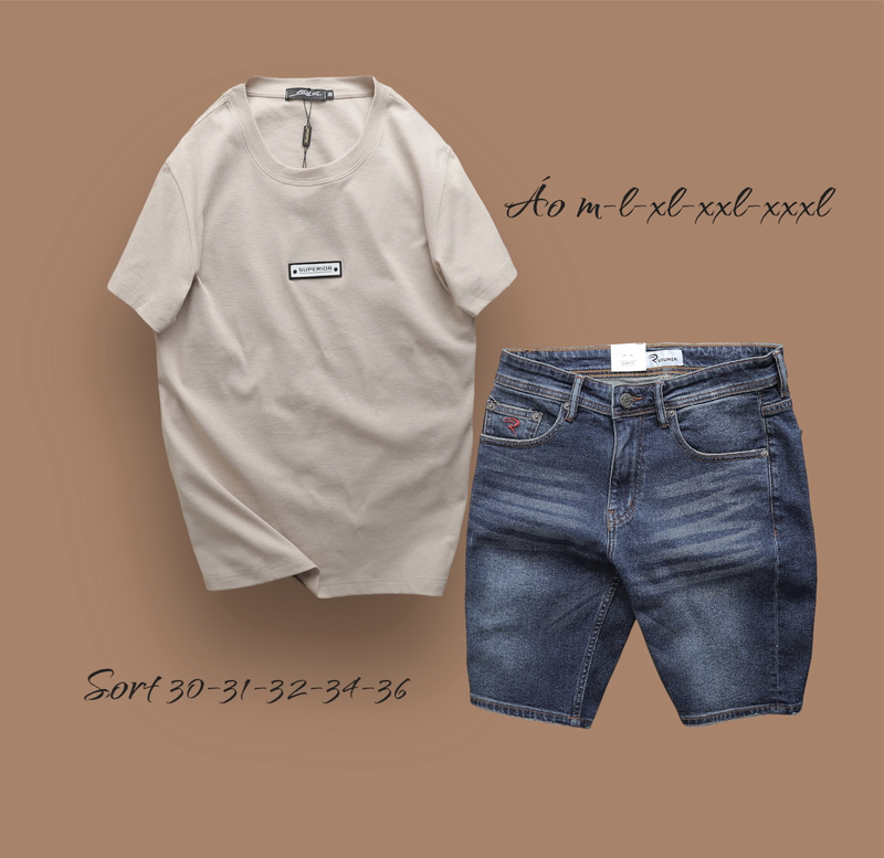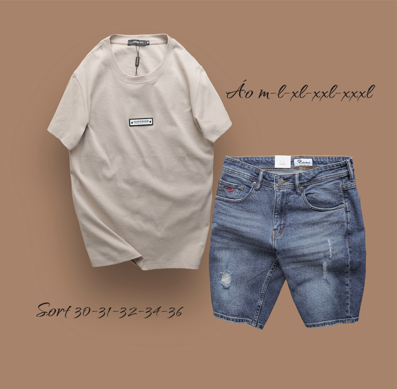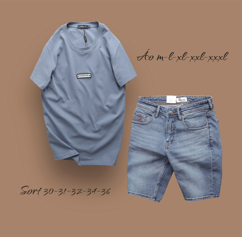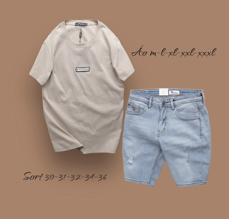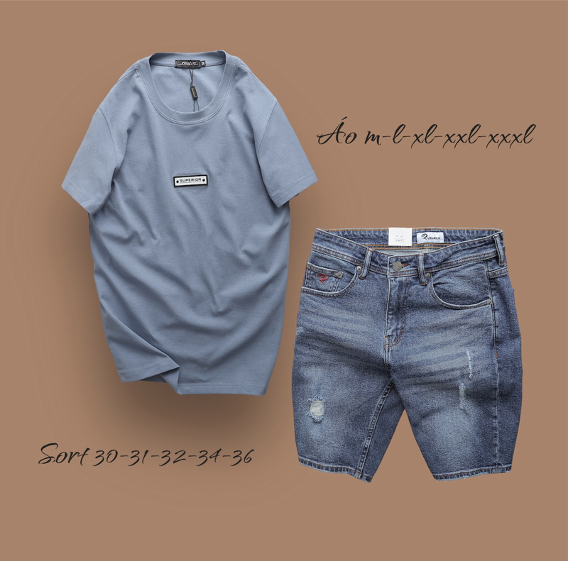 Kho sỉ set Bộ Nam Quần Short Jeans Phối Áo Thun Cổ Tròn Tag Chữ Superior