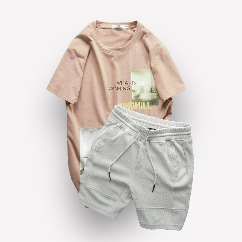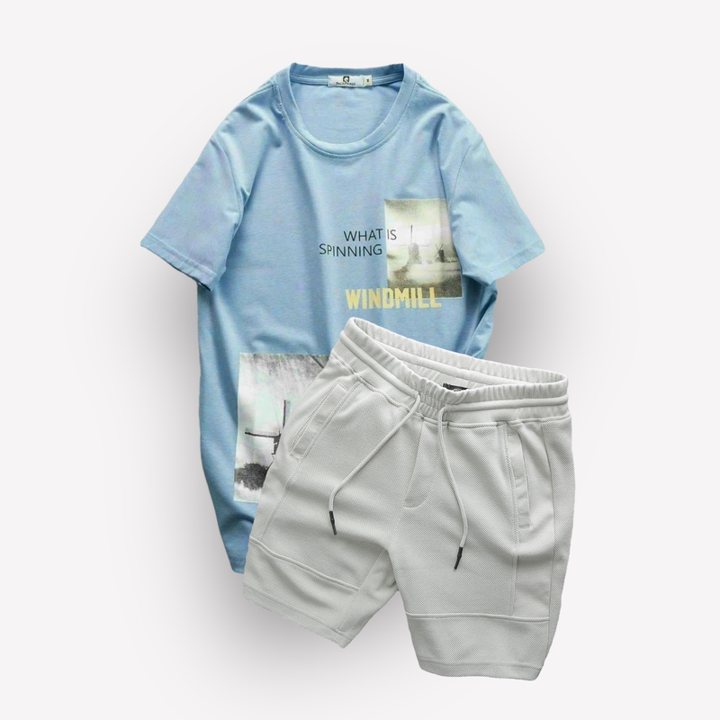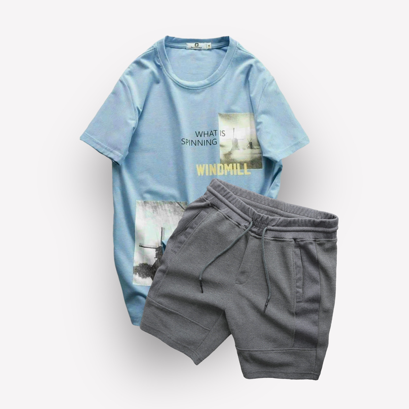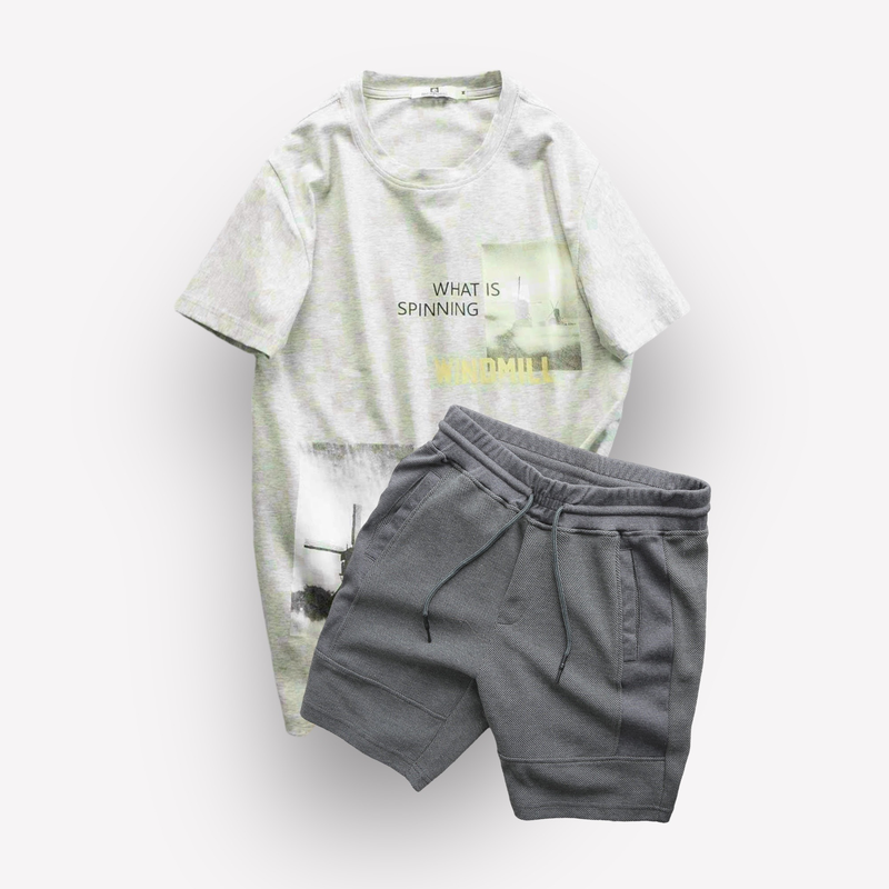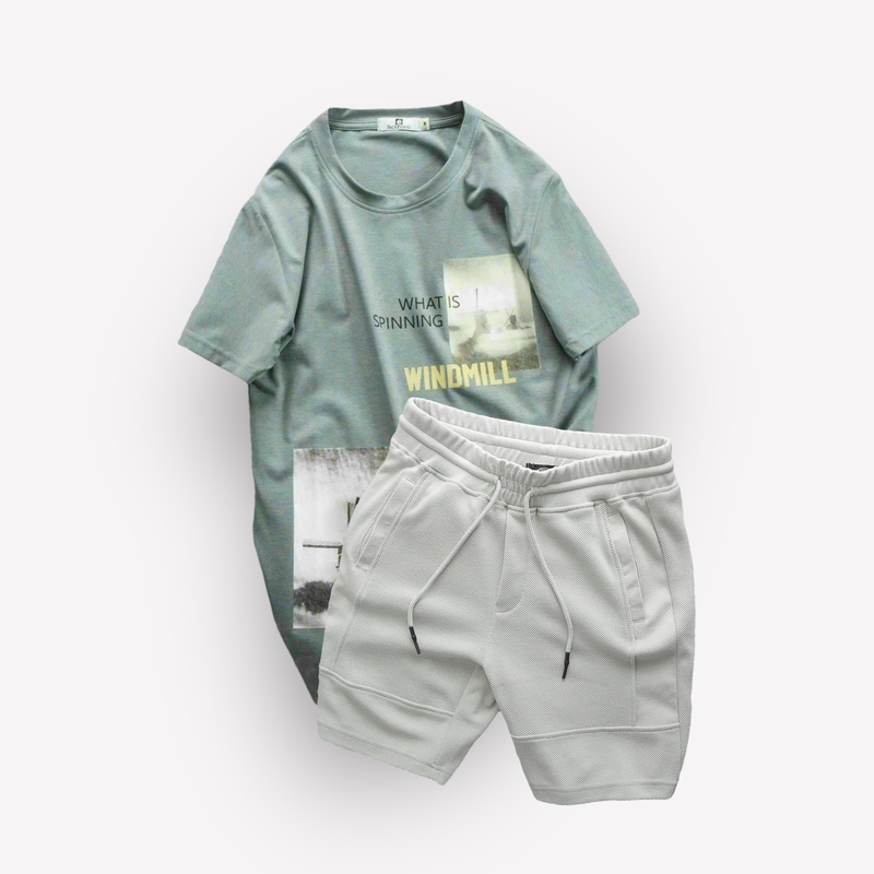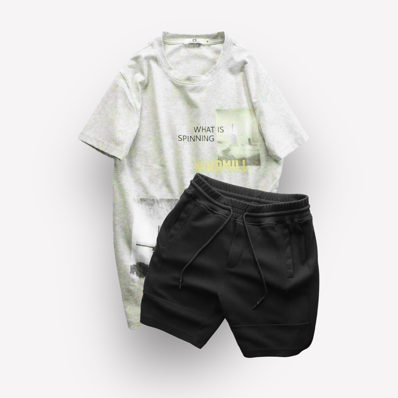 Set Bộ Nam Quần Short Thun Viền Sọc Phối Áo Cổ Tròn In Hình