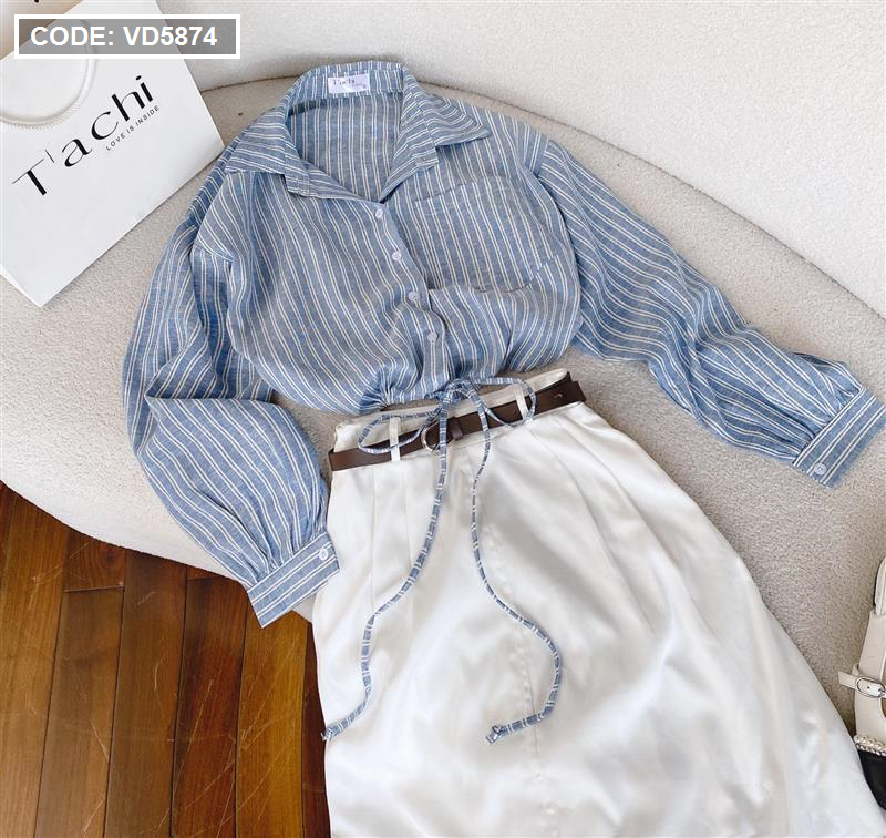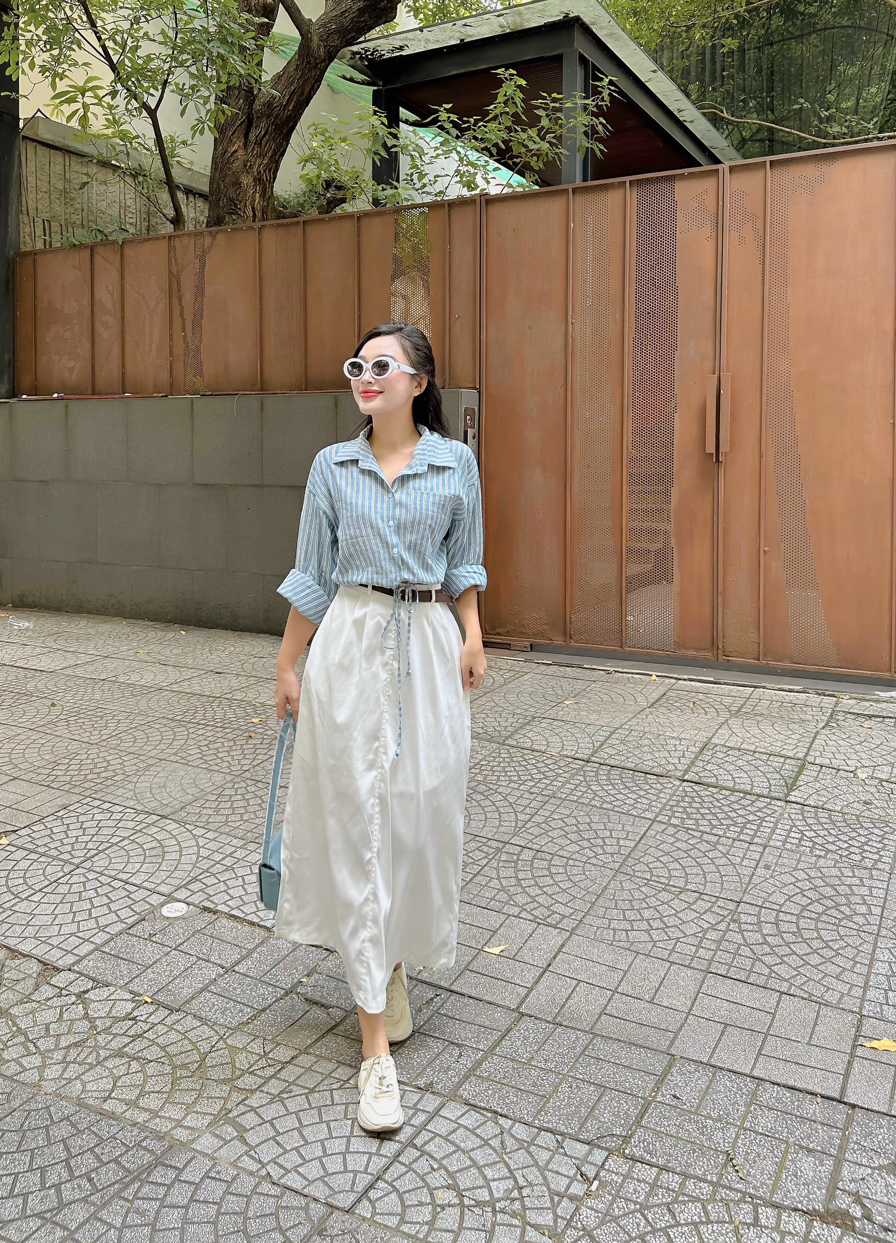 Sét sơ mi kẻ xanh + chân váy kaki midi trắng kèm nịt