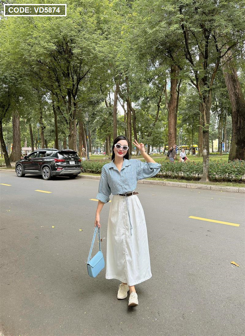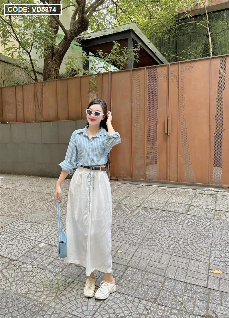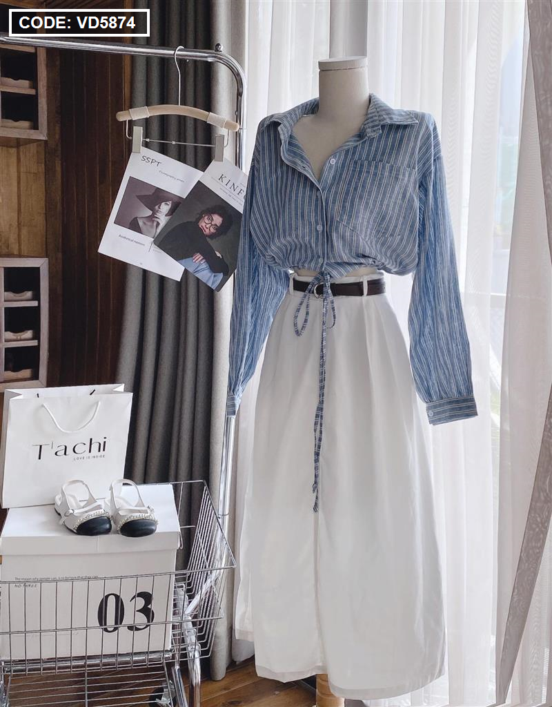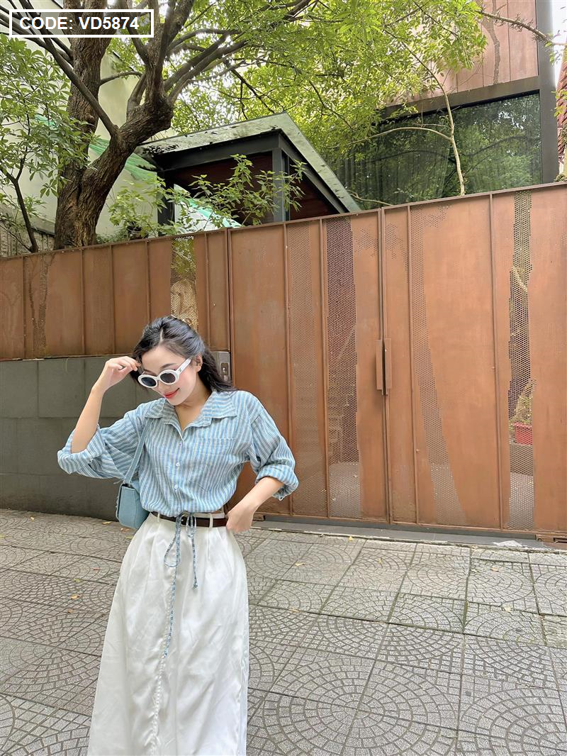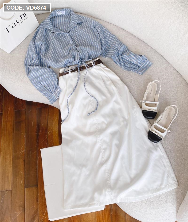 Kho sỉ sét sơ mi kẻ xanh + chân váy kaki midi trắng kèm nịt
