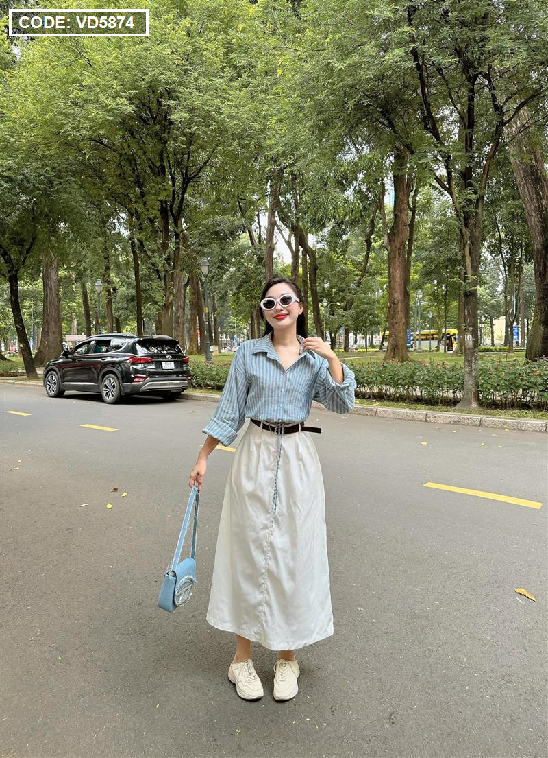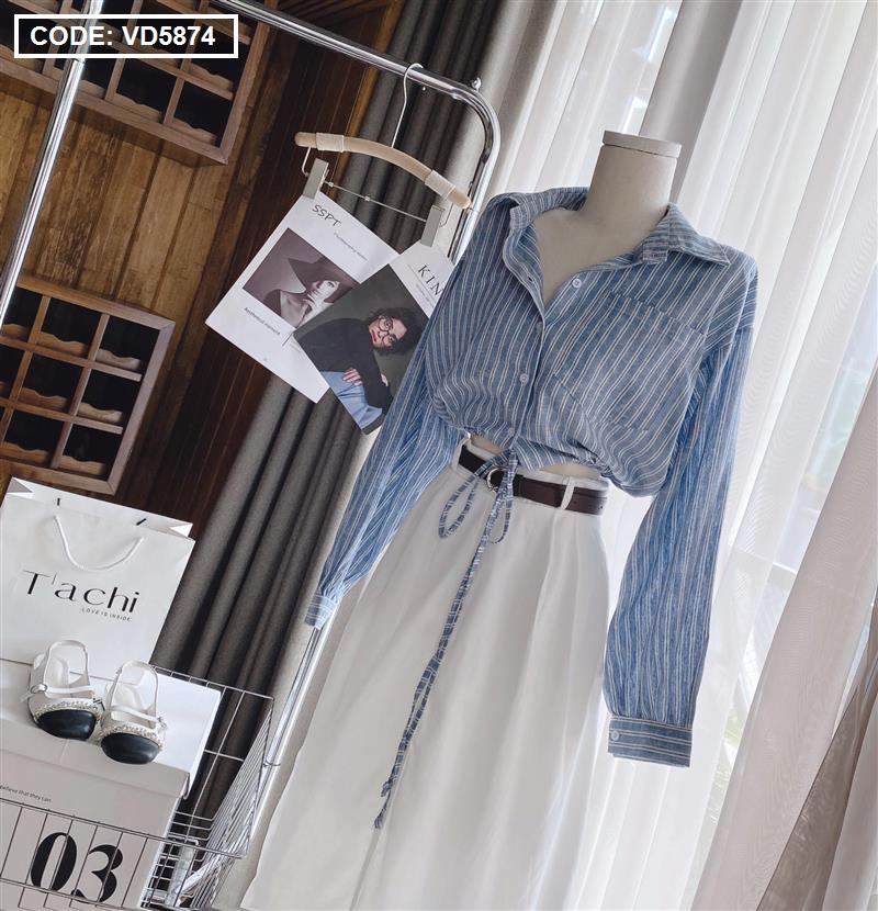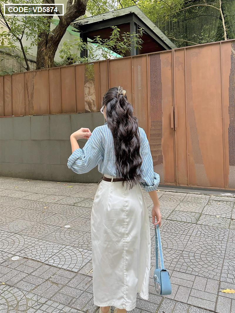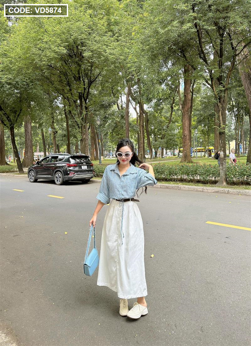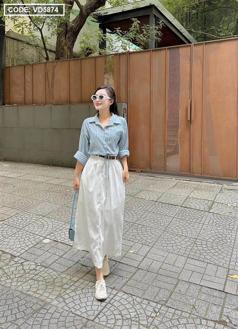 Kho sỉ sét sơ mi kẻ xanh + chân váy kaki midi trắng kèm nịt