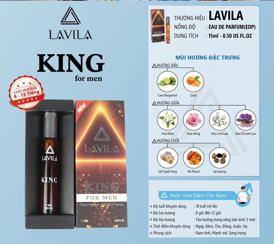 Nếu bạn là tín đồ nước hoa yêu thích phong cách “Nam Tính – Mạnh Mẽ – Cá Tính” thì chai nước hoa King For Men đến từ thương hiệu LAVILA là một sự lựa chọn tuyệt vời dành cho bạn đấy.