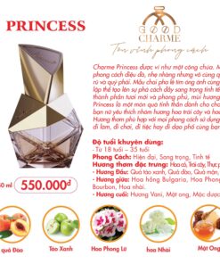 Charme Princess là dòng nước hoa mới của Charme mang phong cách điệu đà, nhẹ nhàng nhưng vô cùng quyến rũ và quý phái được ví như một công chúa , với thành phần tươi mới và phong phú của nó với mẫu chai tím pha lê ống ánh cùng khối lập thể tạo lên sự phá cách sang trọng tinh tế của sản phẩm. Mùi hương của Princess là một món quà tinh thần dành cho cho các bạn nữ yêu thích nhóm hương hoa trái cây và hoa cỏ.