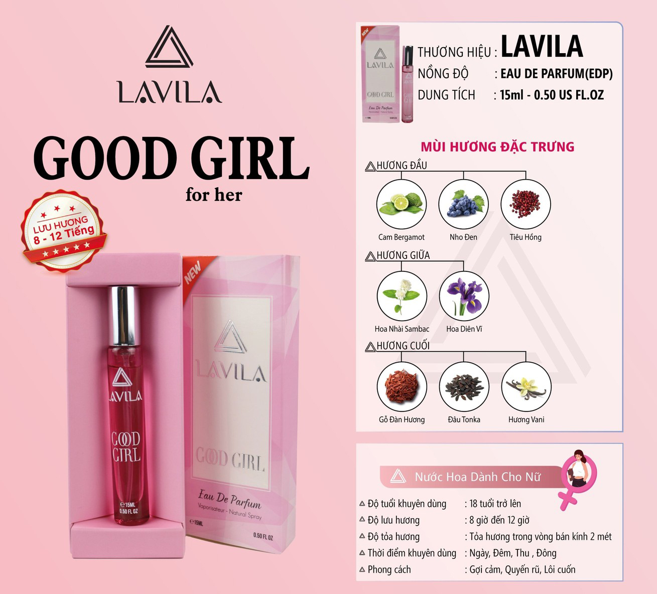 Nếu bạn là tín đồ nước hoa yêu thích phong cách “Gợi Cảm – Quyến Rũ – Lôi Cuốn” thì chai nước hoa Good Girl đến từ thương hiệu LAVILA là một sự lựa chọn tuyệt vời dành cho bạn đấy.