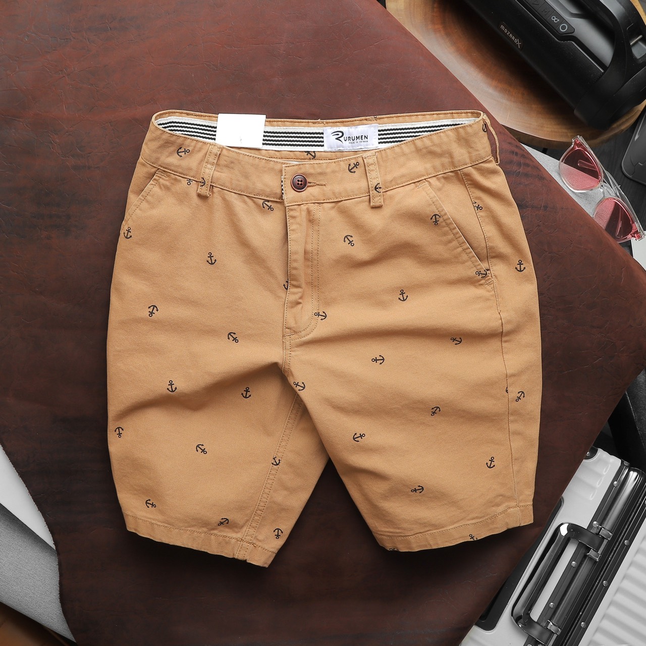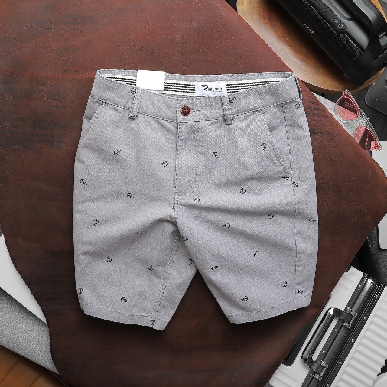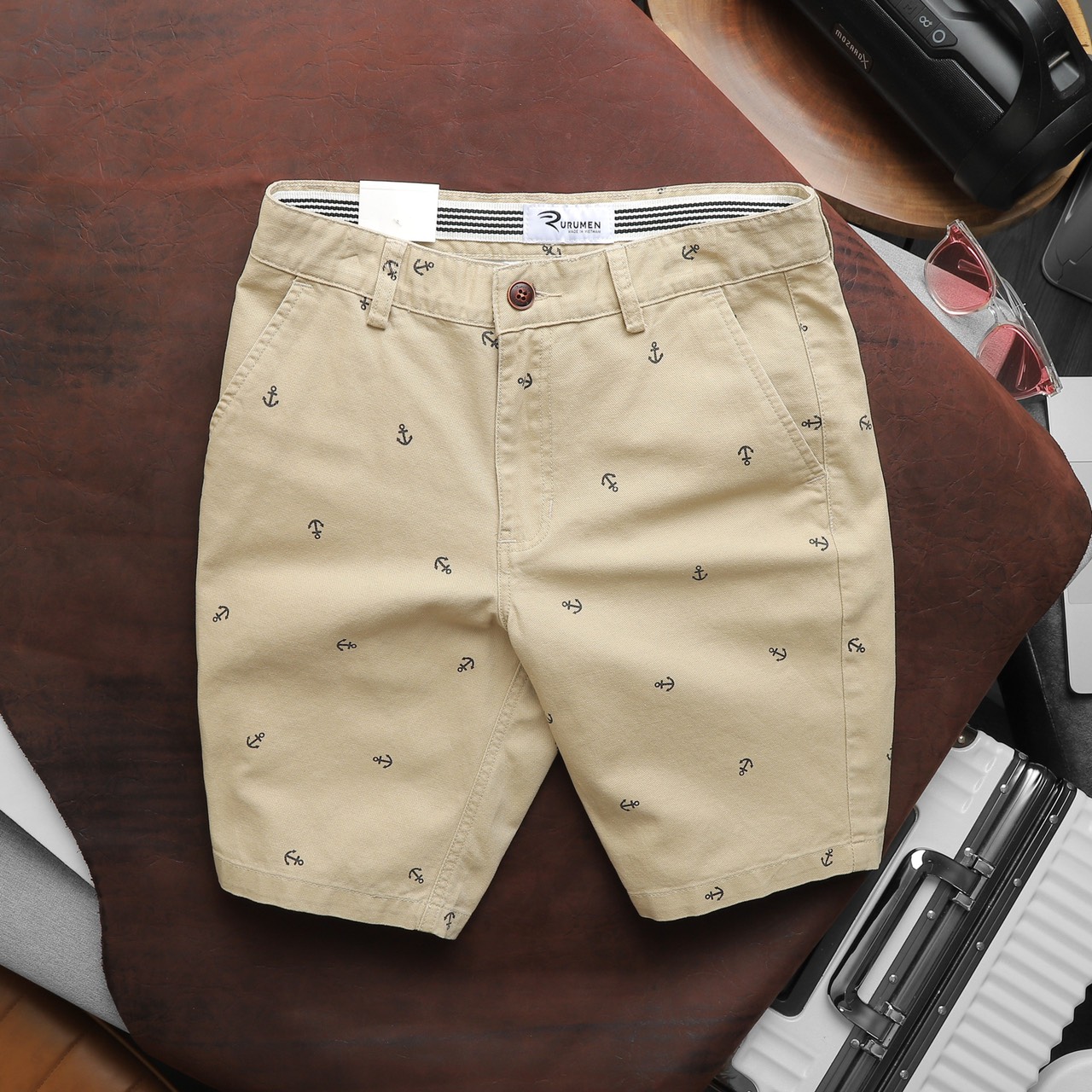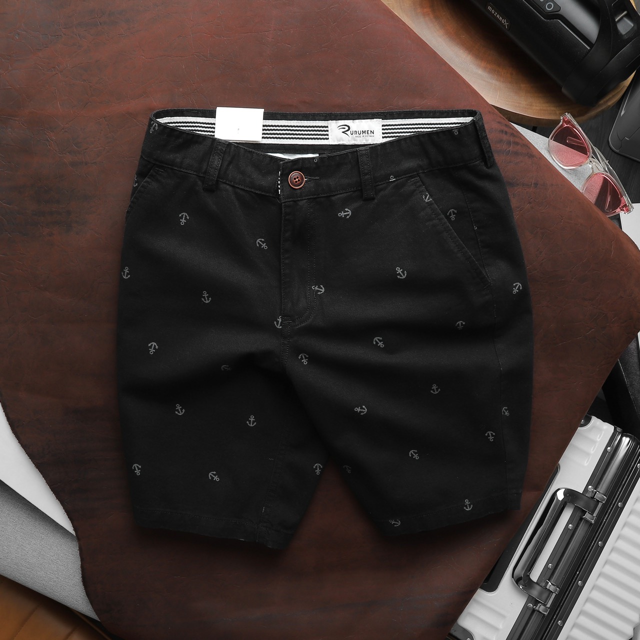 Rurumen cho ra mẫu quần short kaki nam với thiết kế đơn giản, họa tiết mỏ neo nhỏ nhắn – tạo điểm nhấn cực tinh tế.