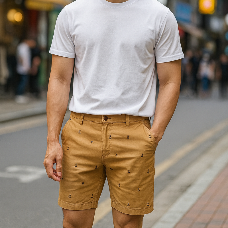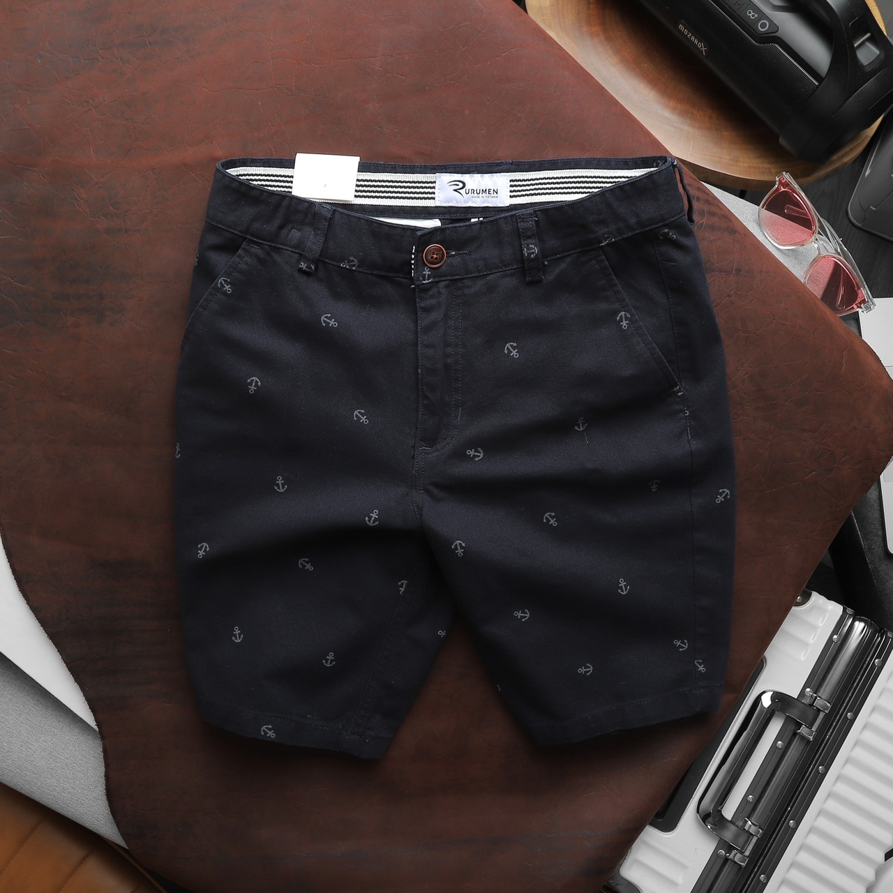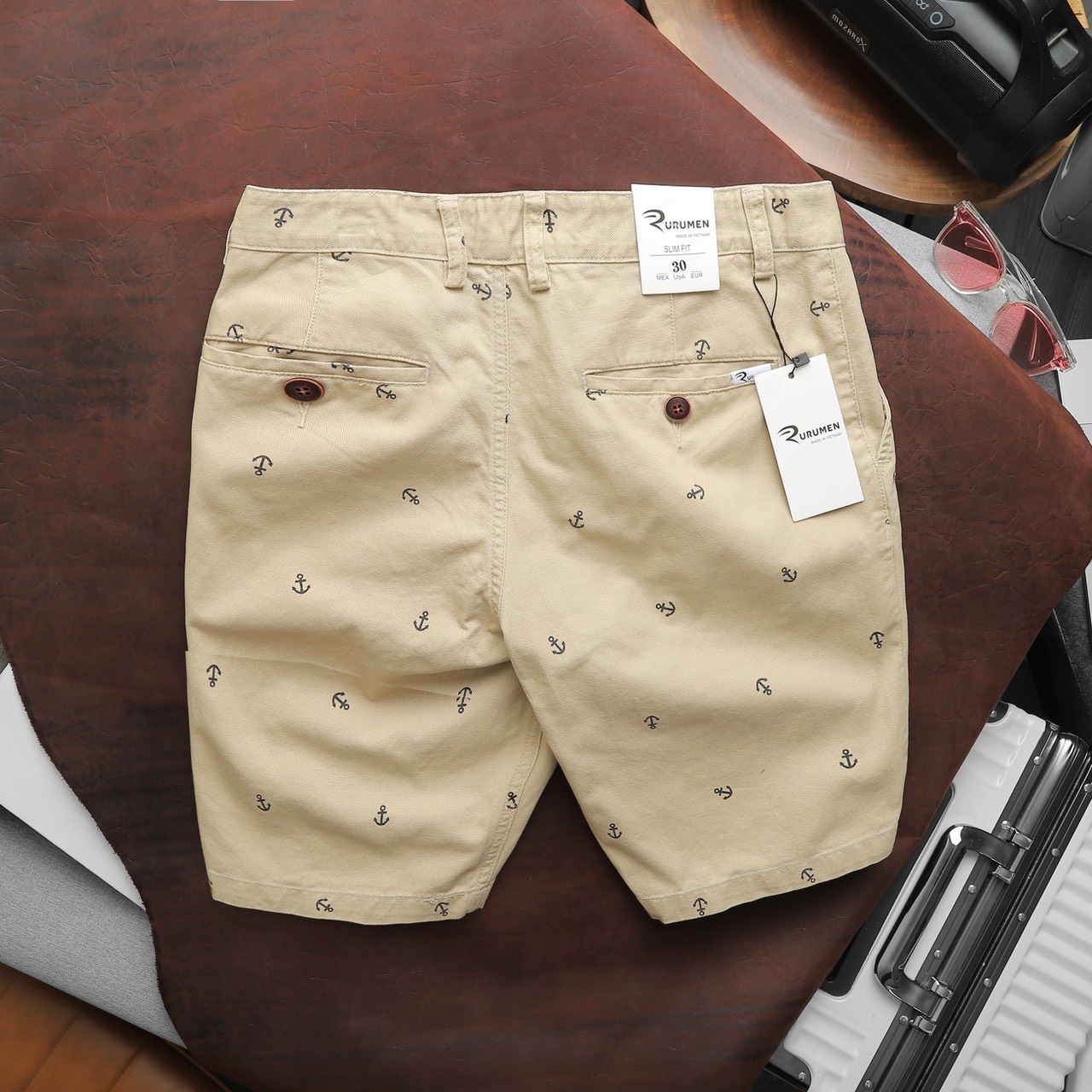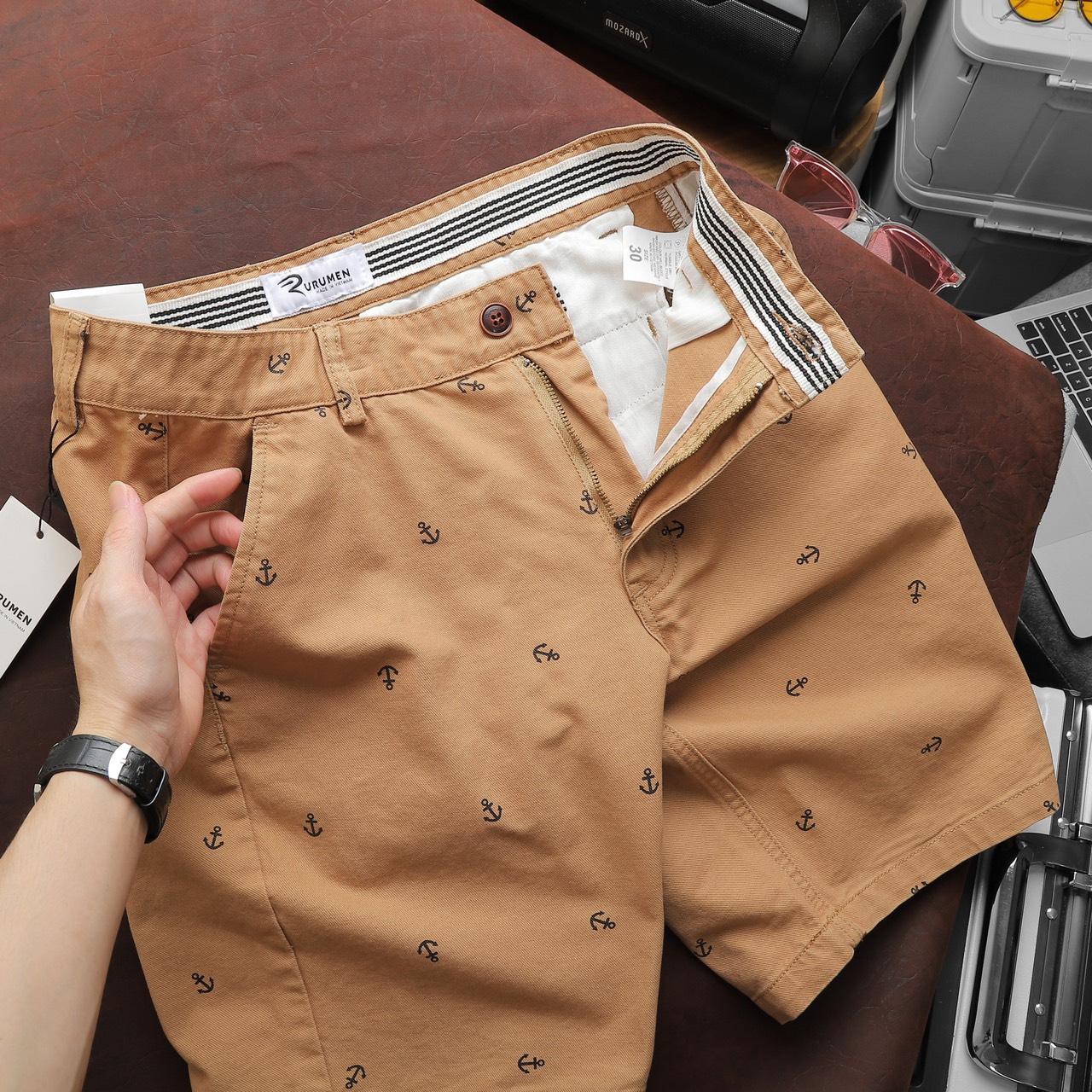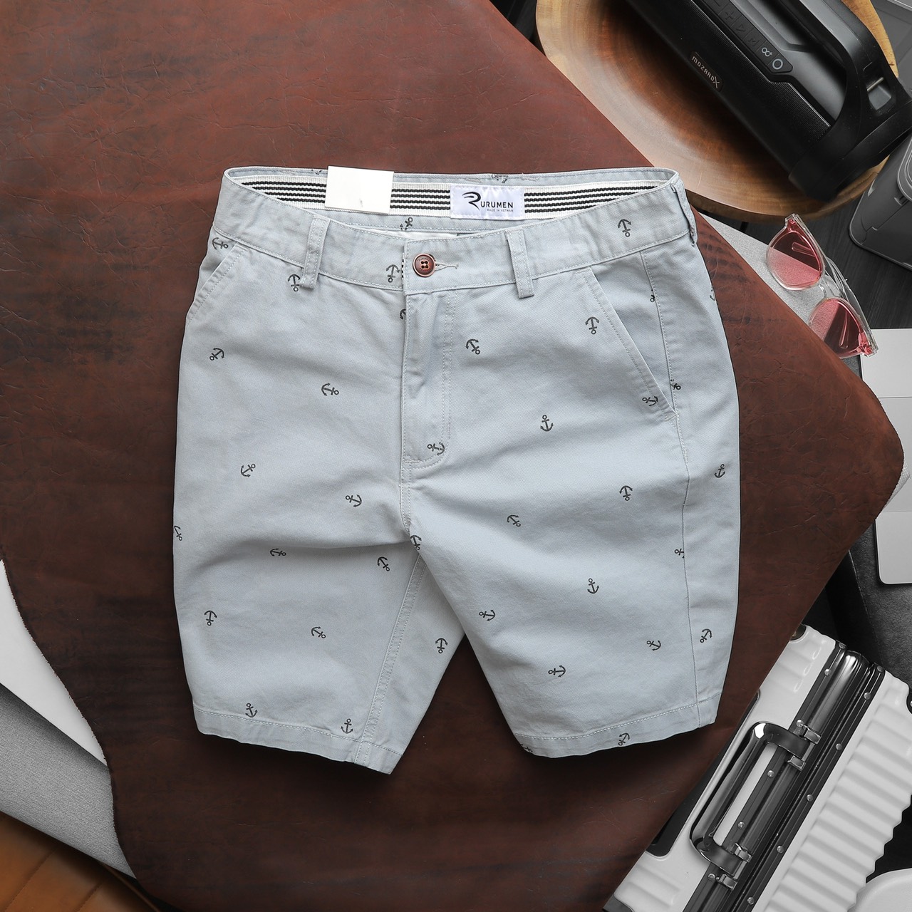 Rurumen cho ra mẫu quần short kaki nam với thiết kế đơn giản, họa tiết mỏ neo nhỏ nhắn – tạo điểm nhấn cực tinh tế.