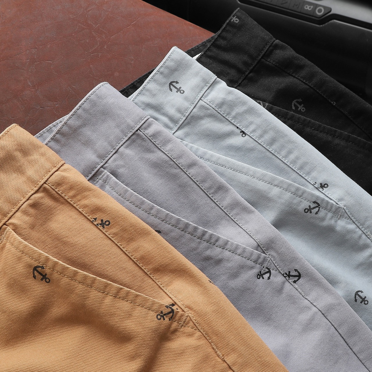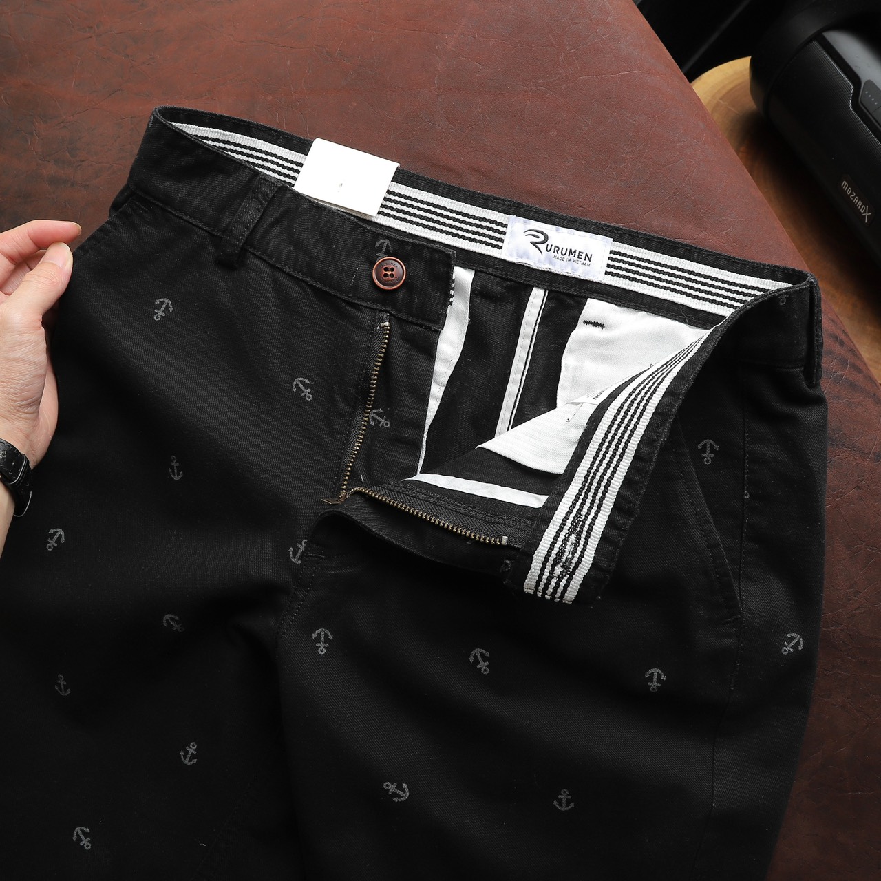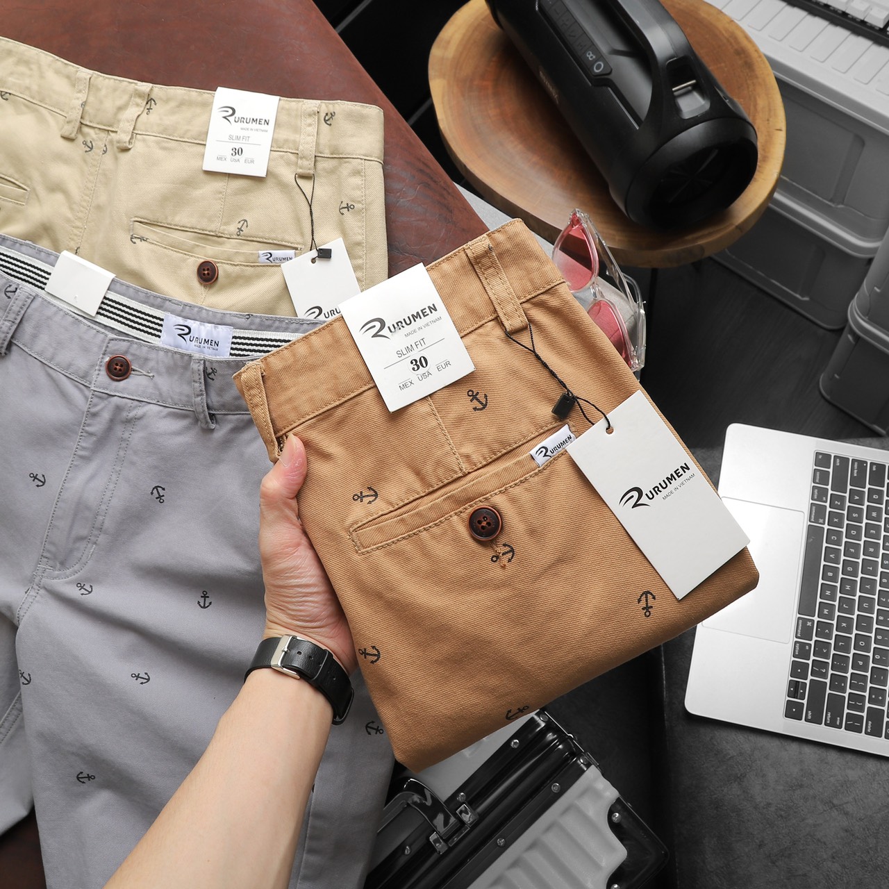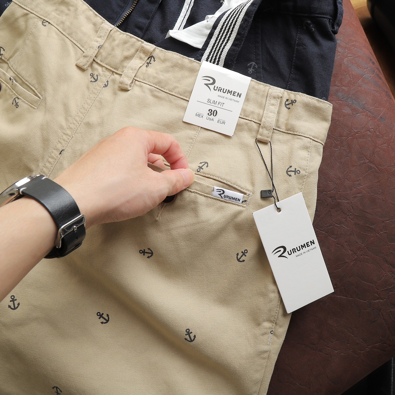 Rurumen cho ra mẫu quần short kaki nam với thiết kế đơn giản, họa tiết mỏ neo nhỏ nhắn – tạo điểm nhấn cực tinh tế.