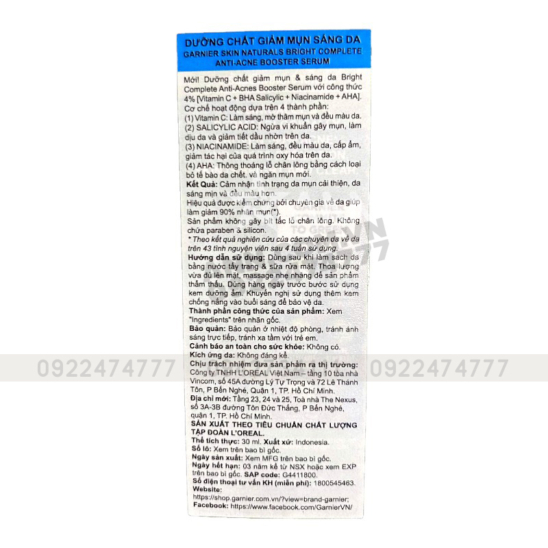 Serum Garnier Giảm Mụn Sáng Da Skin Naturals Bright Complete Anti-Acne Booster Serum 30ml