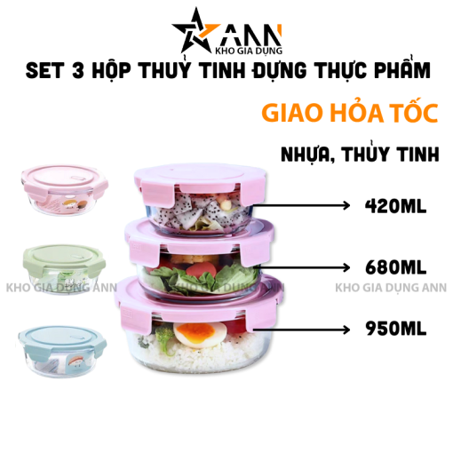 Set 3 Hộp Đựng Thực Phẩm – Hộp Thuỷ Tinh Tròn 420 – 680 – 950ml