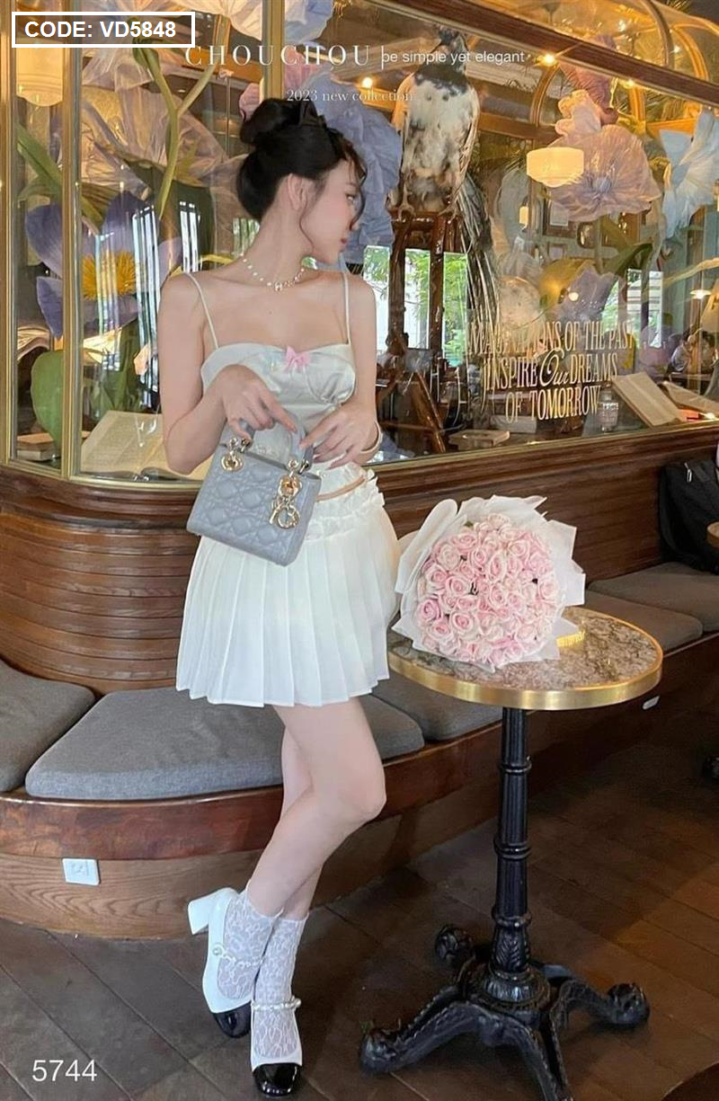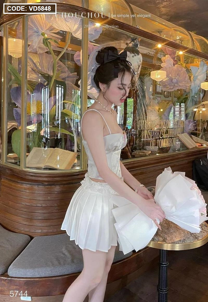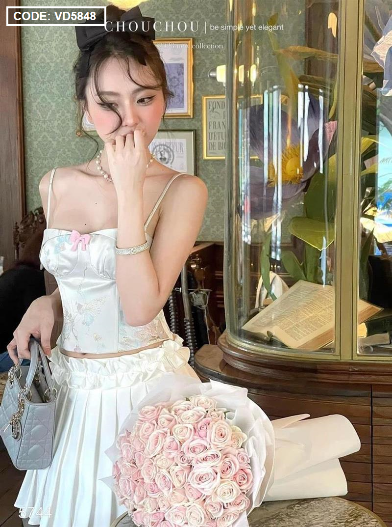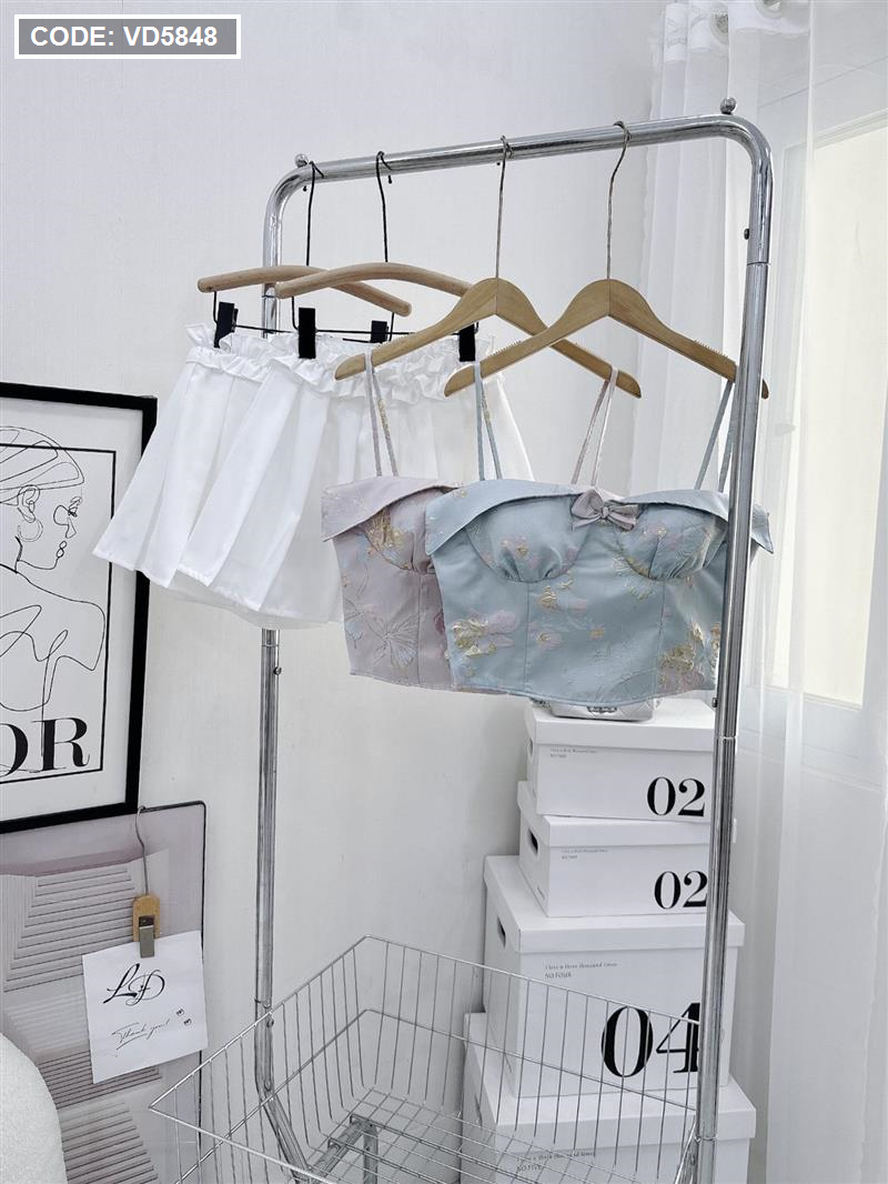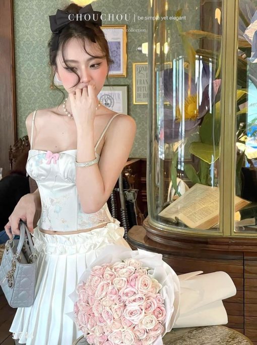 Hãy là người đầu tiên nhận xét “Sét áo gấm hoạ 2 dây cúp nhún nơ ngực + chân váy xếp ly” Hủy