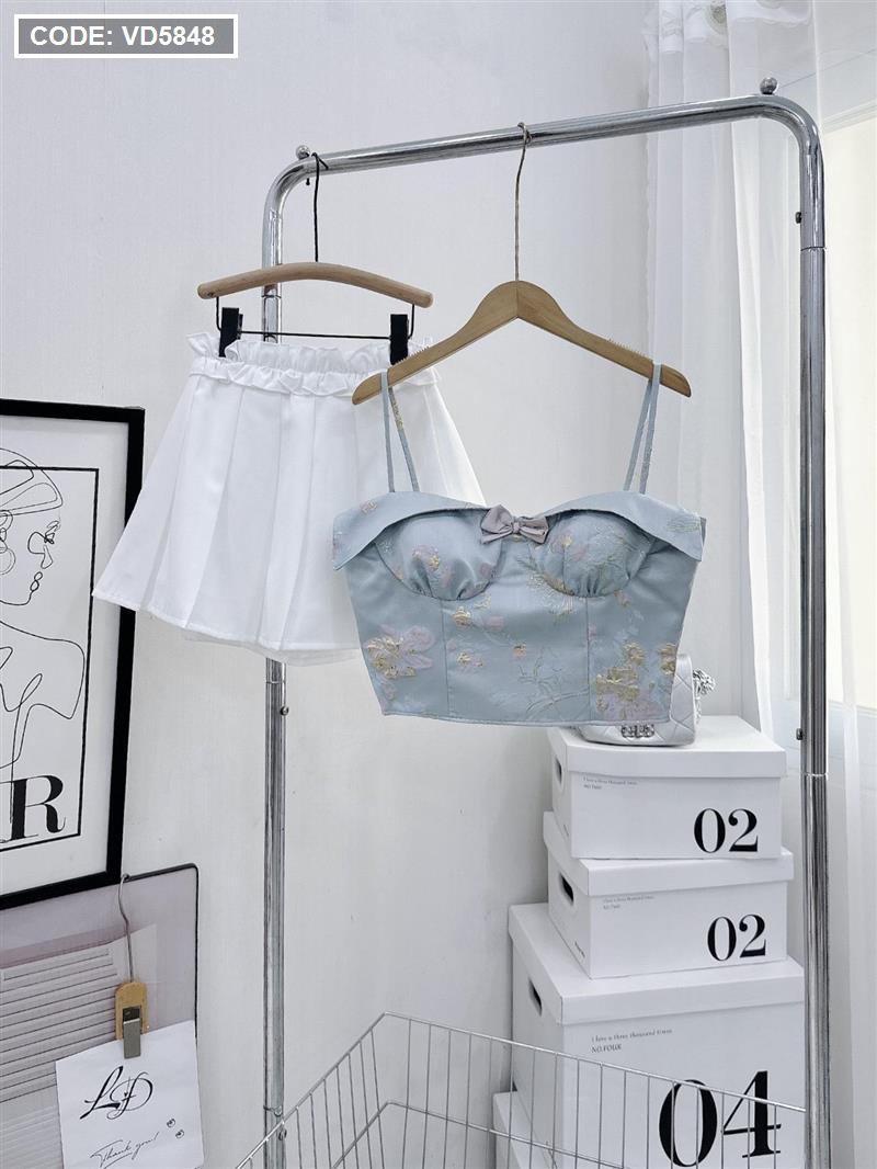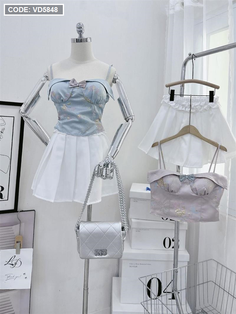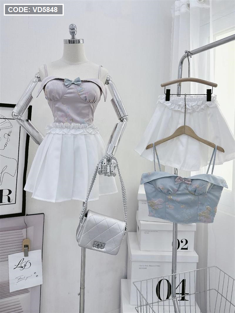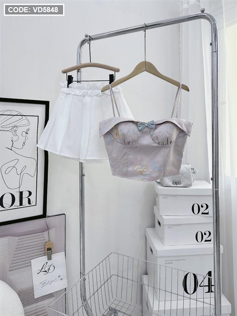 Sét áo gấm hoạ 2 dây cúp nhún nơ ngực + chân váy xếp ly