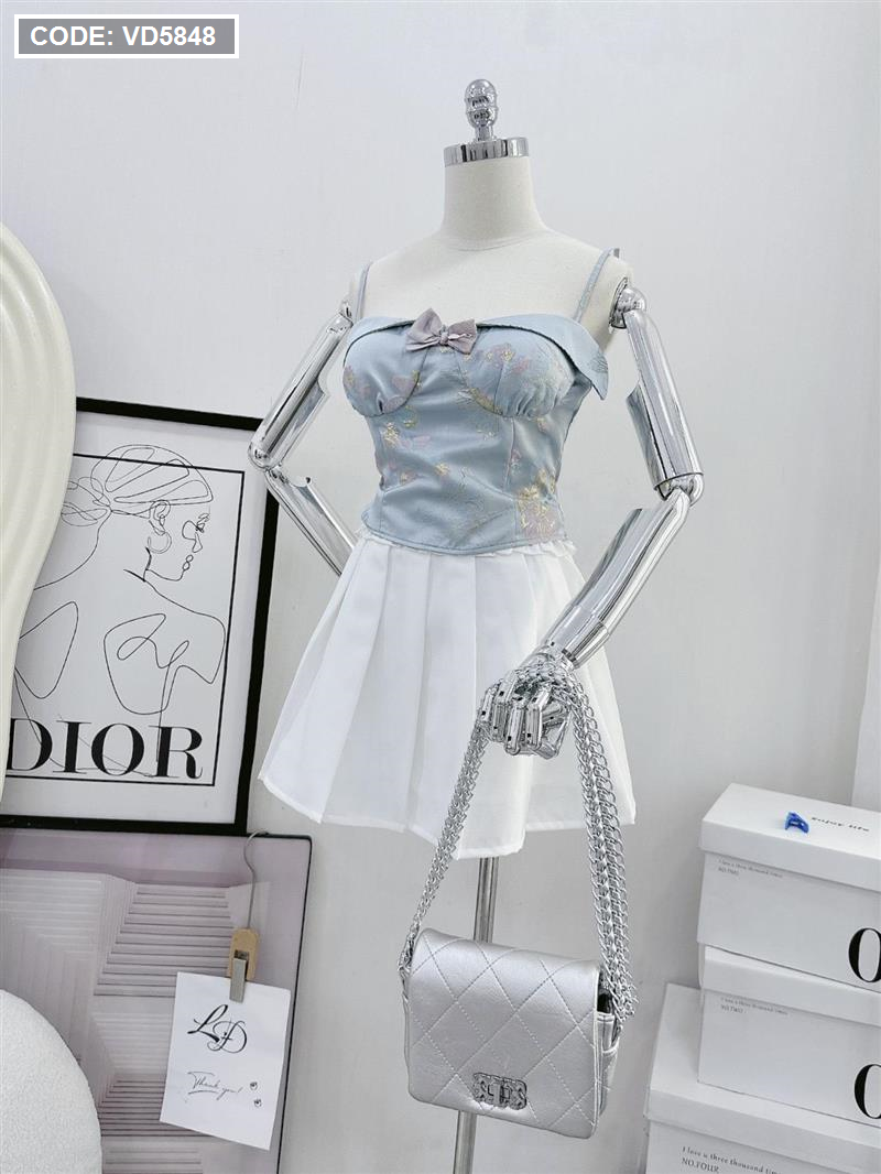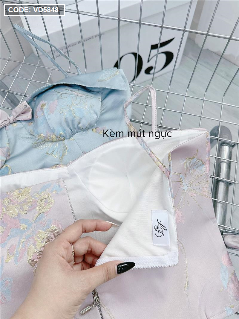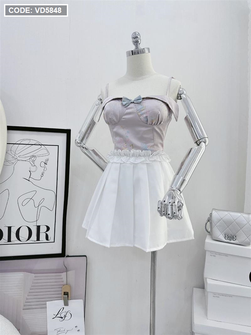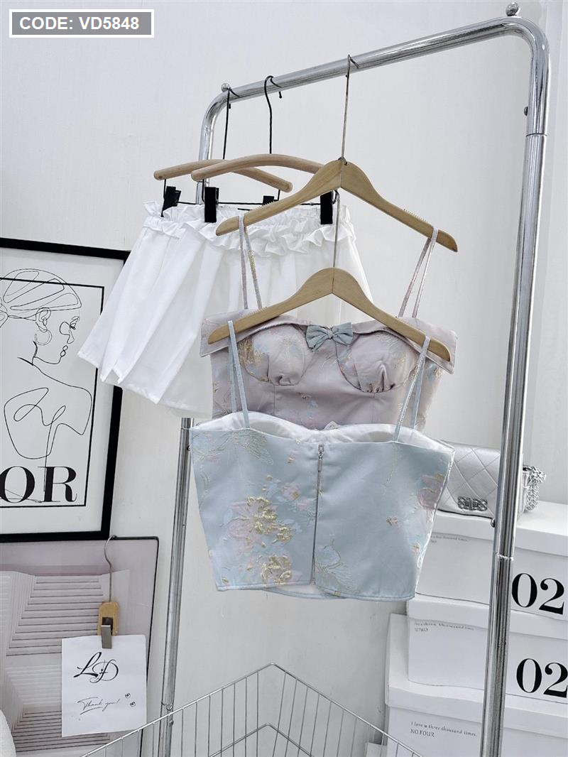 Sét áo gấm hoạ 2 dây cúp nhún nơ ngực + chân váy xếp ly