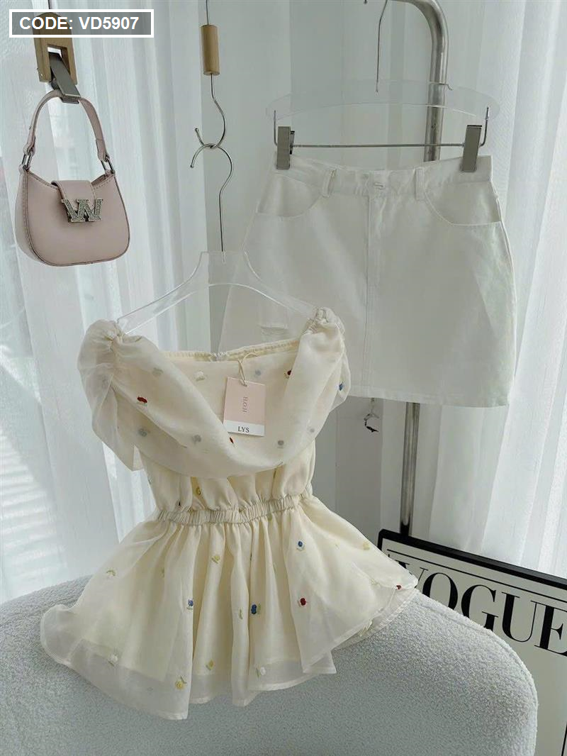 Sét áo hoa trễ vai xếp bo eo + chân váy trắng